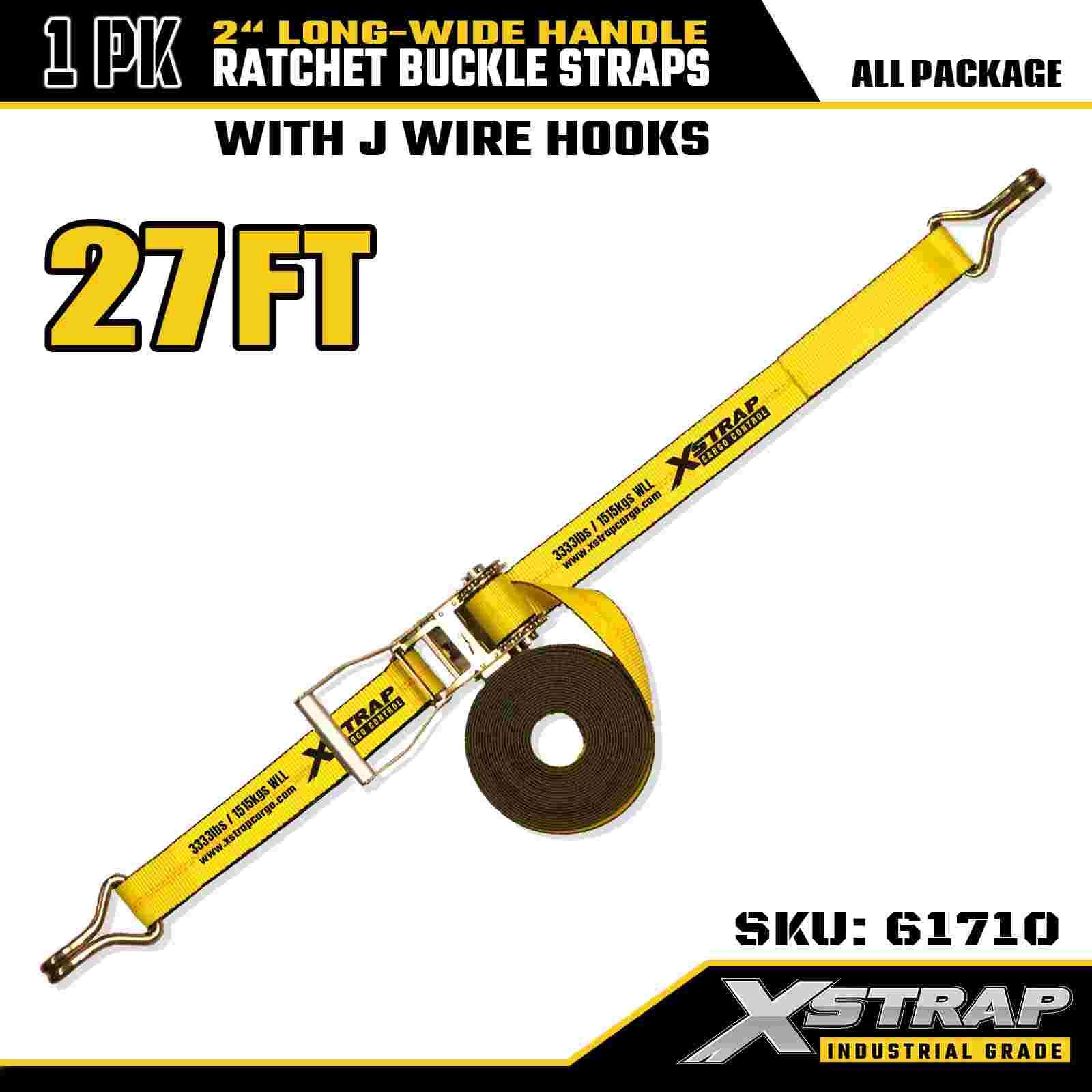 tali x 61710 Ratchet Tie Down Premium 2" x 27 kaki (1 Paket) Kekuatan Patah 10.000 LBS Tali Kargo Kait J Ganda Sempurna untuk Peralatan Pindahan, Peralatan Rumput, dan Sepeda Motor