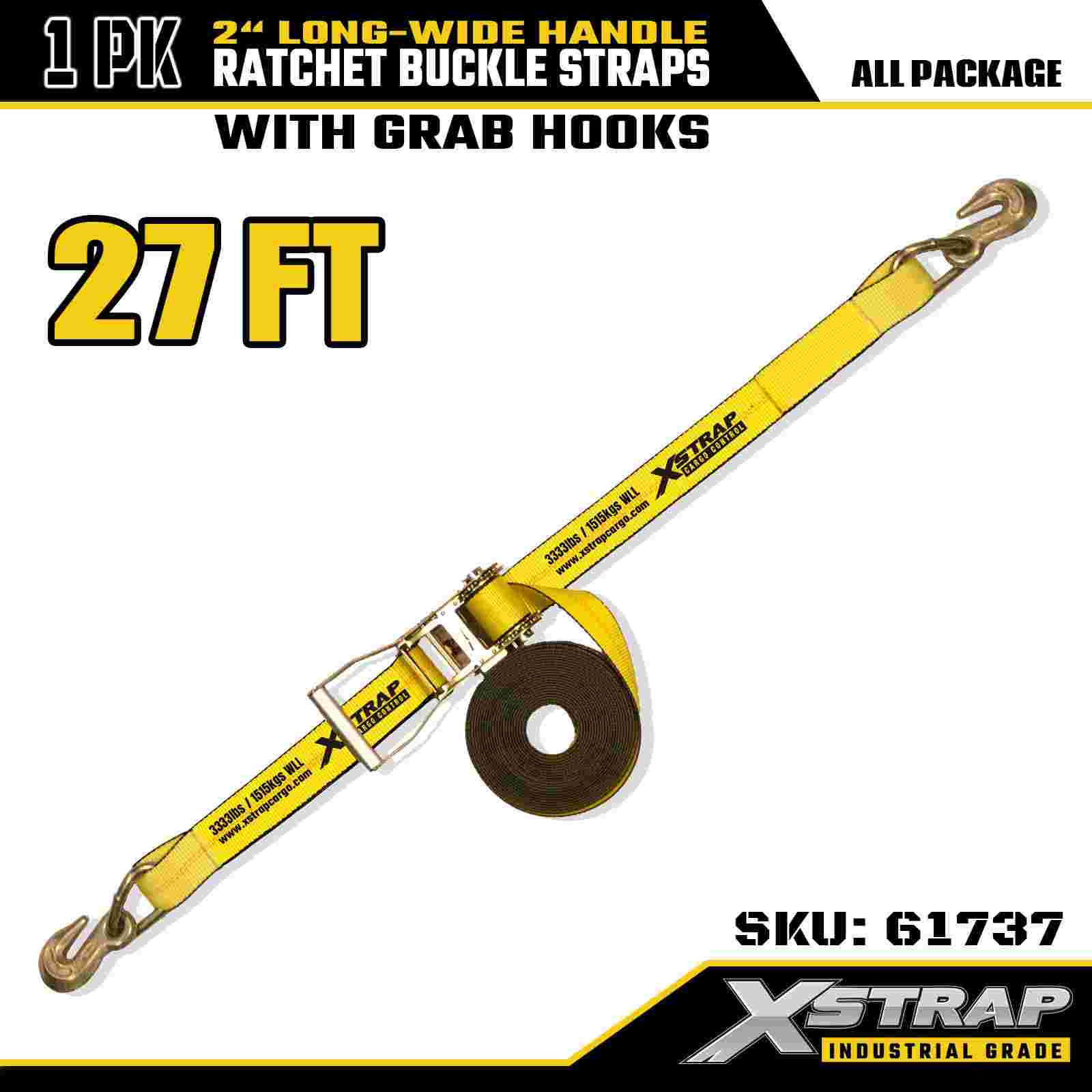 Xstrap 61737 Tugas Berat 2" x 27' 1PK Ratchet Strap dengan Ambil Kait Kuning, WLL 3,333 lbs, Tali Ratchet Tie Down Gagang Lebar Panjang untuk Mesin & Peralatan