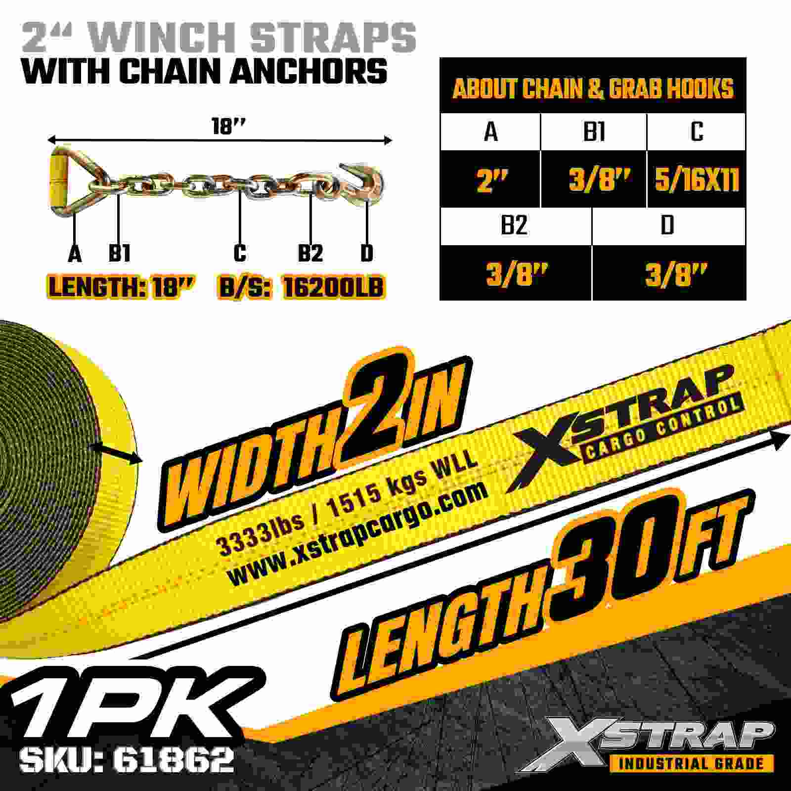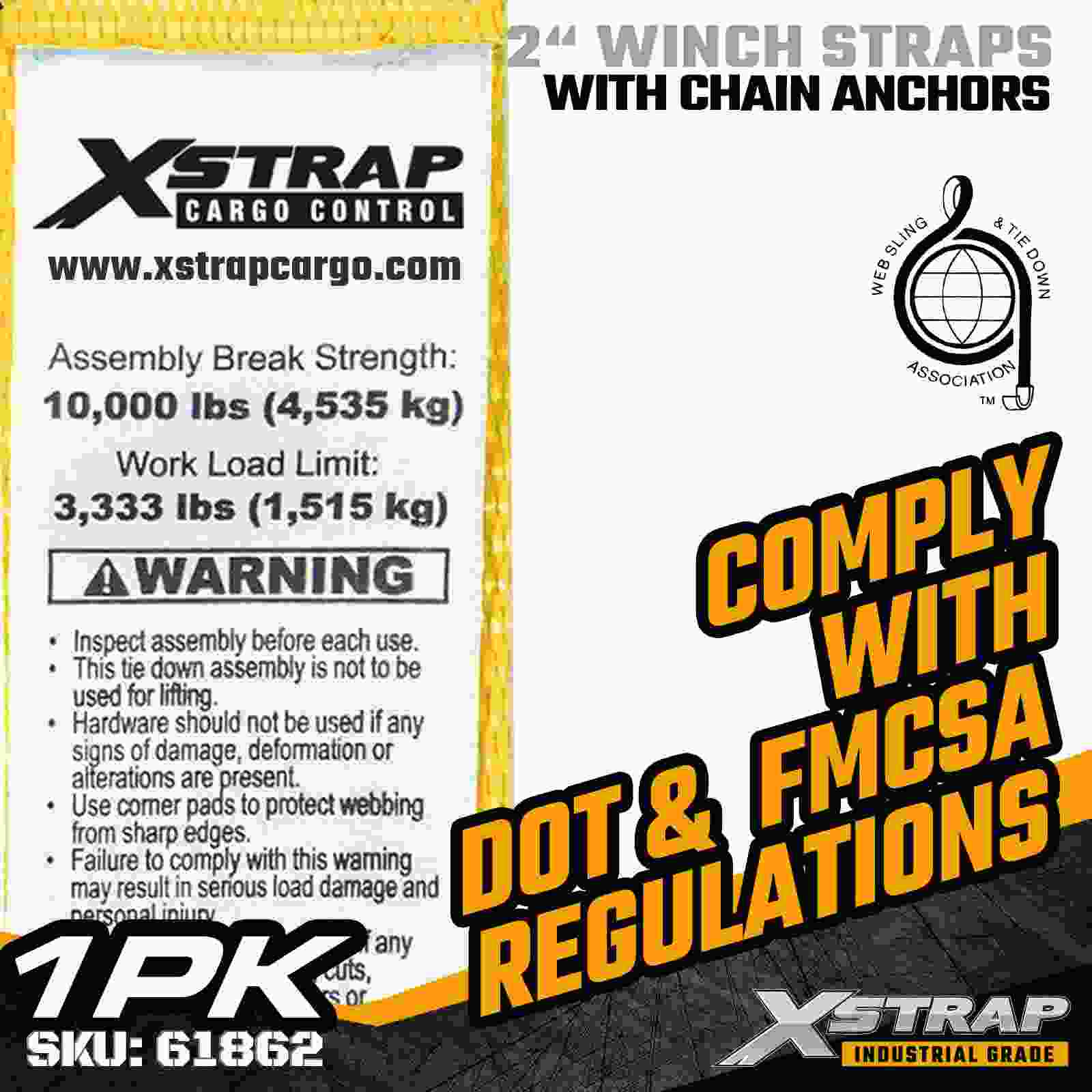 Tali Winch Standar Xstrap 61862 2" × 30 kaki dibuat untuk pengamanan kargo flatbed yang andal, dilengkapi Jangkar Rantai yang tahan lama dan anyaman poliester berkekuatan tinggi. Dengan Batas Beban Kerja 3,333 lbs dan Kekuatan Patah 10,000 lbs, tali ini memberikan kinerja yang dapat diandalkan untuk pengangkutan barang harian, muatan palet, kayu, pipa, dan aplikasi logistik umum.