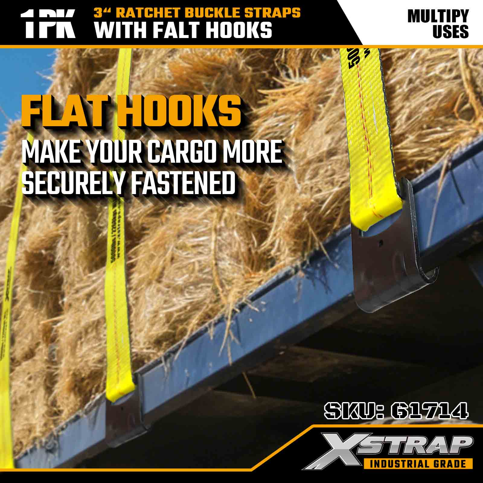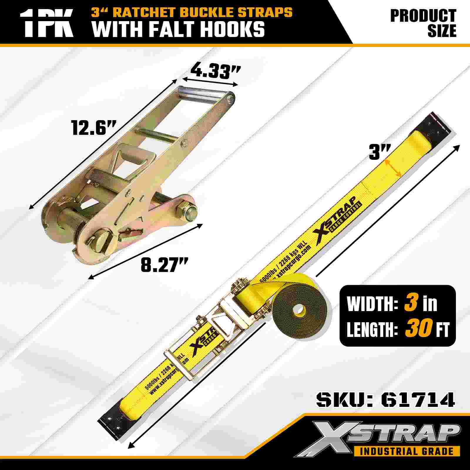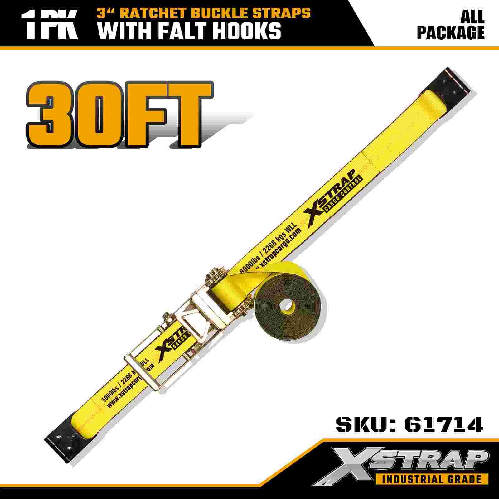 Xstrap 61714 3" x 30ft Gesper Ratchet Straps (1-Paket) – Kait Datar, Kapasitas Beban 5,000 lbs, Kekuatan Patah 15,000 lbs, Pengikat Tugas Berat untuk Truk, Trailer, dan Transportasi Kargo Industri.