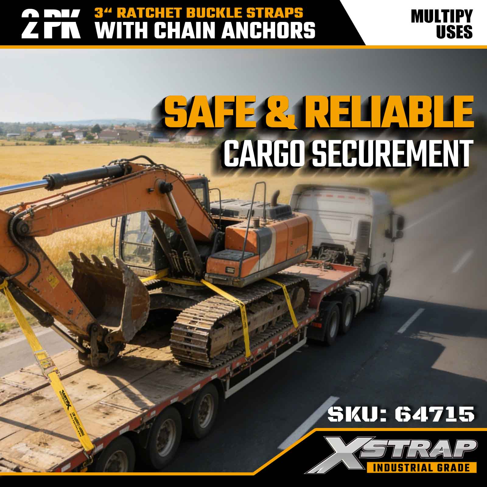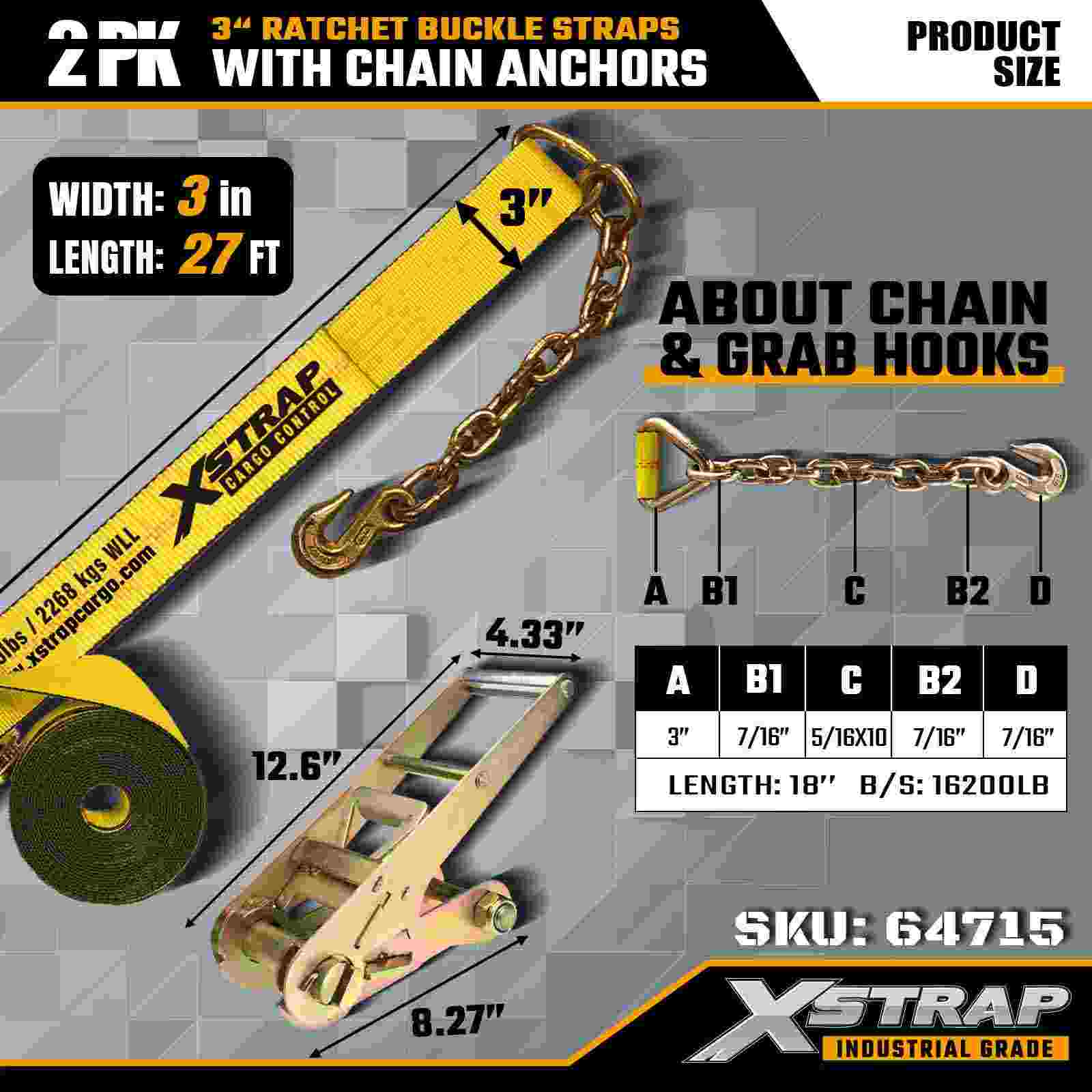 Xstrap 64715 Tali Gesper Ratchet 3" × 27 kaki (2 Paket) – dilengkapi dengan Jangkar Rantai tugas berat, dirancang untuk lingkungan kargo yang menantang. Dengan Batas Beban Kerja 5.000 lbs dan Kekuatan Patah 15.000 lbs, strap ini memberikan kinerja pengikatan yang aman, stabil, dan tingkat profesional untuk flatbed, pengangkutan mesin, dan pengangkutan industri.