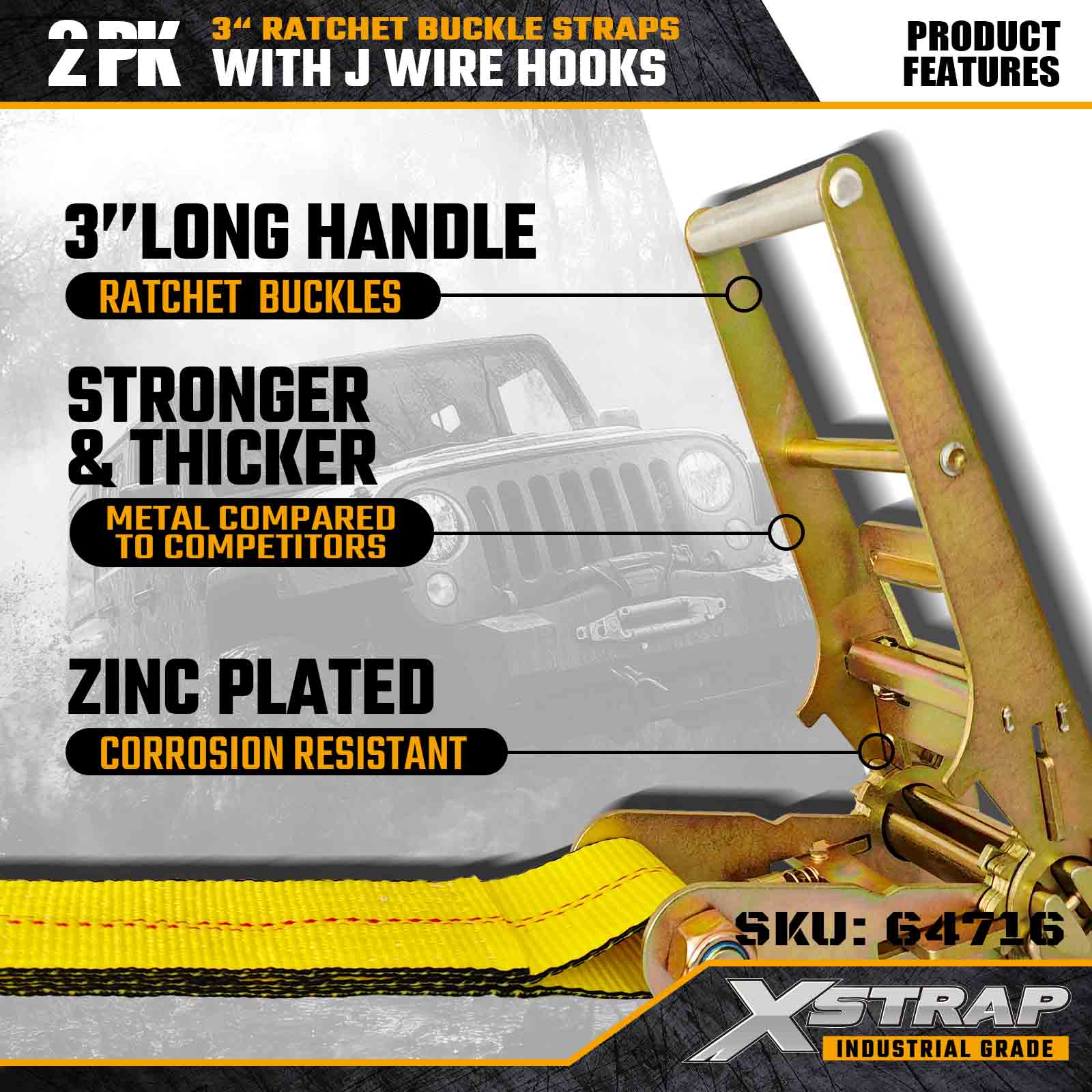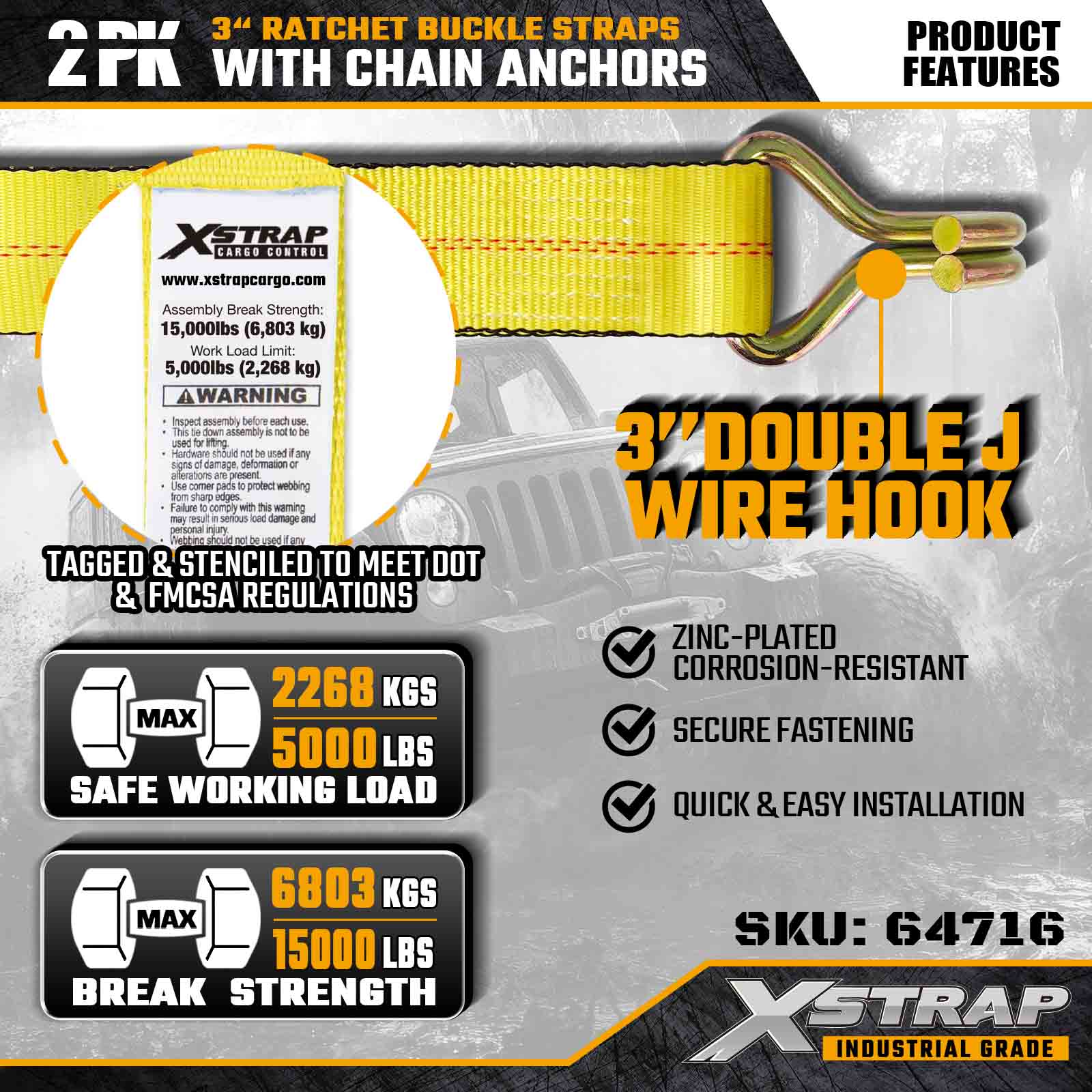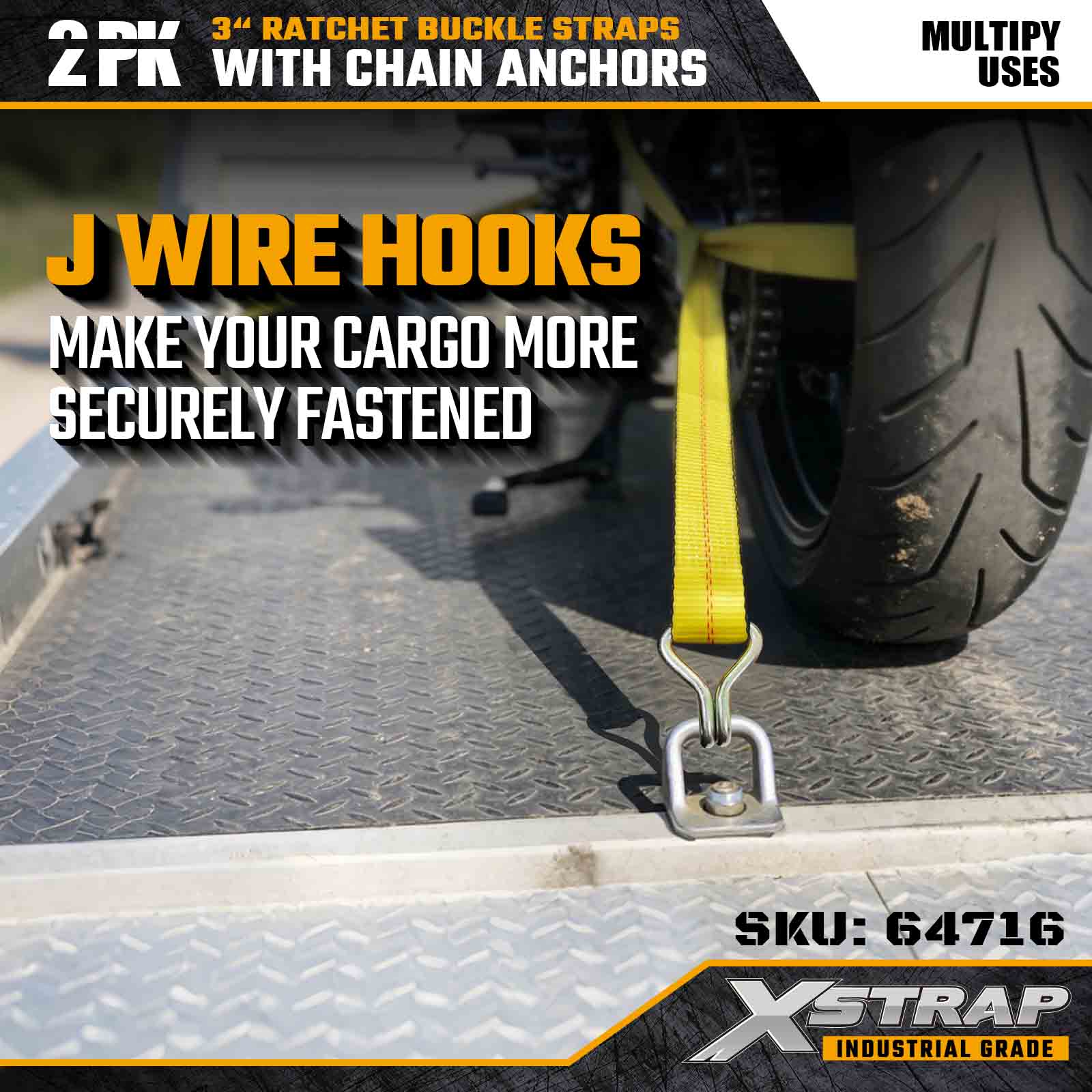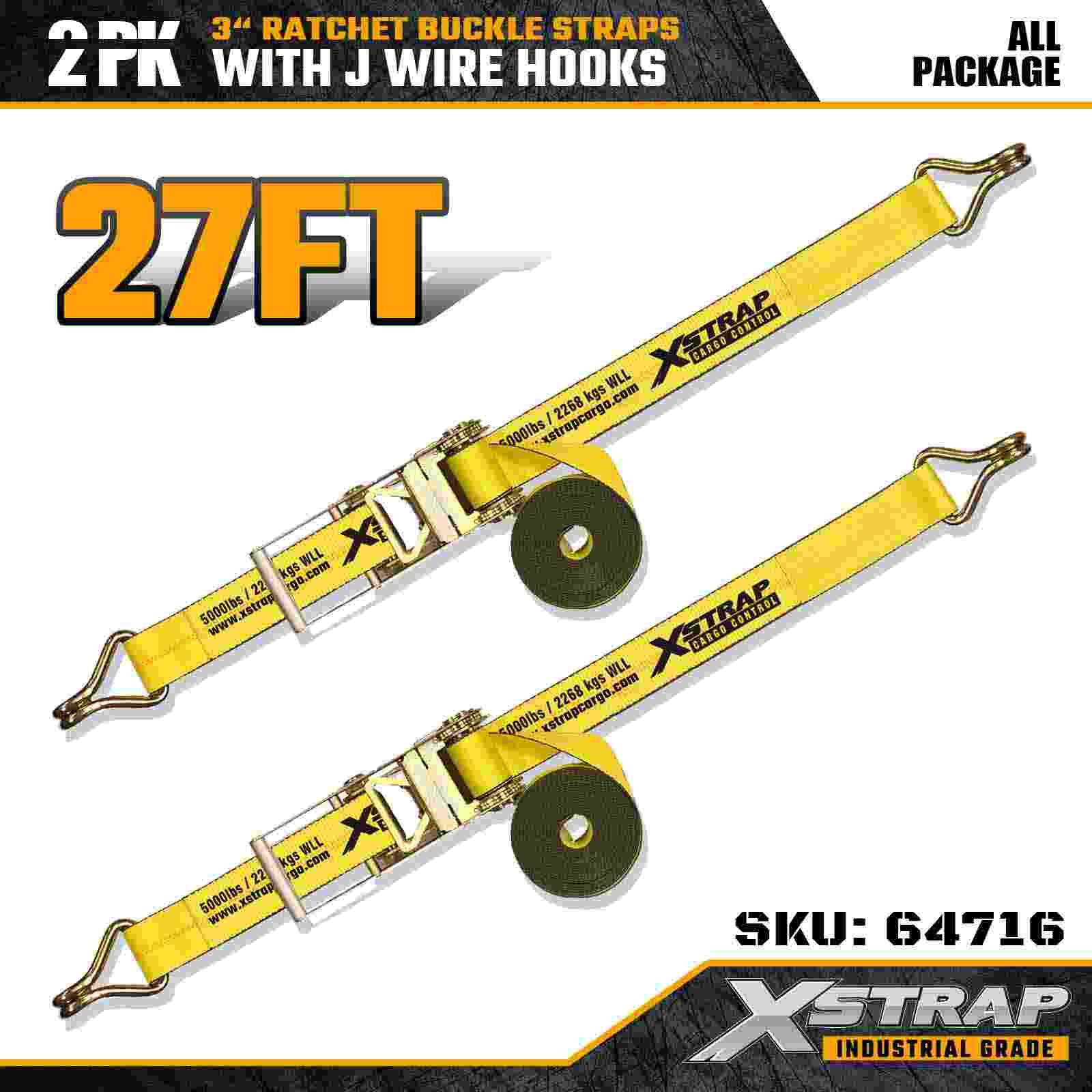 Xstrap 64716 3" × 27 kaki Gesper Ratchet Straps (2-Paket) dirancang untuk pengamanan kargo profesional, dilengkapi Kait Kawat berkekuatan tinggi dan mekanisme ratchet yang tahan lama. Dengan Batas Beban Kerja 5.000 lbs dan Kekuatan Putus 15.000 lbs, strap ini memberikan kinerja yang dapat diandalkan untuk flatbed, pengangkutan peralatan, dan tugas pengangkutan industri.