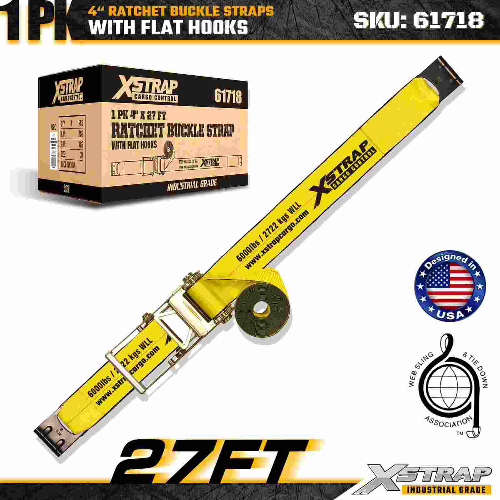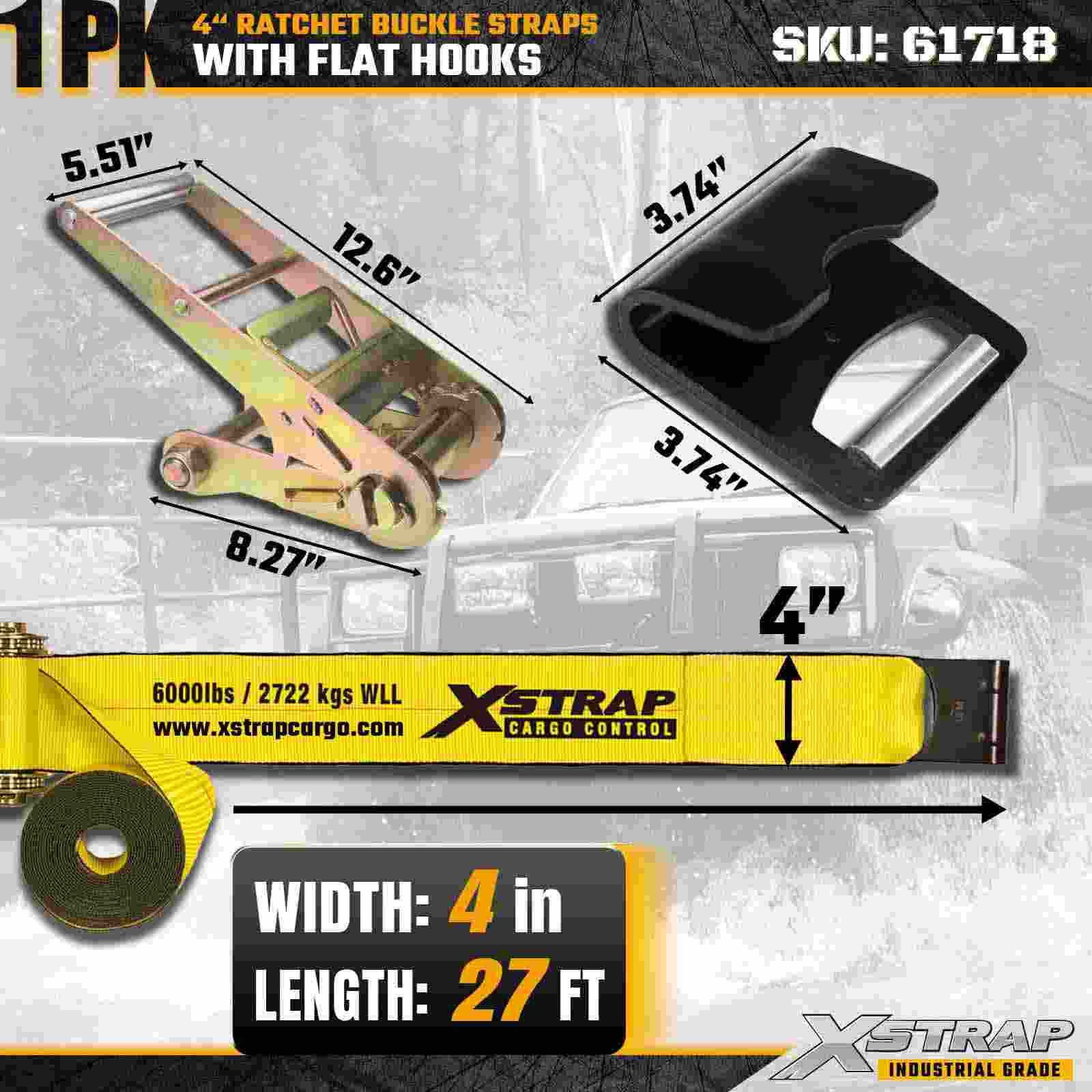 Xstrap 61718 4" × 27 kaki Gesper Ratchet Strap (1-Paket) dibuat untuk pengamanan kargo tugas ekstrim, dilengkapi Kait Datar yang diperkuat dan mekanisme ratchet tugas berat. Dengan Batas Beban Kerja 6,000 lbs dan Kekuatan Putus 18,000 lbs, tali ini dirancang untuk pengangkutan flatbed profesional, bahan konstruksi, transportasi mesin, dan logistik industri di mana kekuatan dan keandalan maksimum sangat penting.