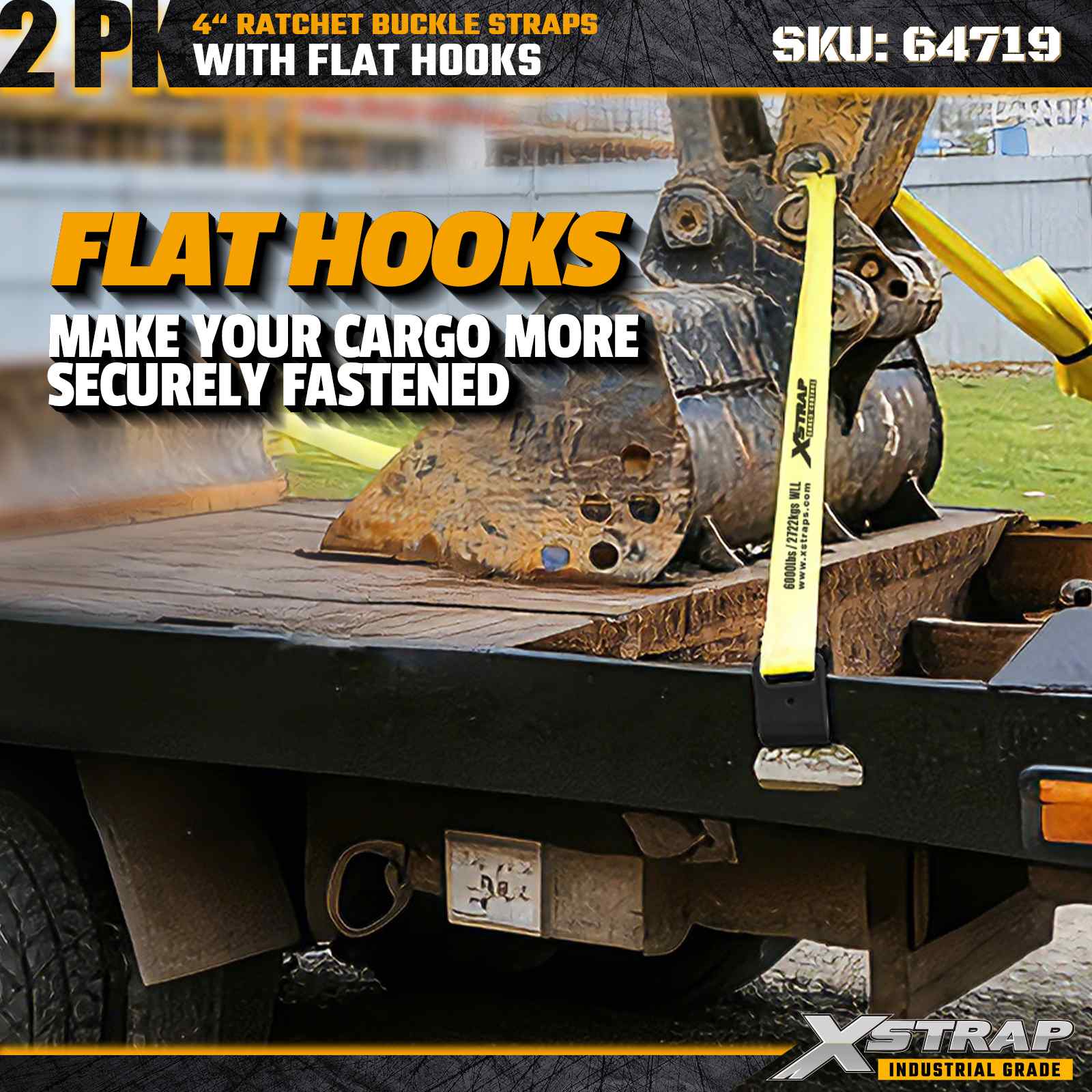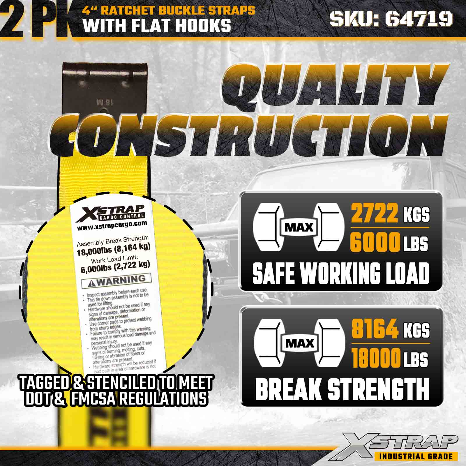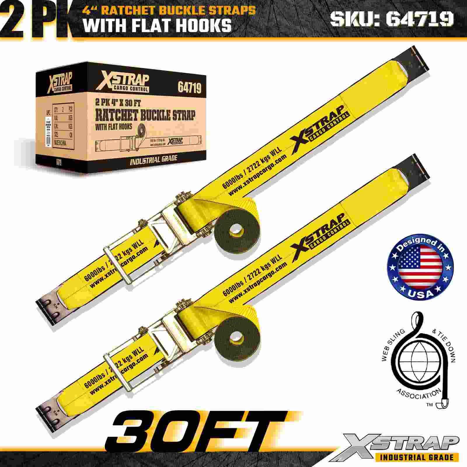 Xstrap 64719 4" × 30 kaki Gesper Ratchet Straps (2-Paket) memberikan pengamanan kargo tugas berat dengan Kait Datar yang diperkuat dan mekanisme ratchet yang tahan lama. Dengan nilai 6,000 lbs WLL dan 18,000 lbs Break Strength, tali ini ideal untuk pengangkutan flatbed, pengangkutan mesin, dan aplikasi kargo industri.
