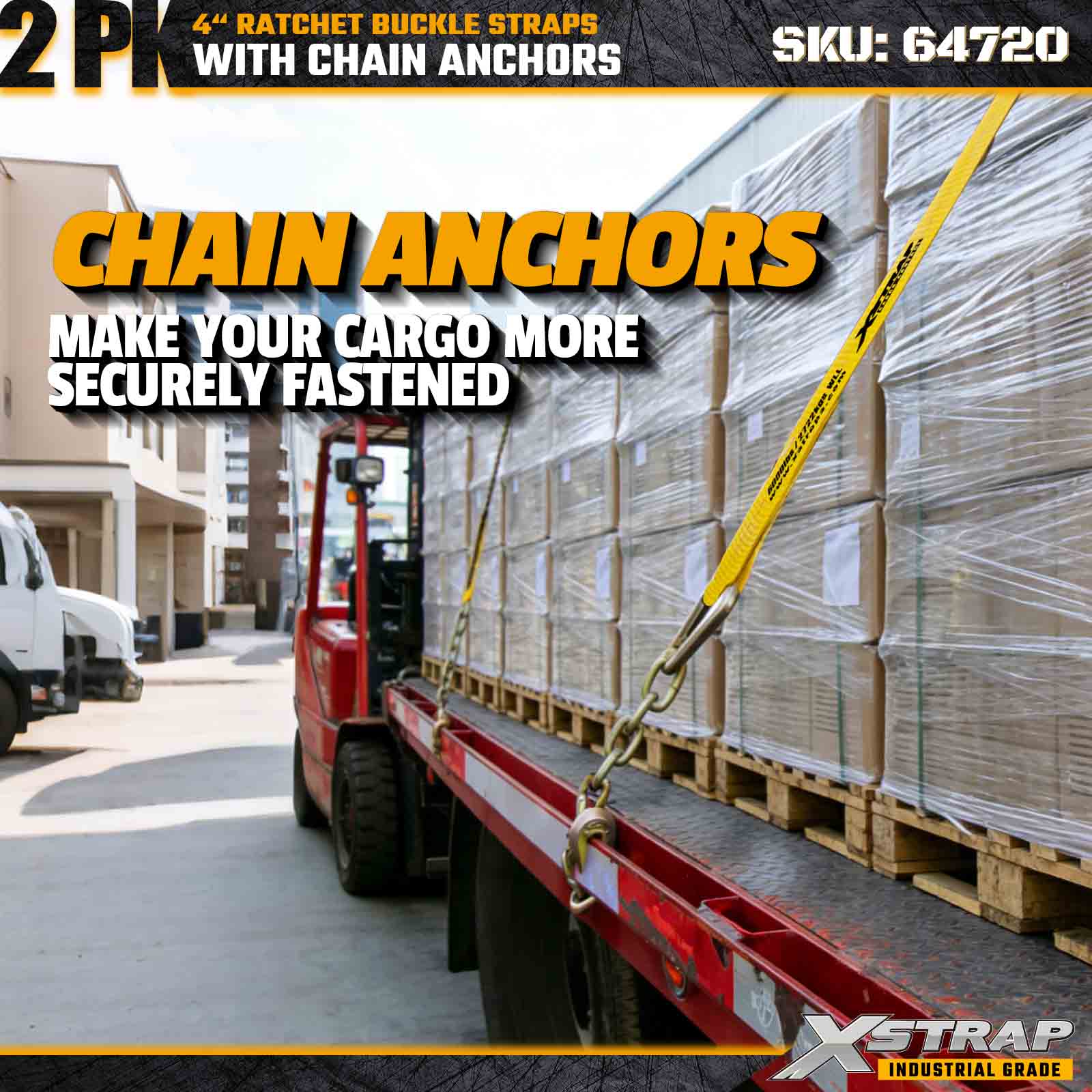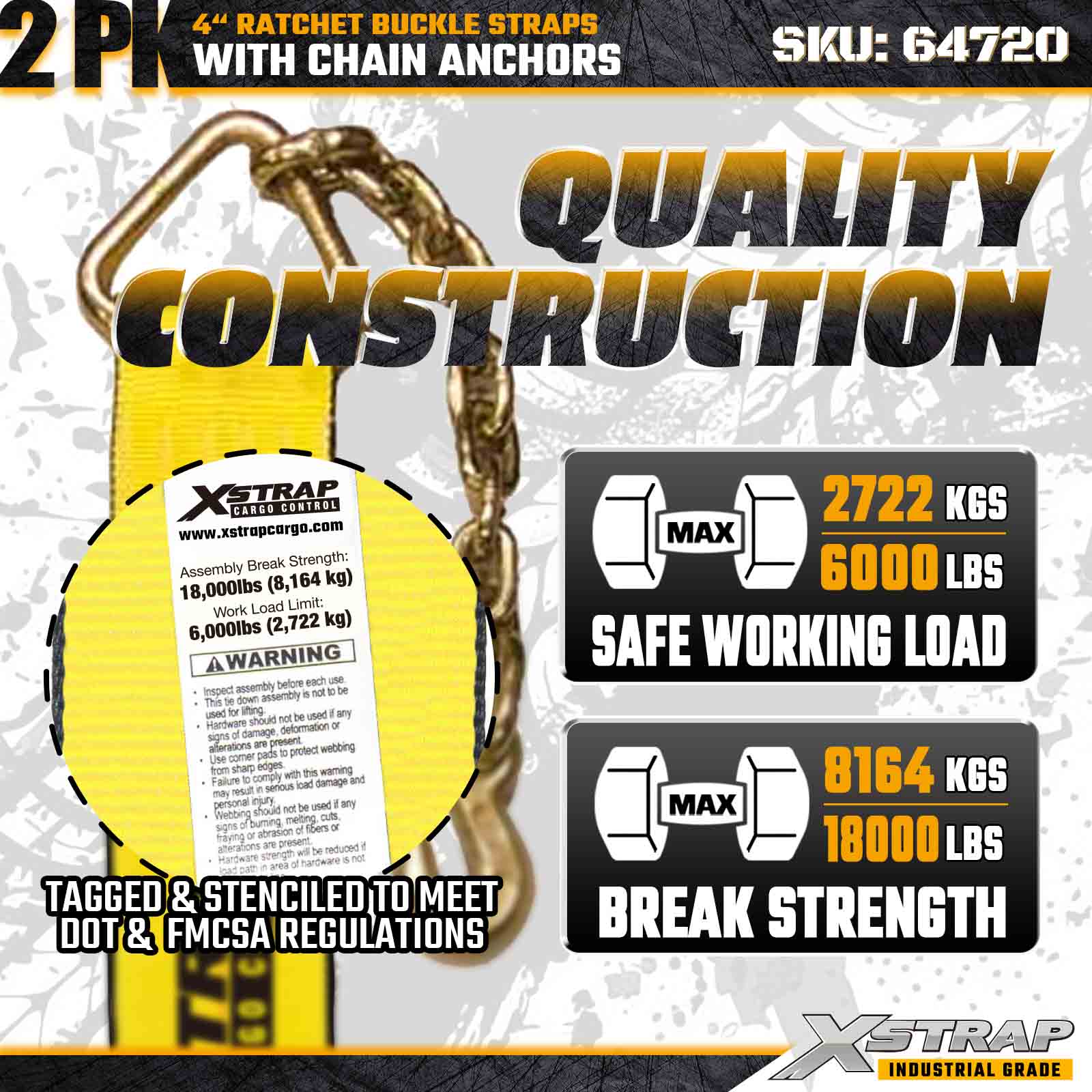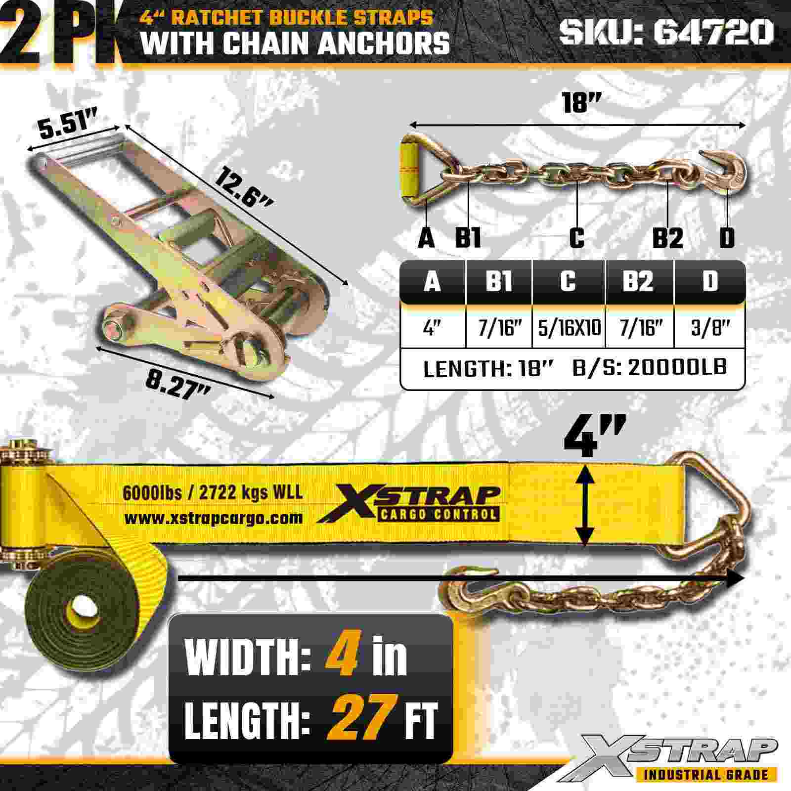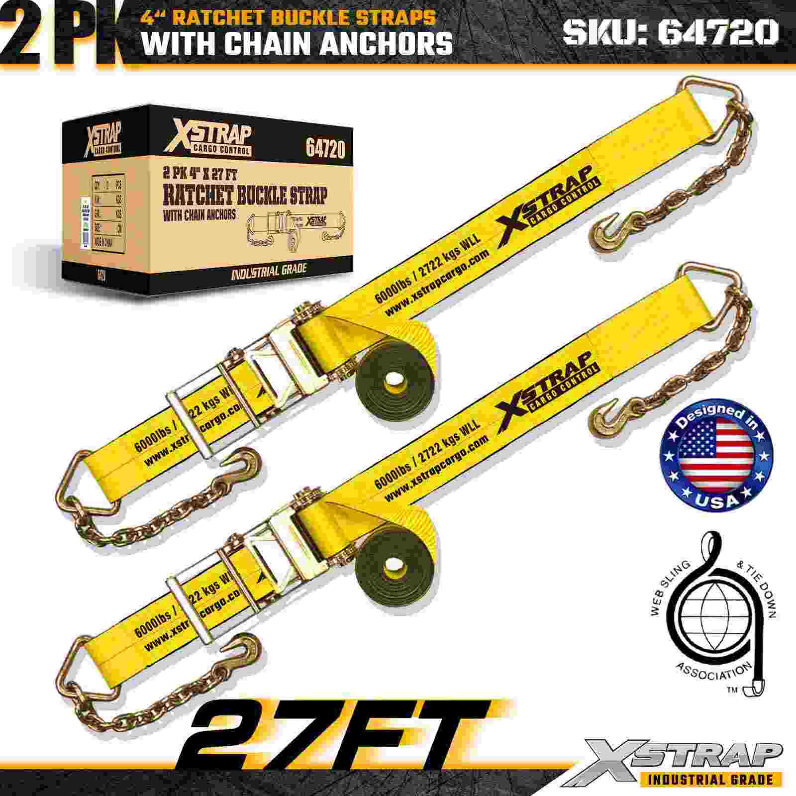 Tali Gesper Ratchet Xstrap 64720 4" × 27 kaki (2 Paket) dirancang untuk pengamanan kargo tugas berat, dilengkapi Jangkar Rantai yang kokoh dan mekanisme ratchet yang diperkuat. Dengan Batas Beban Kerja 6.000 lbs dan Kekuatan Patah 18.000 lbs, tali pengikat ini ideal untuk pengangkutan flatbed, pengangkutan mesin, beban baja, dan aplikasi kargo industri yang membutuhkan kekuatan dan keandalan maksimum.
