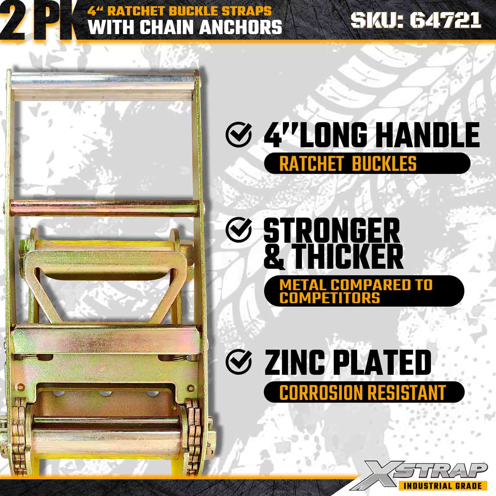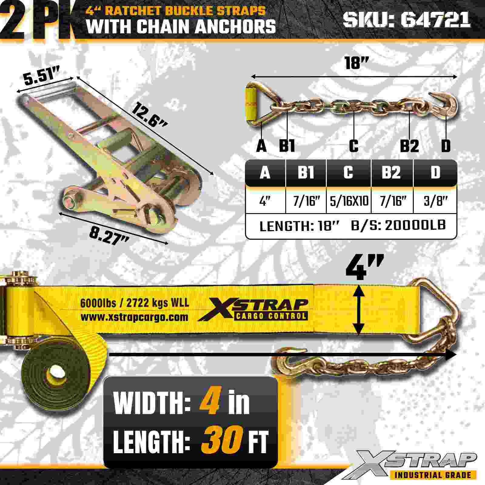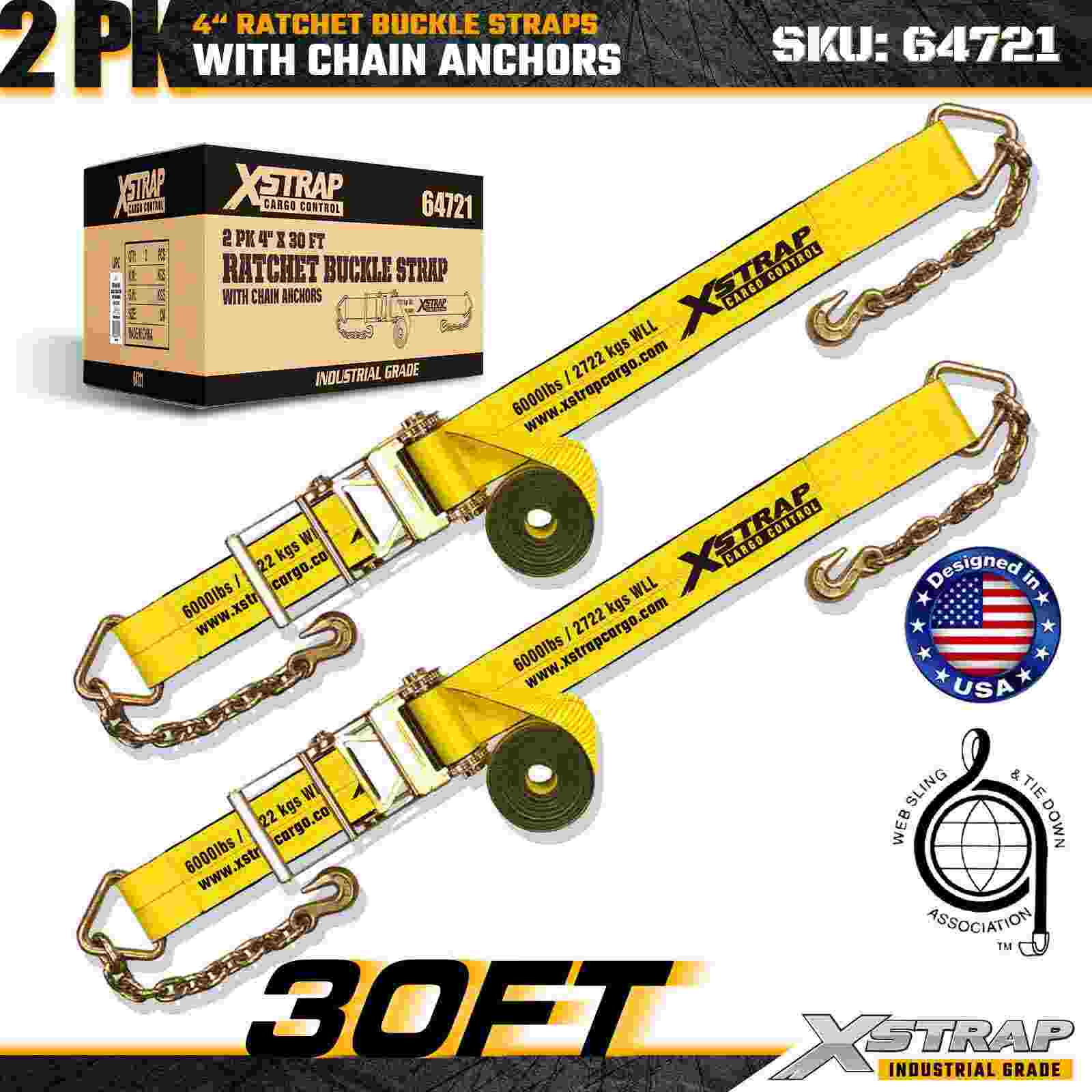 Xstrap 64721 4" × 30 kaki Gesper Ratchet Straps (2-Paket) dirancang untuk pengamanan kargo tugas berat, menampilkan Jangkar Rantai yang kokoh dan mekanisme ratchet yang diperkuat. Dengan Batas Beban Kerja 6,000 lbs dan Kekuatan Putus 18,000 lbs, strap ini ideal untuk pengangkutan flatbed, pengangkutan mesin, beban baja, dan aplikasi kargo industri yang membutuhkan kekuatan dan keandalan maksimum.
