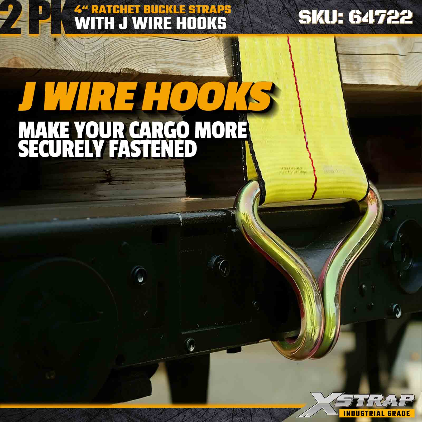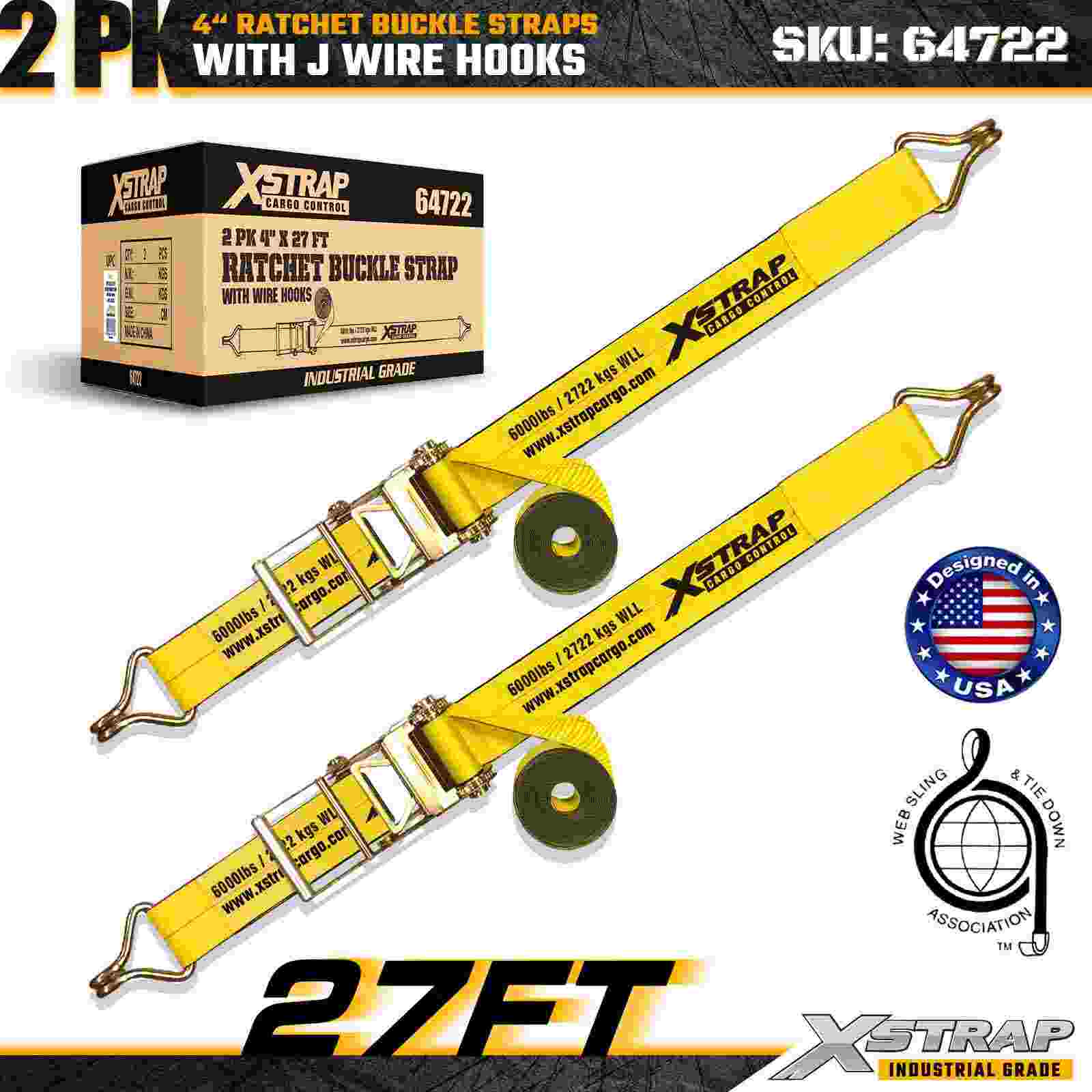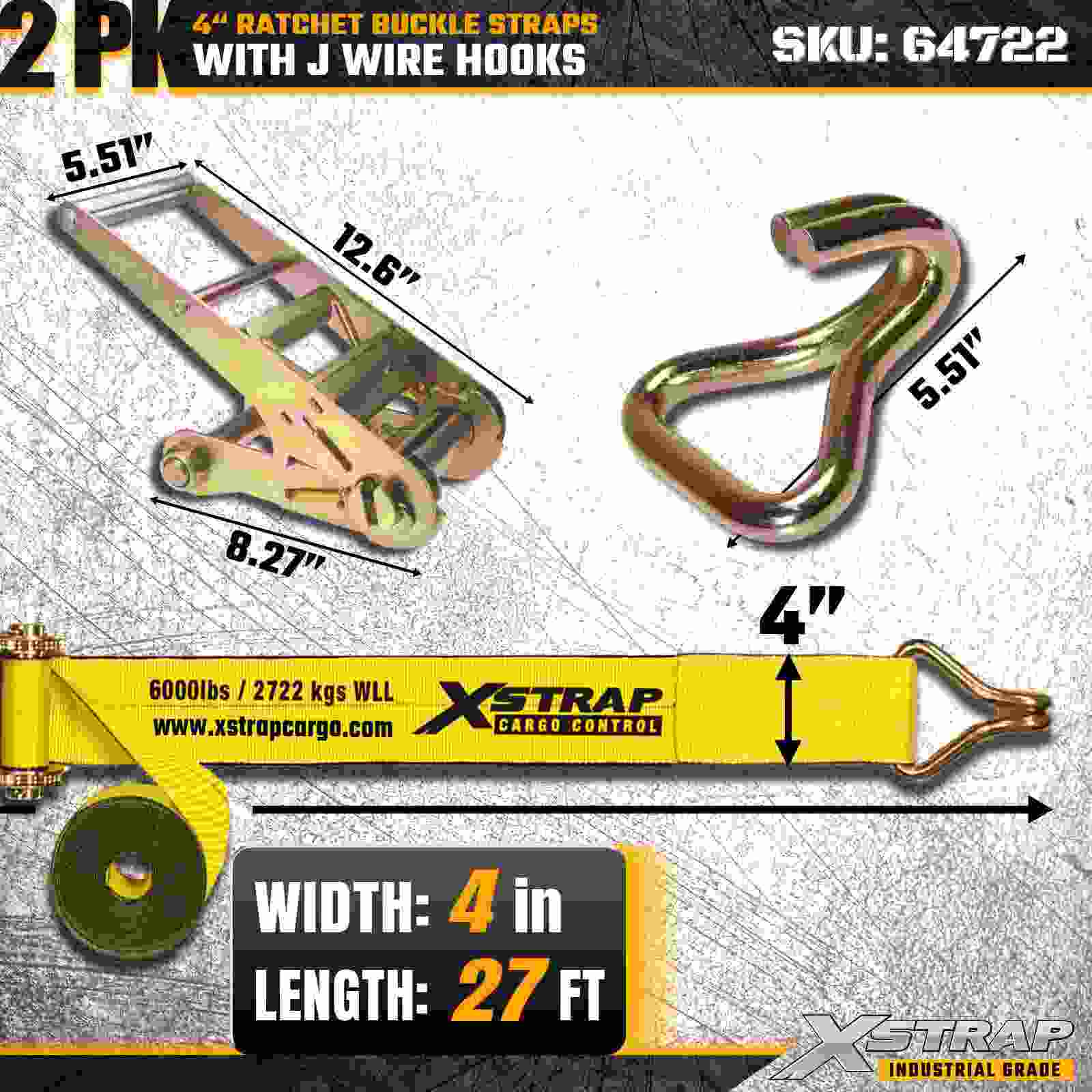 Xstrap 64722 4" × 27 kaki Gesper Ratchet Straps (2-Paket) dirancang untuk pengamanan kargo tugas berat, dilengkapi Kait Kawat yang diperkuat dan mekanisme ratchet yang tahan lama. Dengan Batas Beban Kerja 6,000 lbs dan Kekuatan Putus 18,000 lbs, strap ini ideal untuk pengangkutan flatbed, pengangkutan mesin, kayu, beban baja, dan aplikasi kargo industri.