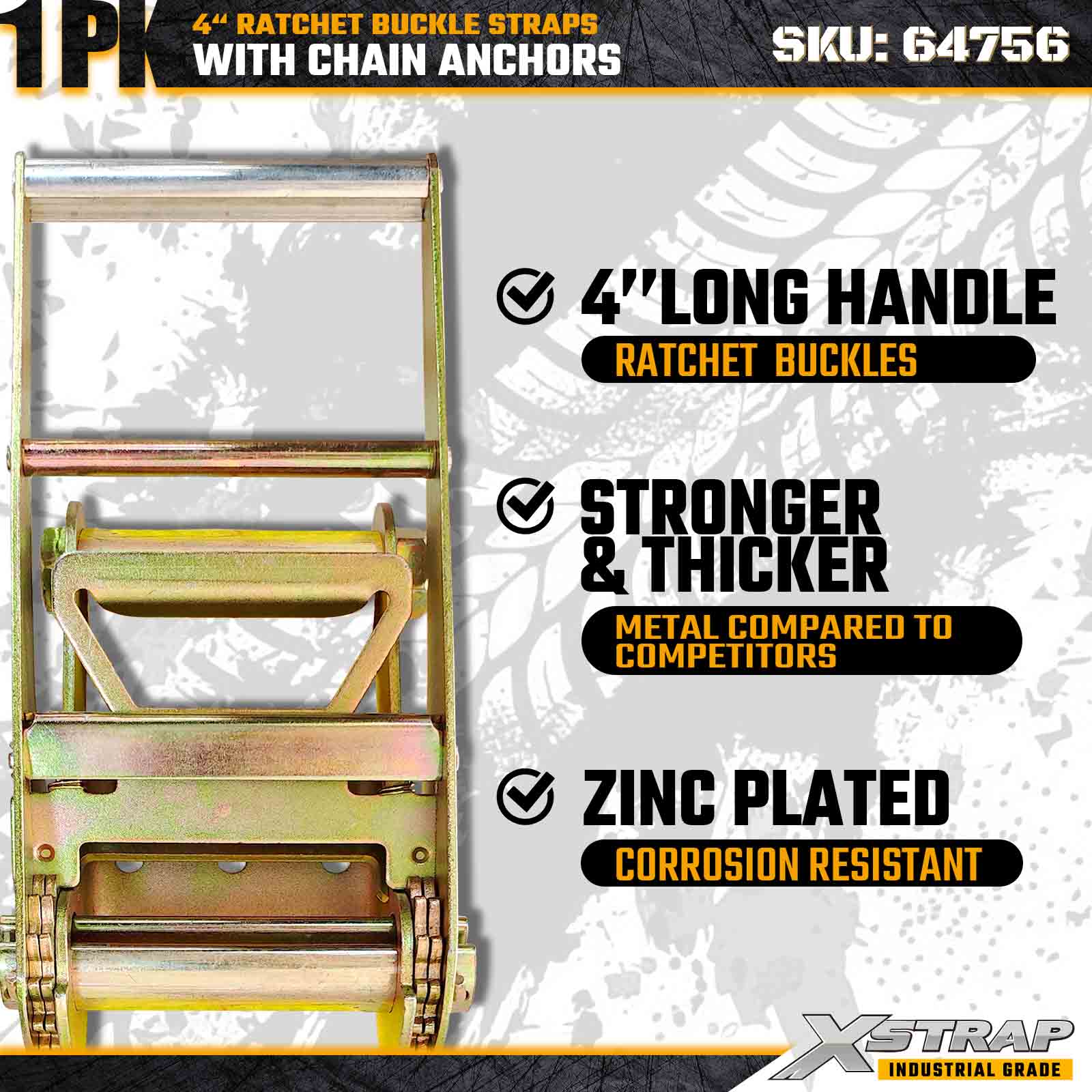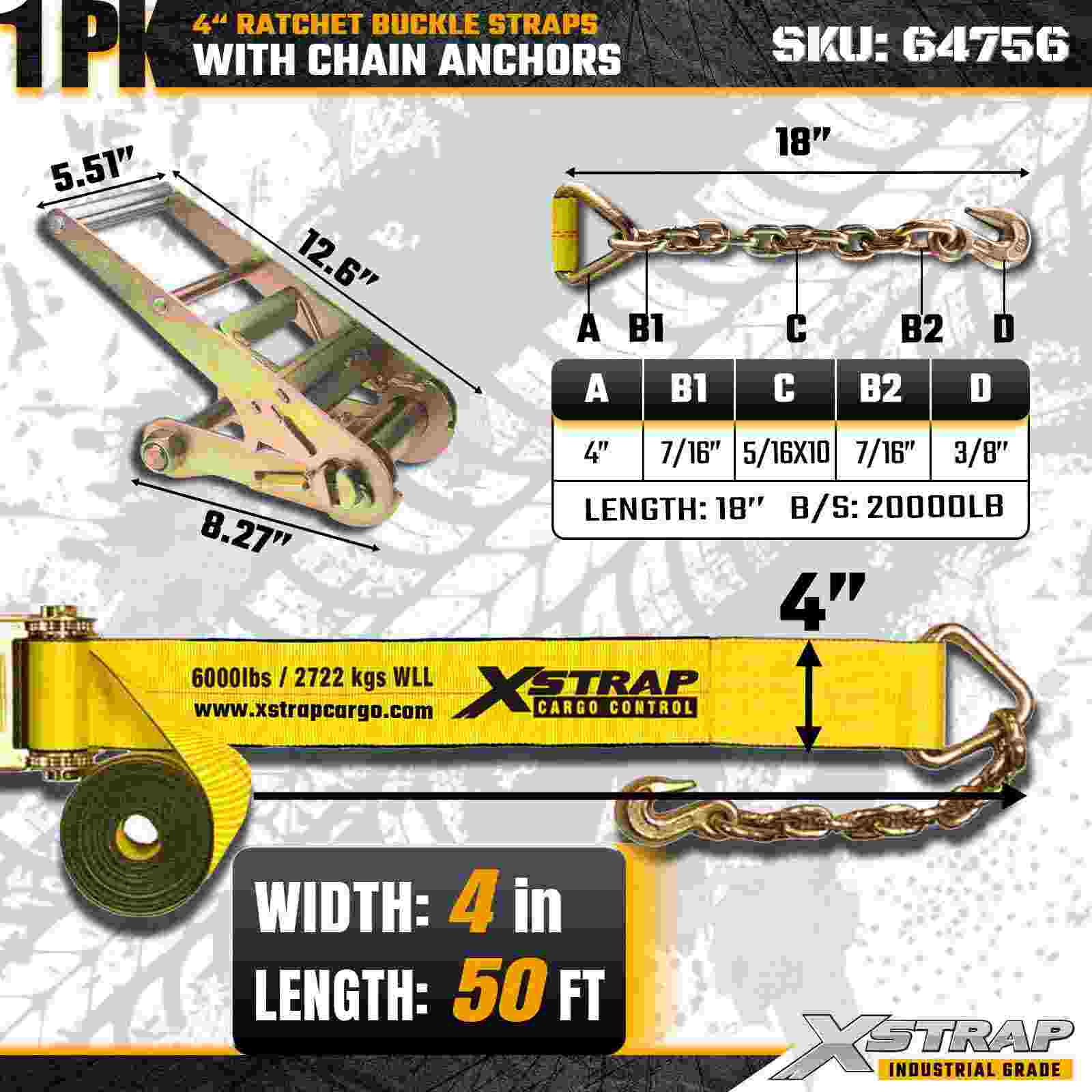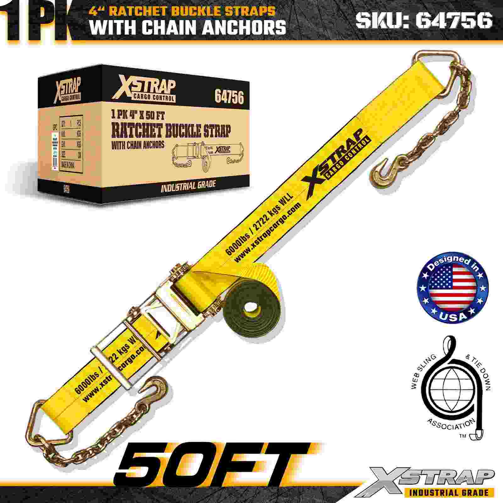 Xstrap 64756 Tali Gesper Ratchet 4" × 50 kaki dengan Jangkar Rantai Kekuatan Patah 18.000 lbs (1 Paket)