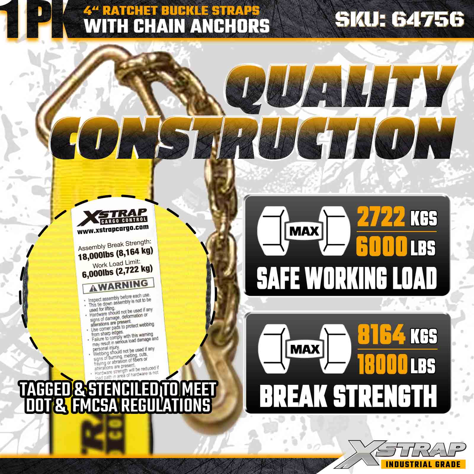 Xstrap 64756 4" × 50 kaki Gesper Ratchet Strap (1-Paket) dirancang untuk pengamanan kargo tugas ekstrim, dilengkapi Chain Anchor yang kokoh dan mekanisme ratchet yang diperkuat. Dengan Batas Beban Kerja 6.000 lbs dan Kekuatan Patah 18.000 lbs, tambahan initali panjang ideal untuk muatan berukuran besar, pengangkutan mesin, pengangkutan baja, dan logistik industri yang memerlukan jangkauan dan keandalan maksimal.