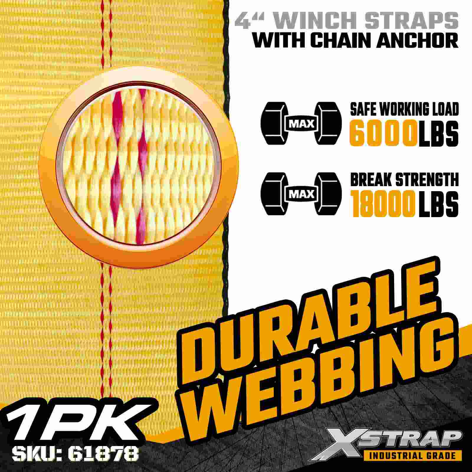 Xstrap 61878 4" × 27 kaki Standard Winch Strap adalah tali pengaman kargo industri tugas berat yang dirancang untuk trailer flatbed dan kondisi muatan ekstrem. Menampilkan Jangkar Rantai yang ditempa dan anyaman poliester 4 inci yang sangat lebar, tali winch 4 inci ini menghasilkan Batas Beban Kerja 6.000 lbs dan Kekuatan Patah 18.000 lbs. Desain Chain Anchor memberikan cengkeraman dan daya tahan yang tak tertandingi, menjadikannya ideal untuk mengamankan baja, mesin, dan angkutan tegangan tinggi lainnya.