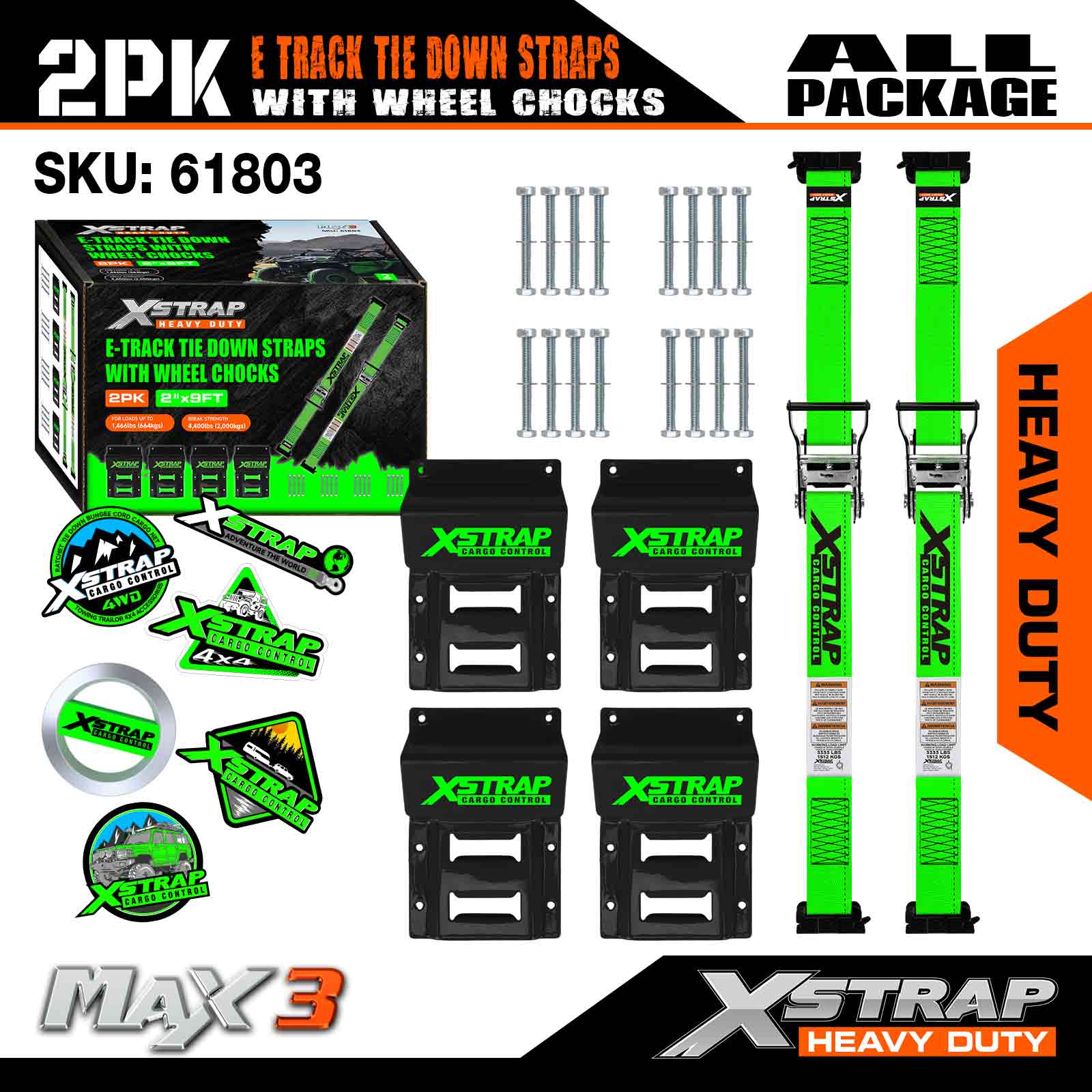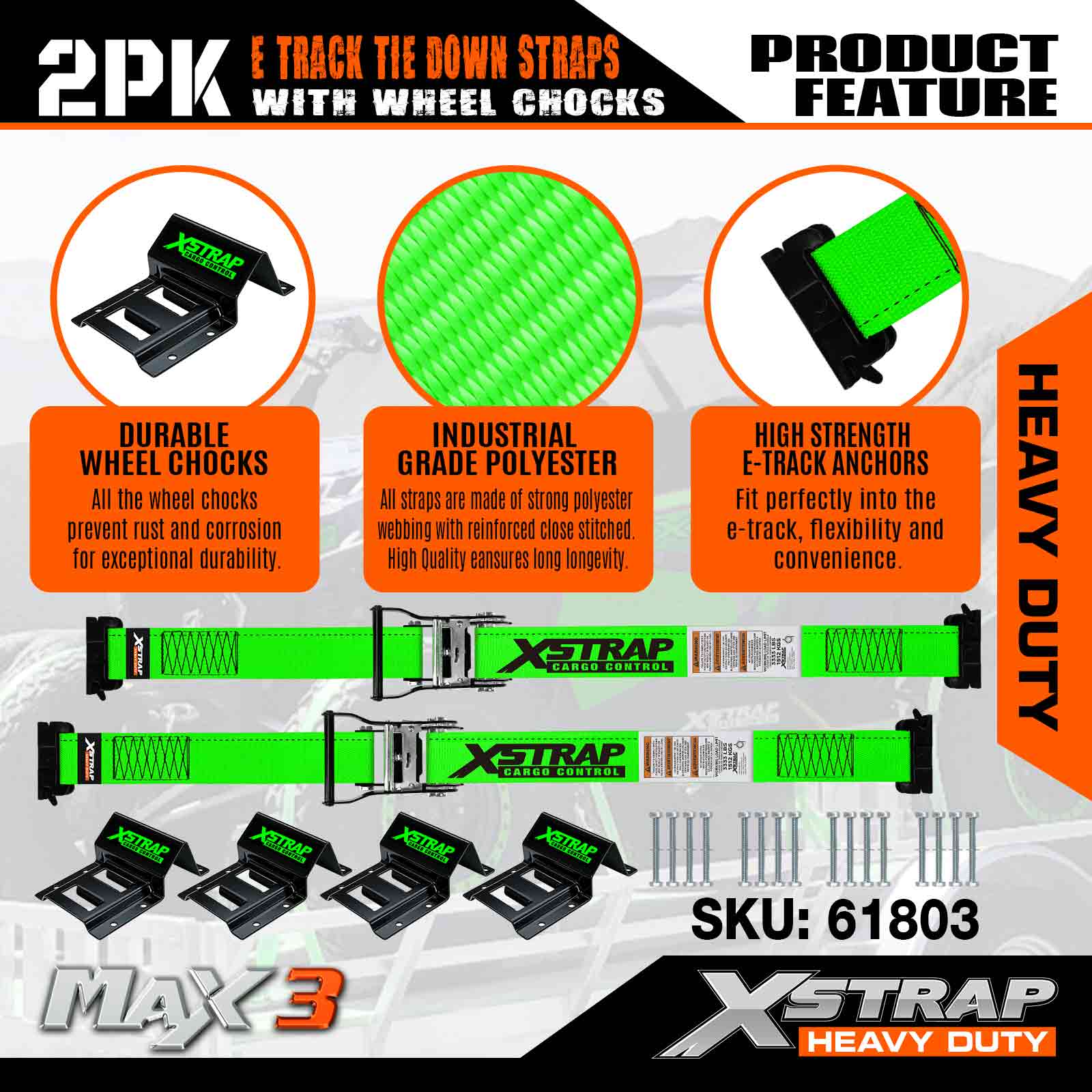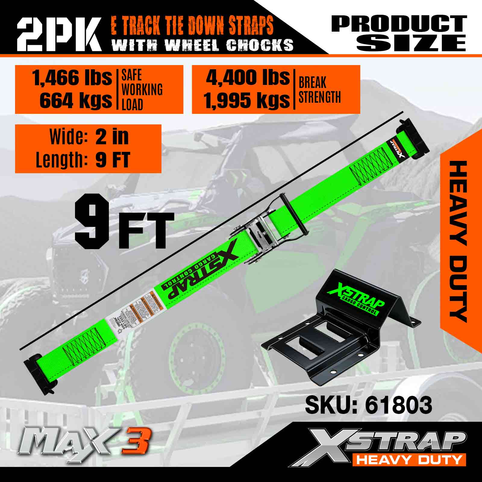 Xstrap E-Track Wheel Chock Tie Down Kit, Tali Tugas Berat 2 inci * 9 kaki untuk Trailer Mobil UTV ATV, Ratchet Tie Downs Dengan Tali Ban (2 Pak)