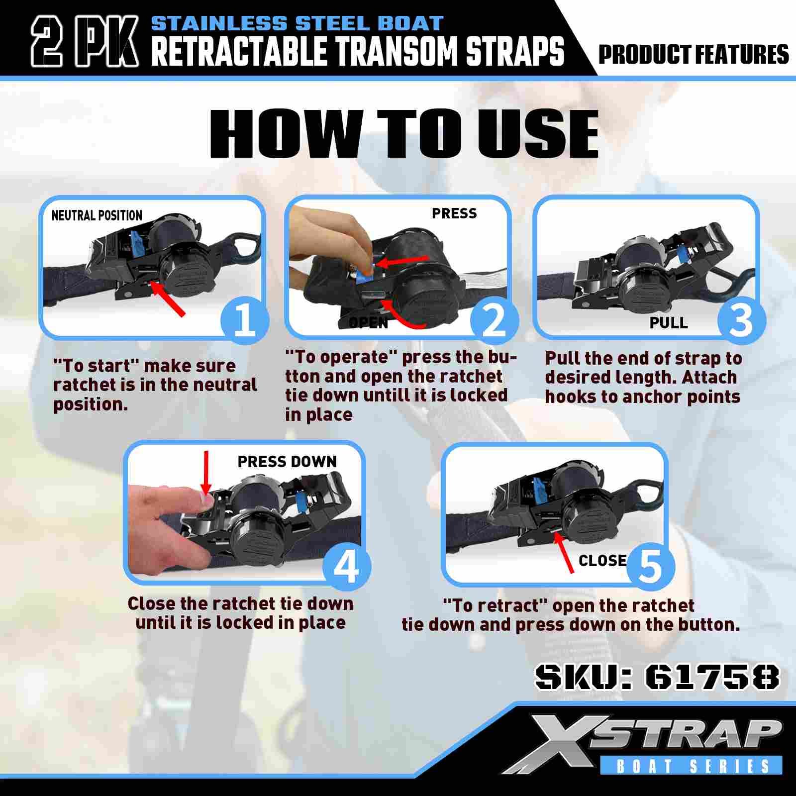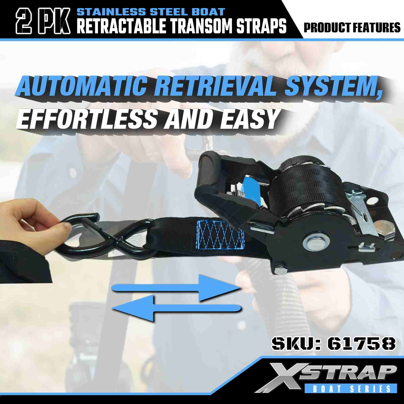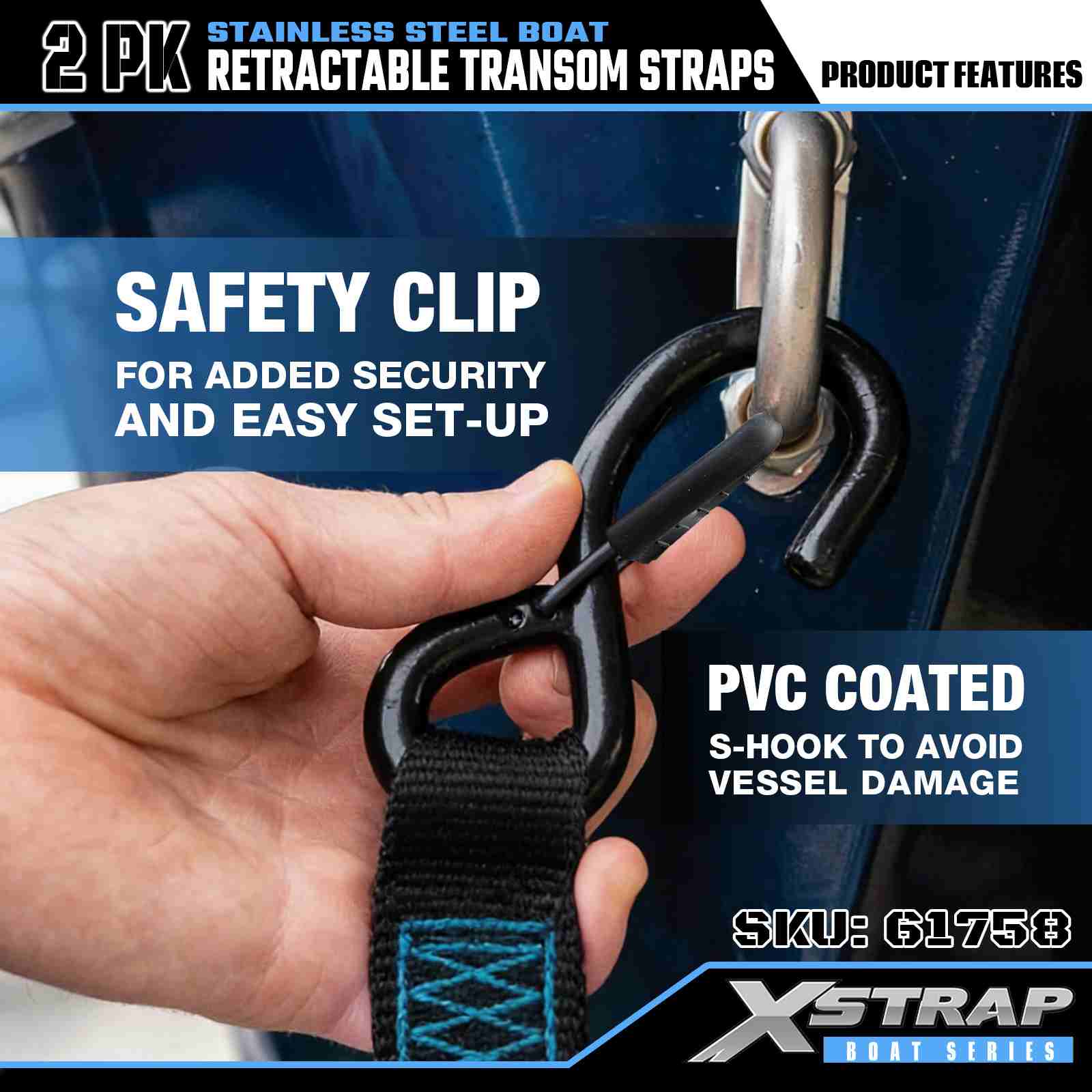 Xstrap 2PK Perahu Tali Transom yang Dapat Ditarik dengan Kait Pengaman S, Tali Pengikat Poliester 2” x 3,6' Tali yang Dapat Ditarik, Tali Pengaman Kargo Kapasitas 1000lbs dengan Kait Pengaman untuk Profesional Serius untuk Mengamankan Trailer Kargo, Trailer Tempat Tidur Datar, Perahu Ski, Mobil Kecil.