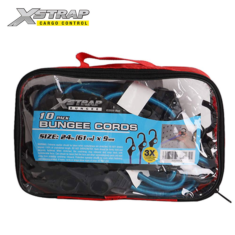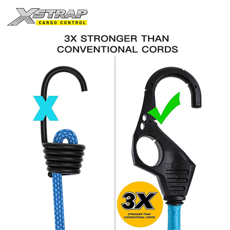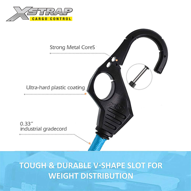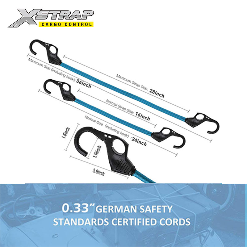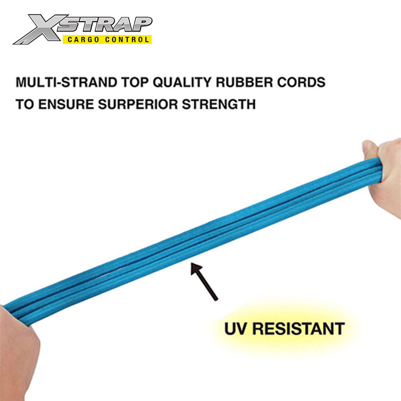 Tali bungee dengan kait lubang jari terbuat dari karet dan lateks tenun silang tahan UV yang unggul, tidak akan tipis atau putus karena penggunaan sehari-hari atau iklim yang berbeda.