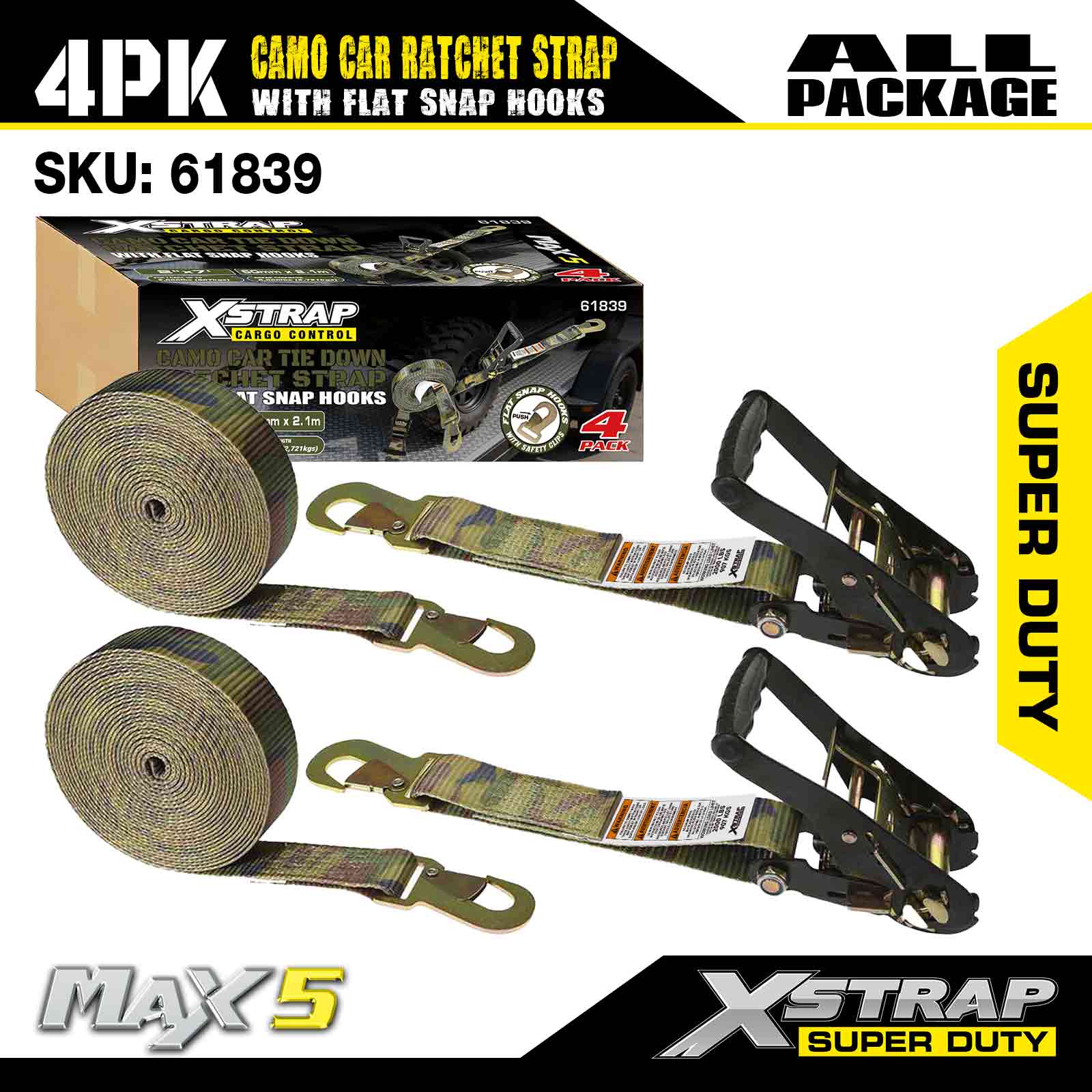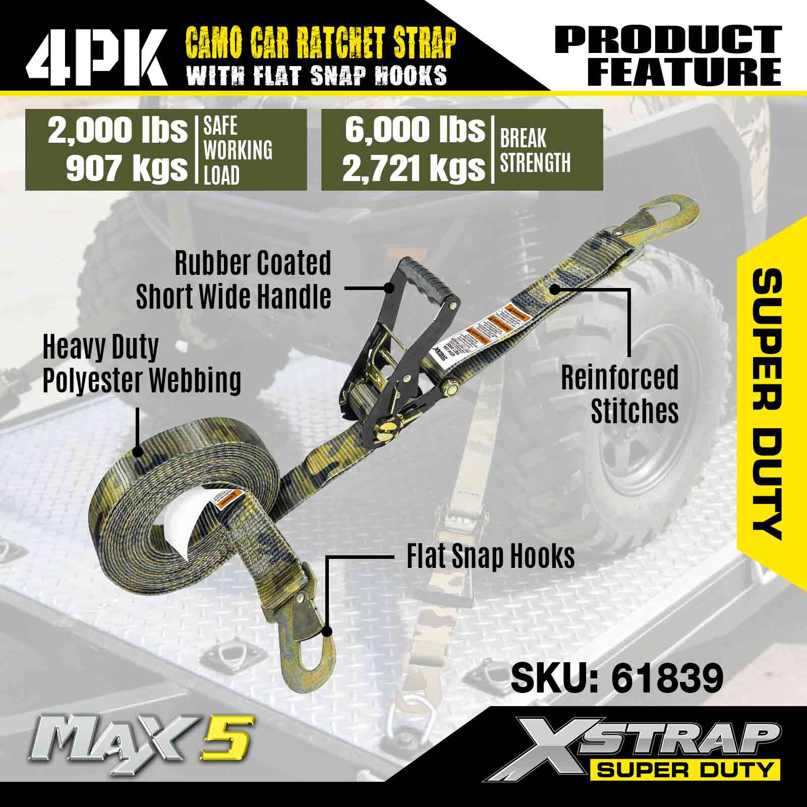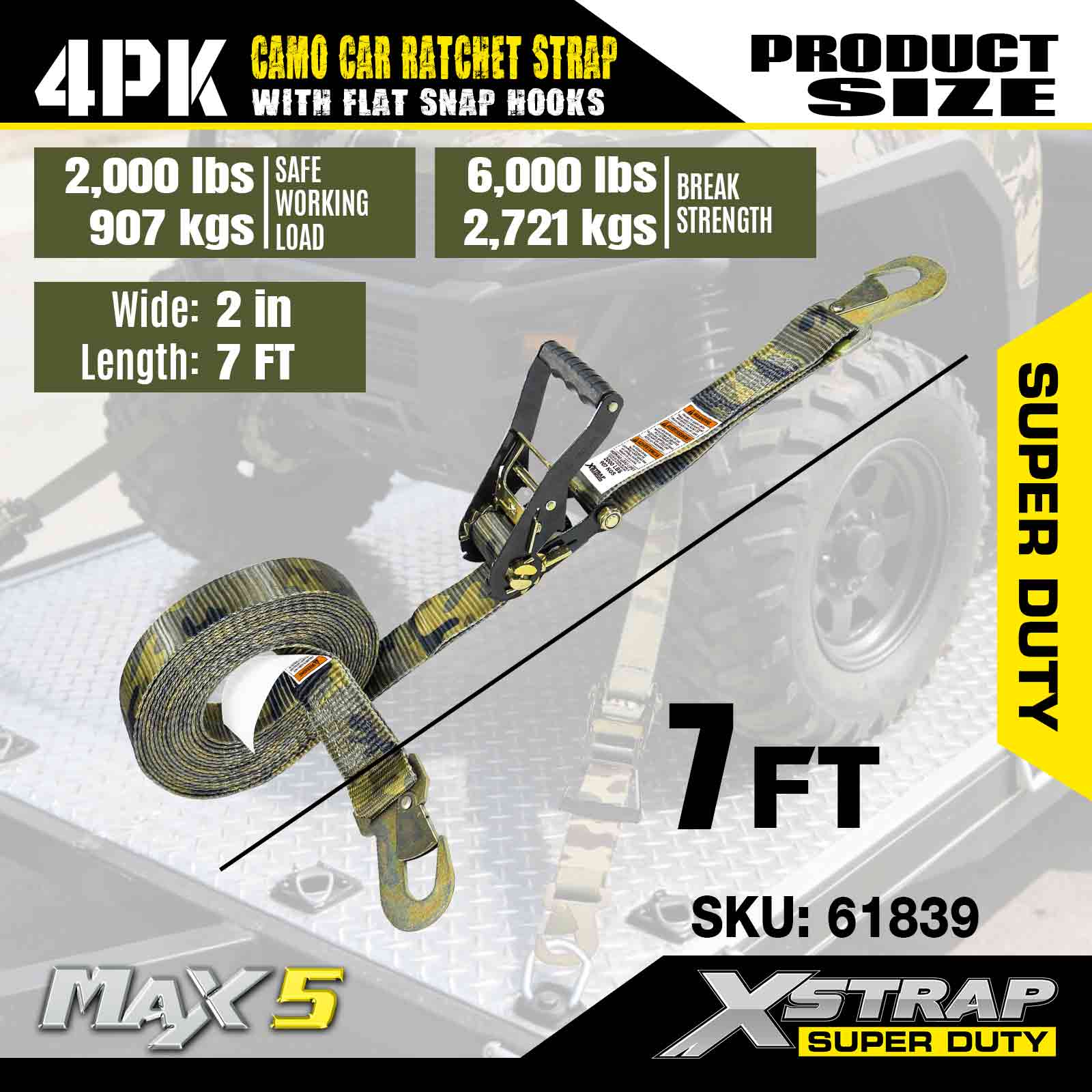 Xstrap Cargo Control Tali Ratchet Otomatis dengan Kait Snap Datar 2 Inci x 7 Kaki (4 Paket), Kekuatan Putus 6.000 LBS, Tali Ratchet Serbaguna dengan Kait Pengunci Datar, Mobil Pengikat, Sepeda Motor, & Kendaraan Lainnya