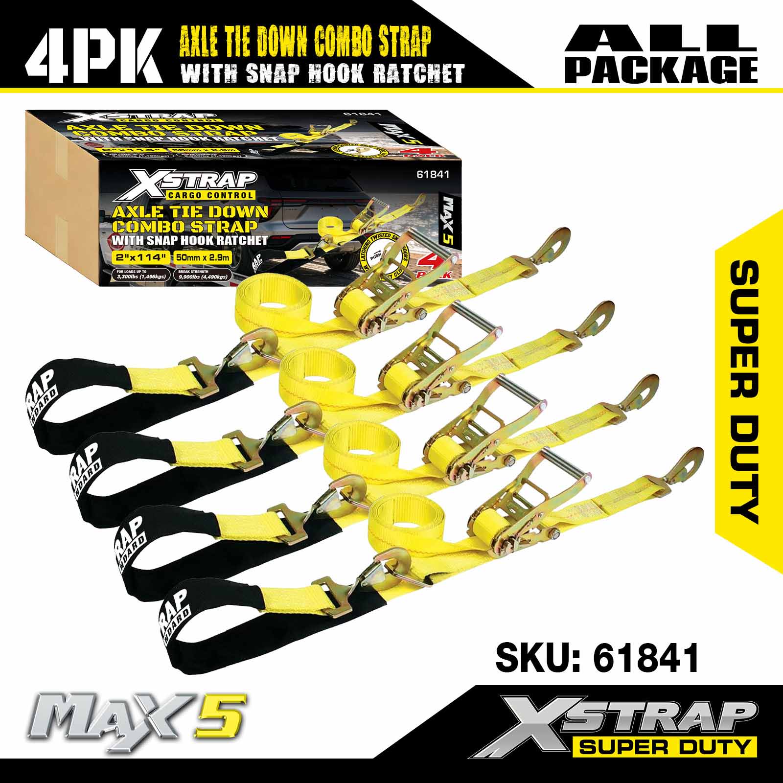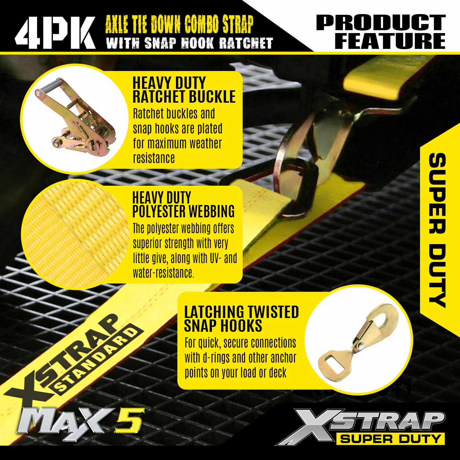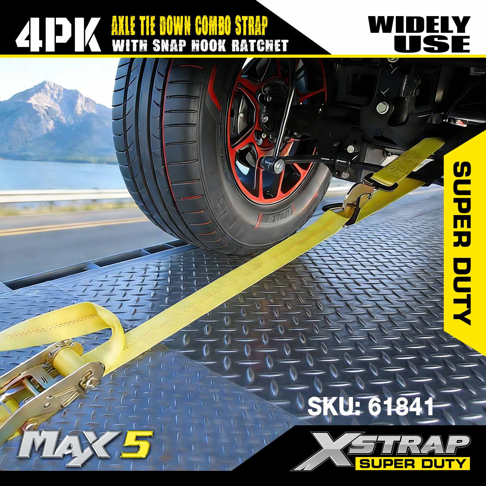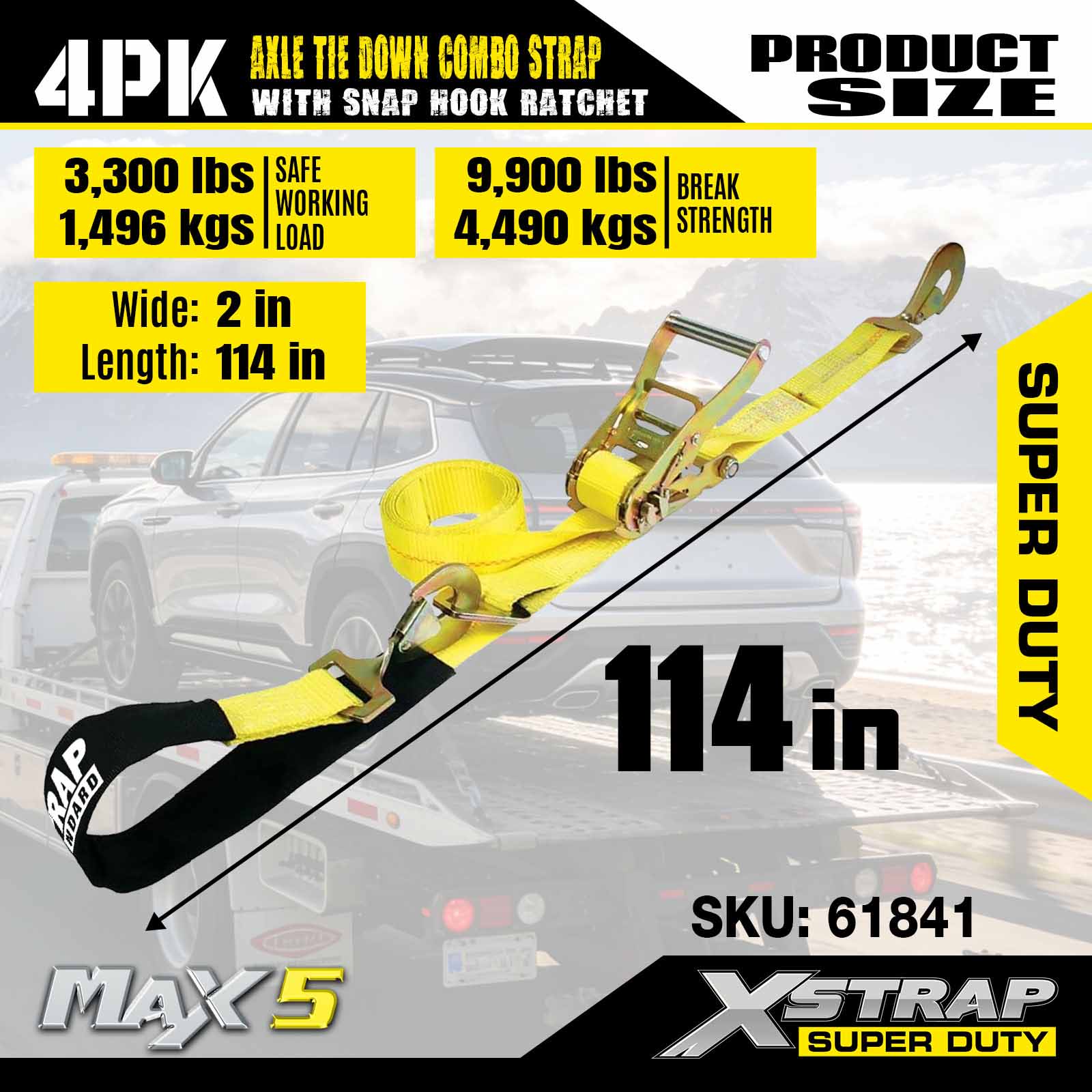 - 4 Paket Tali Gandar 114”: Pengikat otomatis laso serbaguna digunakan untuk melewati pelek kendaraan yang diangkut, juga dapat diamankan ke bagian padat mana pun pada roda, gandar, atau rangka.