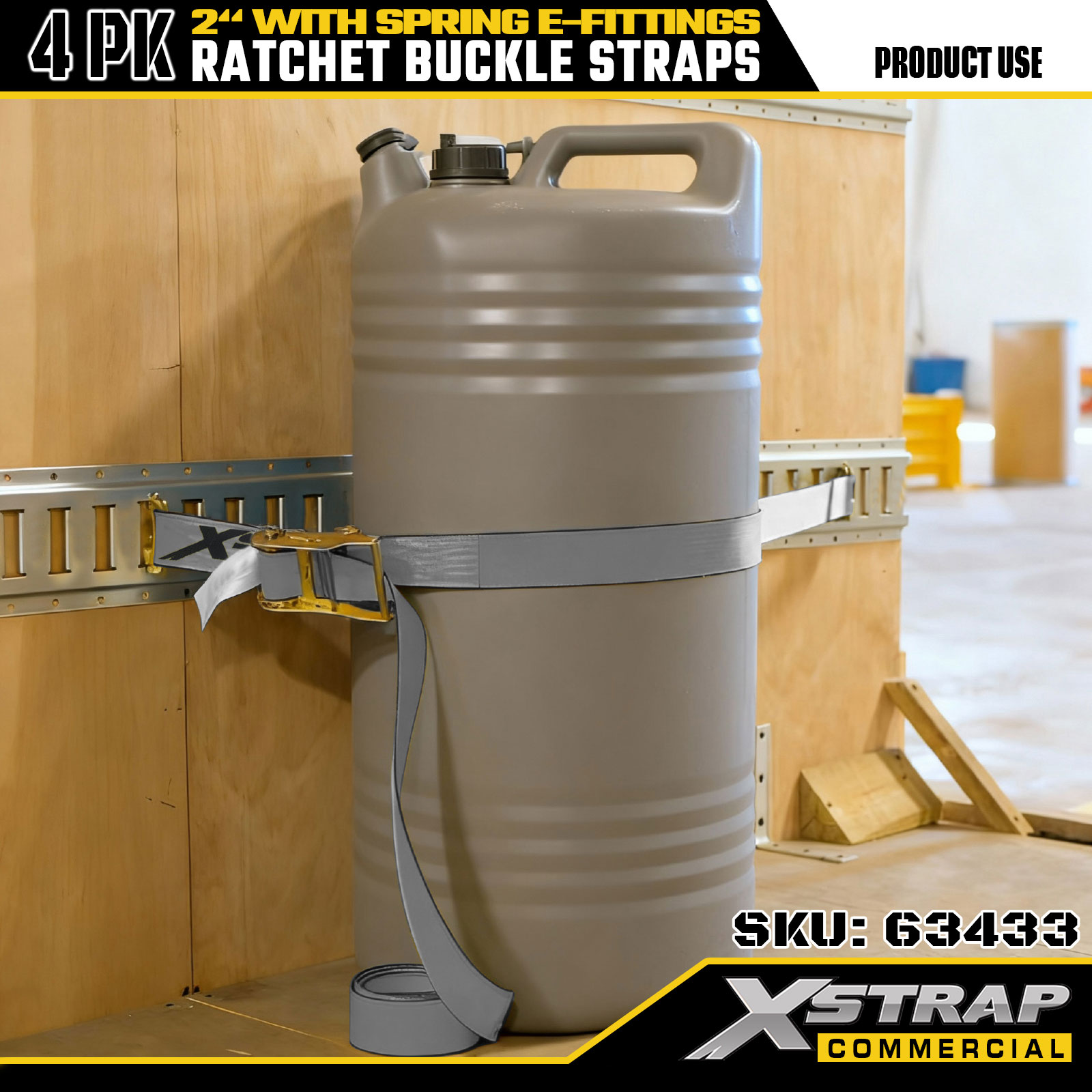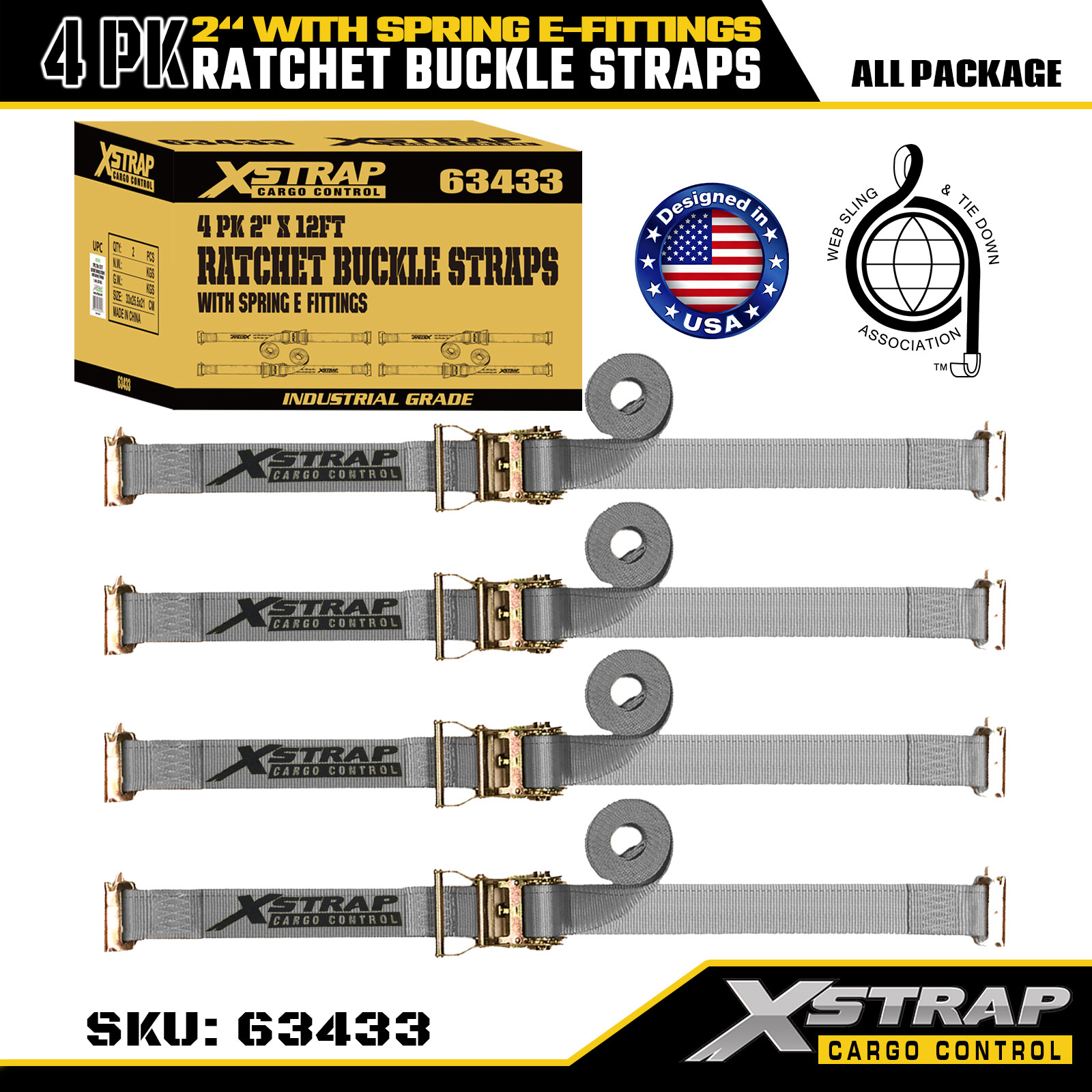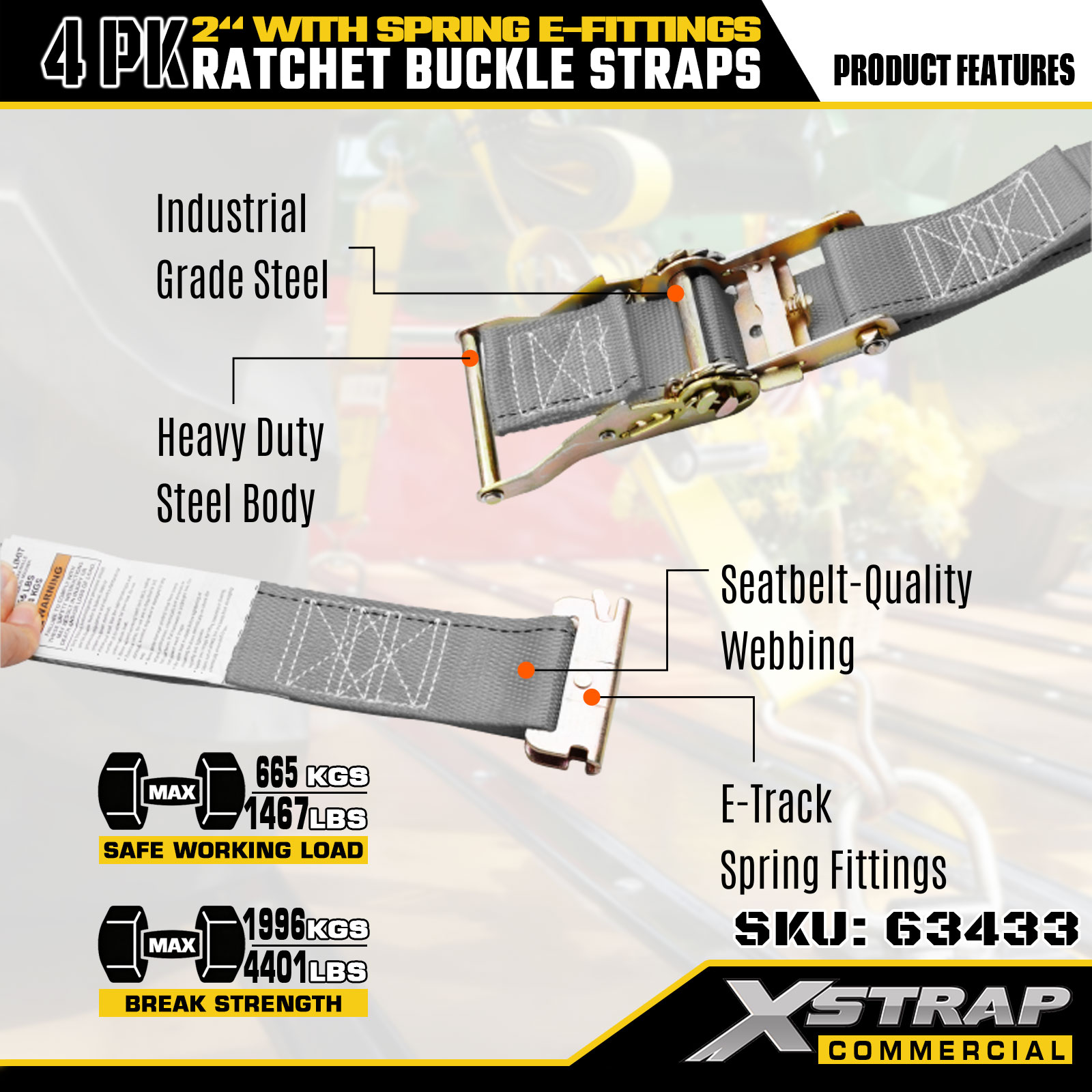 Xstrap 4 Pack Ratchet Tie-Down Straps, Tali Pengaman Kargo Poliester 2" x 16', Beban Kerja Aman 1467 lbs & Kekuatan Putus 4401 lbs, dengan Kait E Logam untuk Truk, Mesin Pemotong, ATV2. Spesifikasi produk: