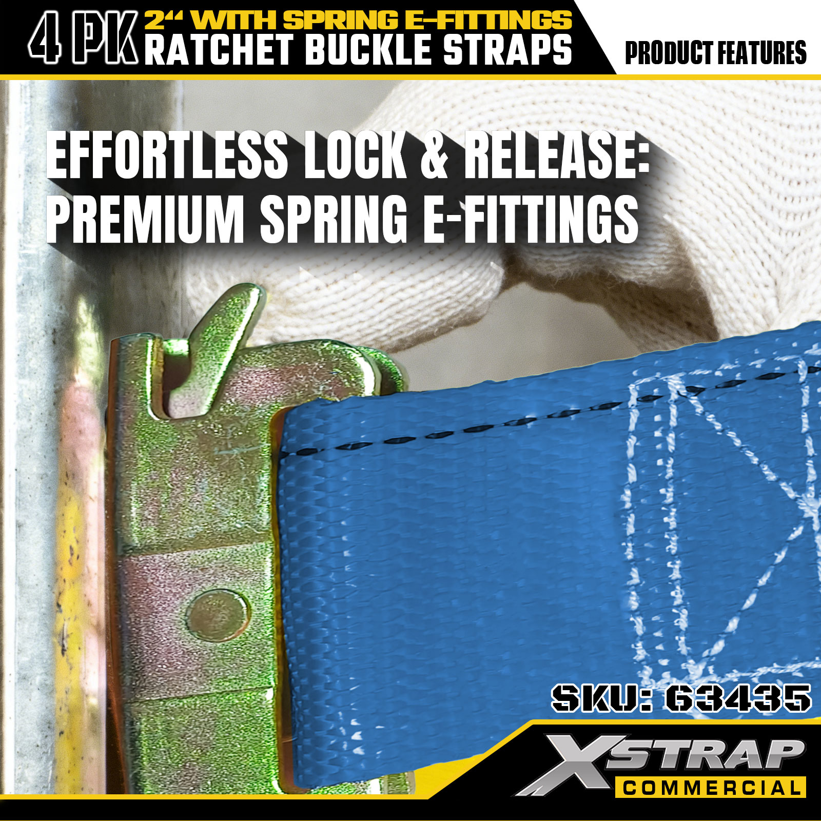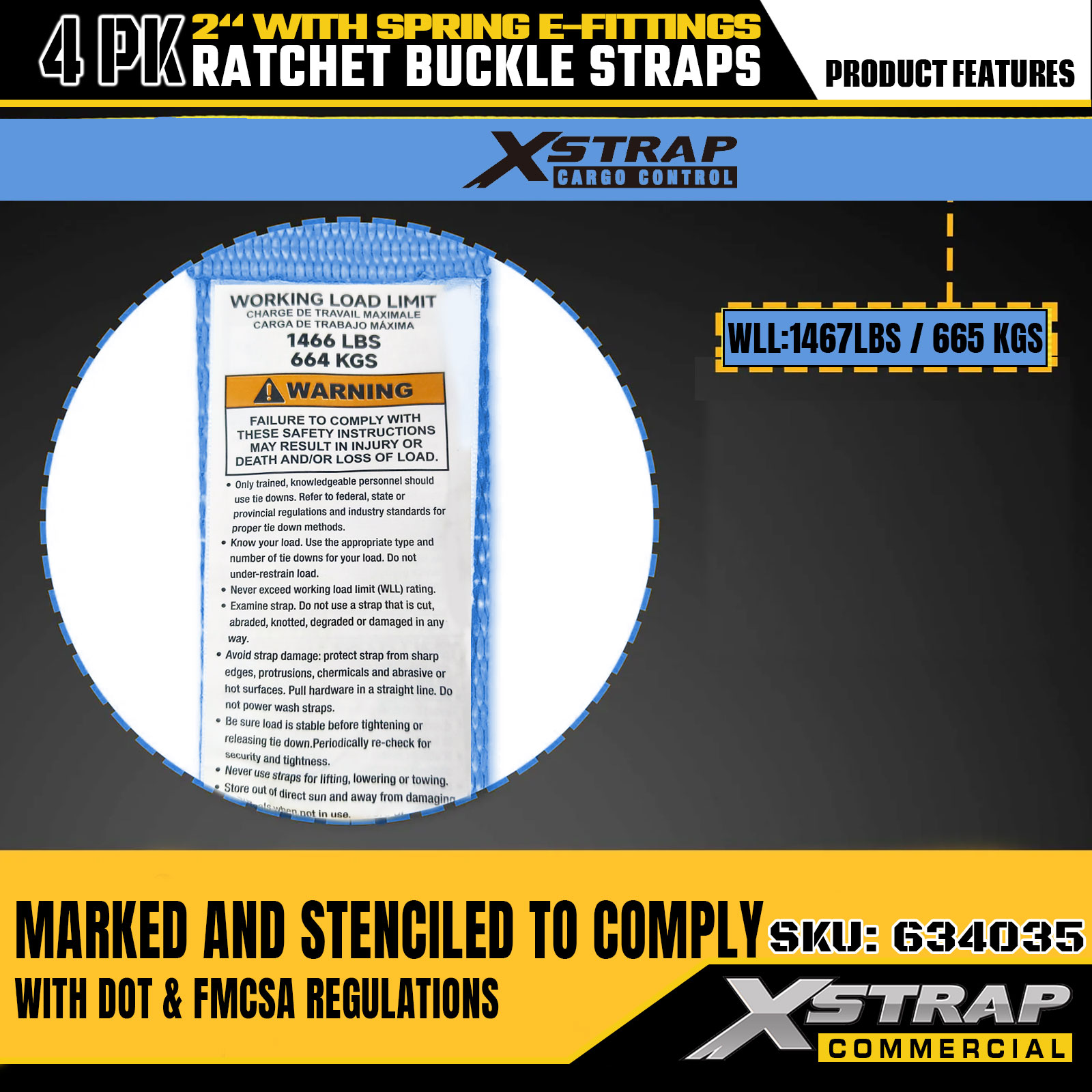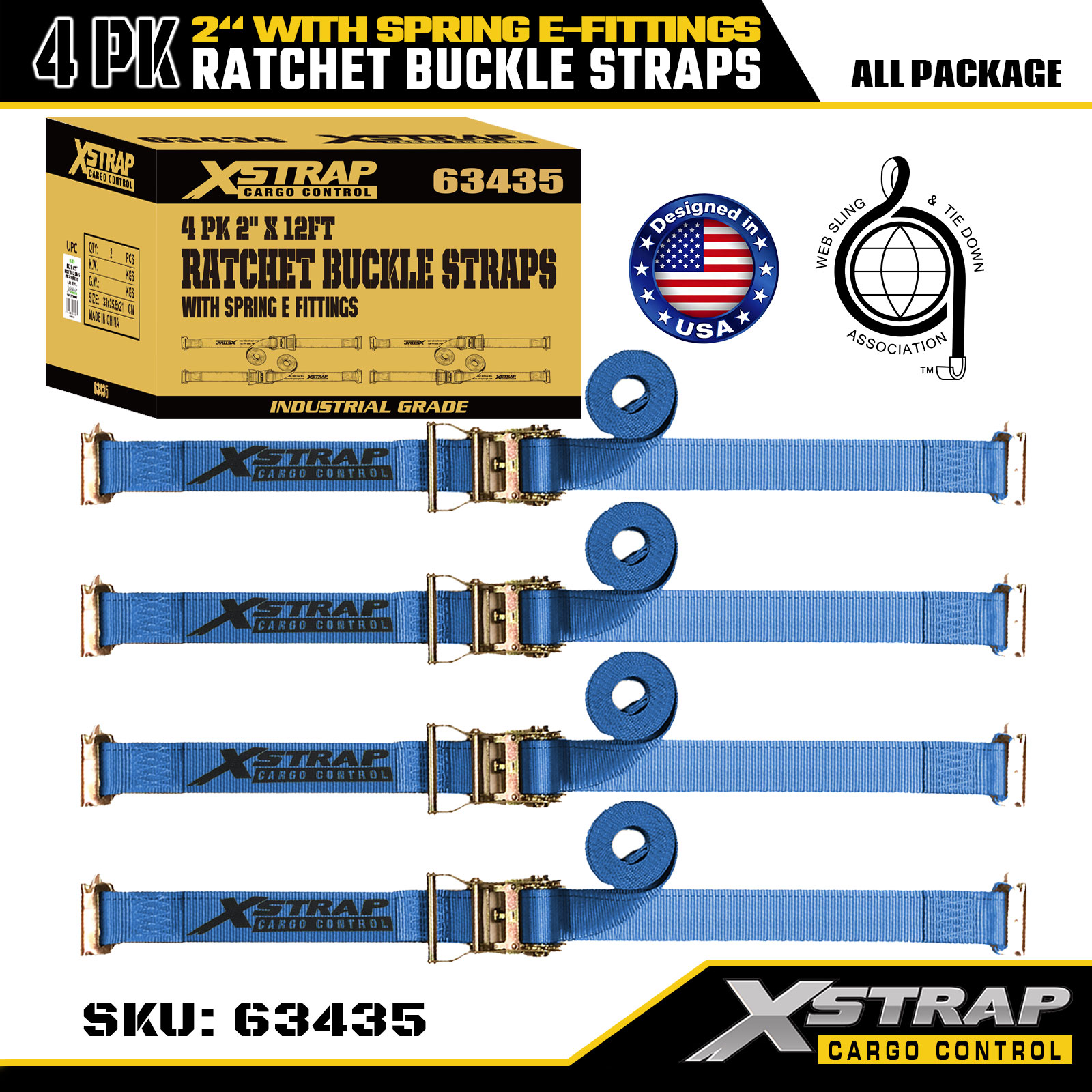 Xstrap 4 Pack Ratchet Tie-Down Straps, Tali Pengaman Kargo Poliester 2" x 12' dengan Spring E-Fitting, Beban Kerja Aman (SWL) 1467 lbs & Kekuatan Putus 4401 lbs, untuk Truk, Mesin Pemotong Rumput, ATV
