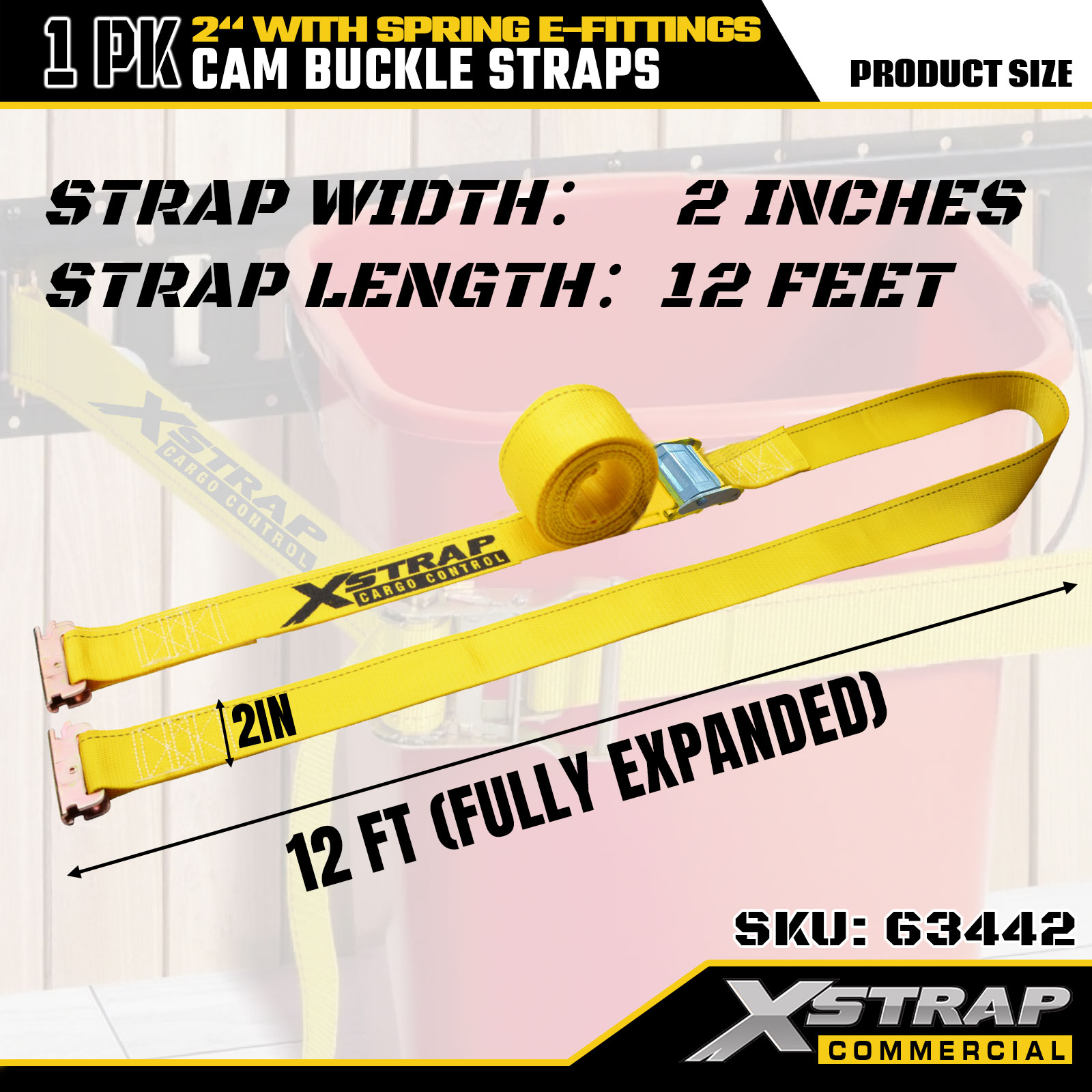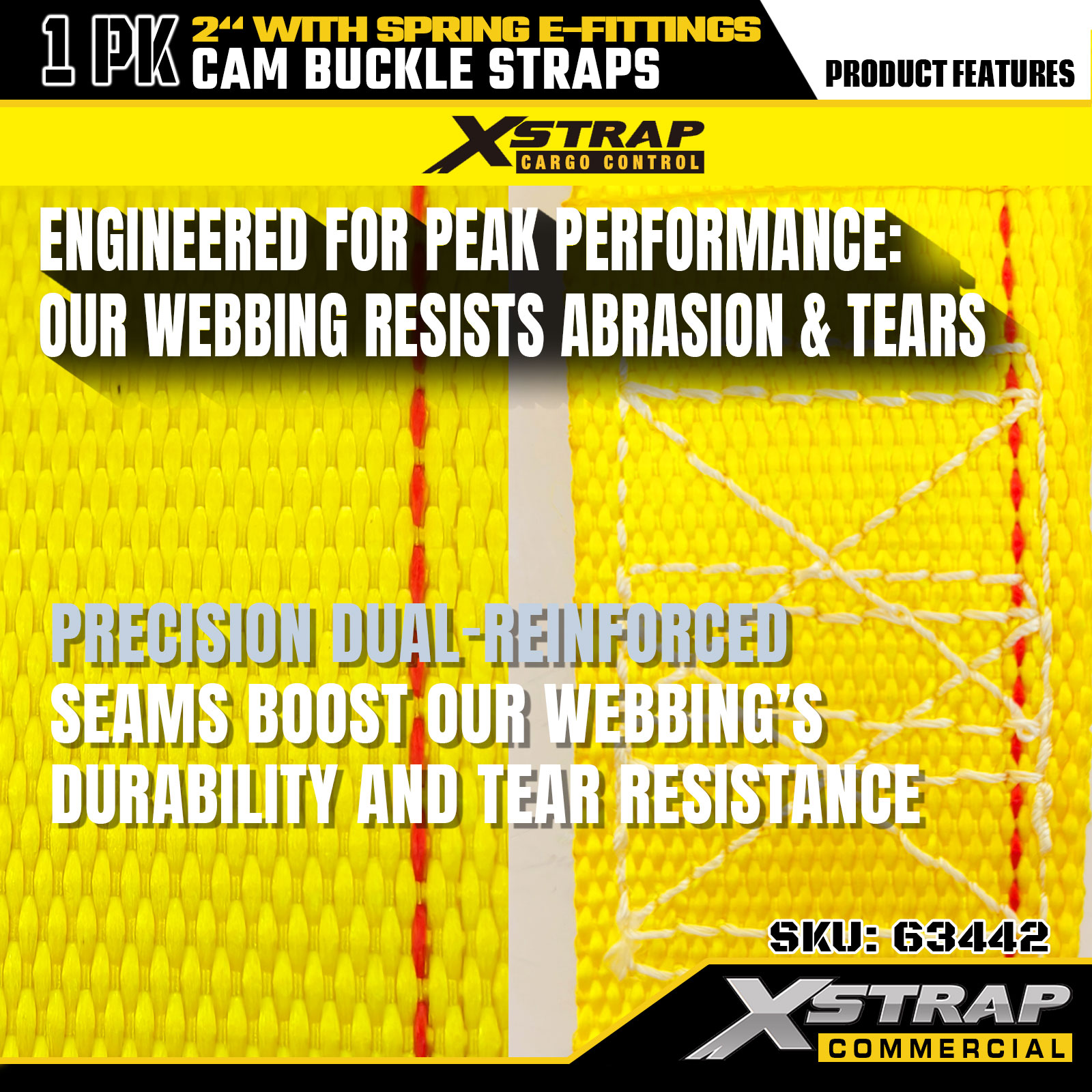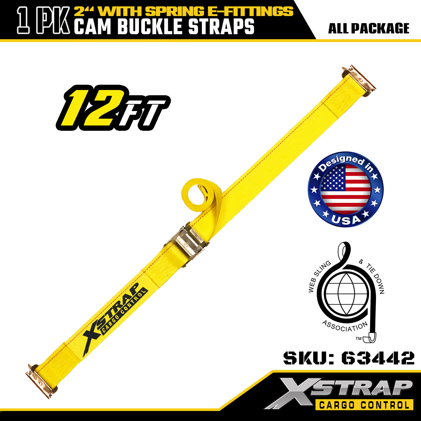 Xstrap 63442 Tali Gesper Cam Tugas Berat 2" x 12' (1PK) - Poliester Kuning dengan E-Fitting Pegas, SWL 1000 lbs & Kekuatan Putus 453 lbs untuk Pemindahan, Kontrol Kargo & Transportasi