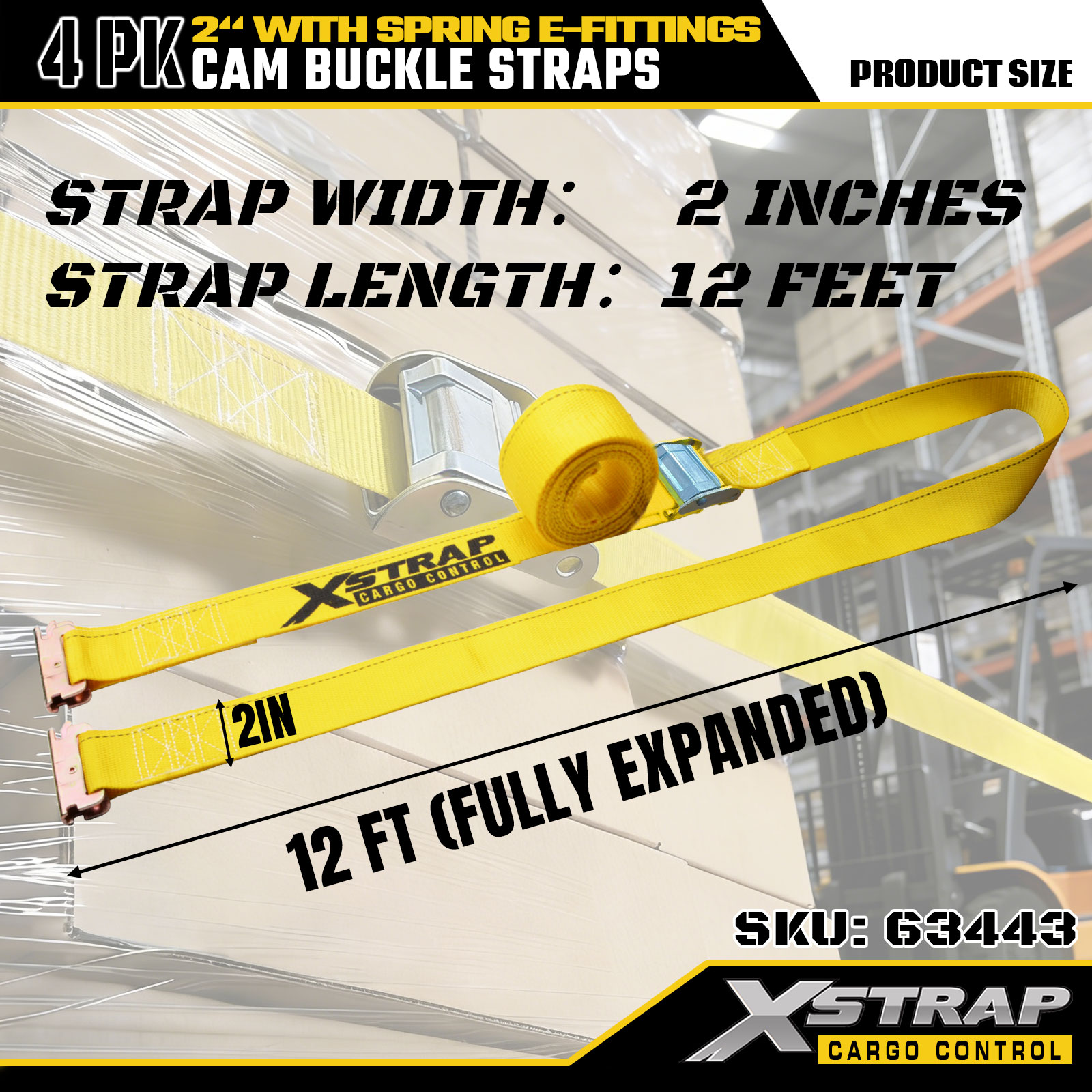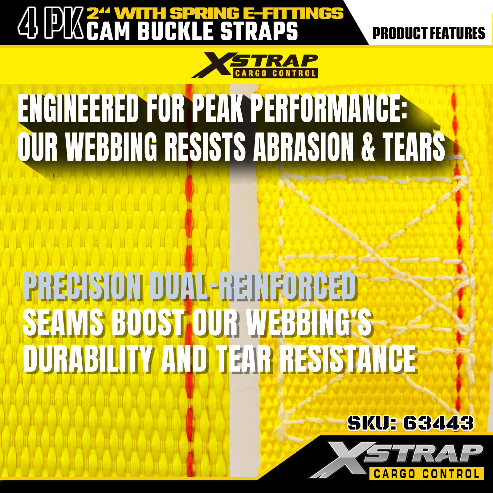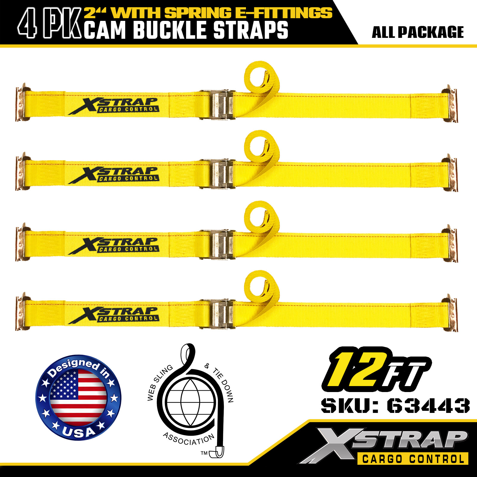 Xstrap 63443 4 Paket Tali Gesper Cam Kuning 2" x 12' dengan E-Fitting Pegas, SWL 1000 lbs & Kekuatan Putus 453 lbs untuk Penanganan Kargo, Relokasi & Transit