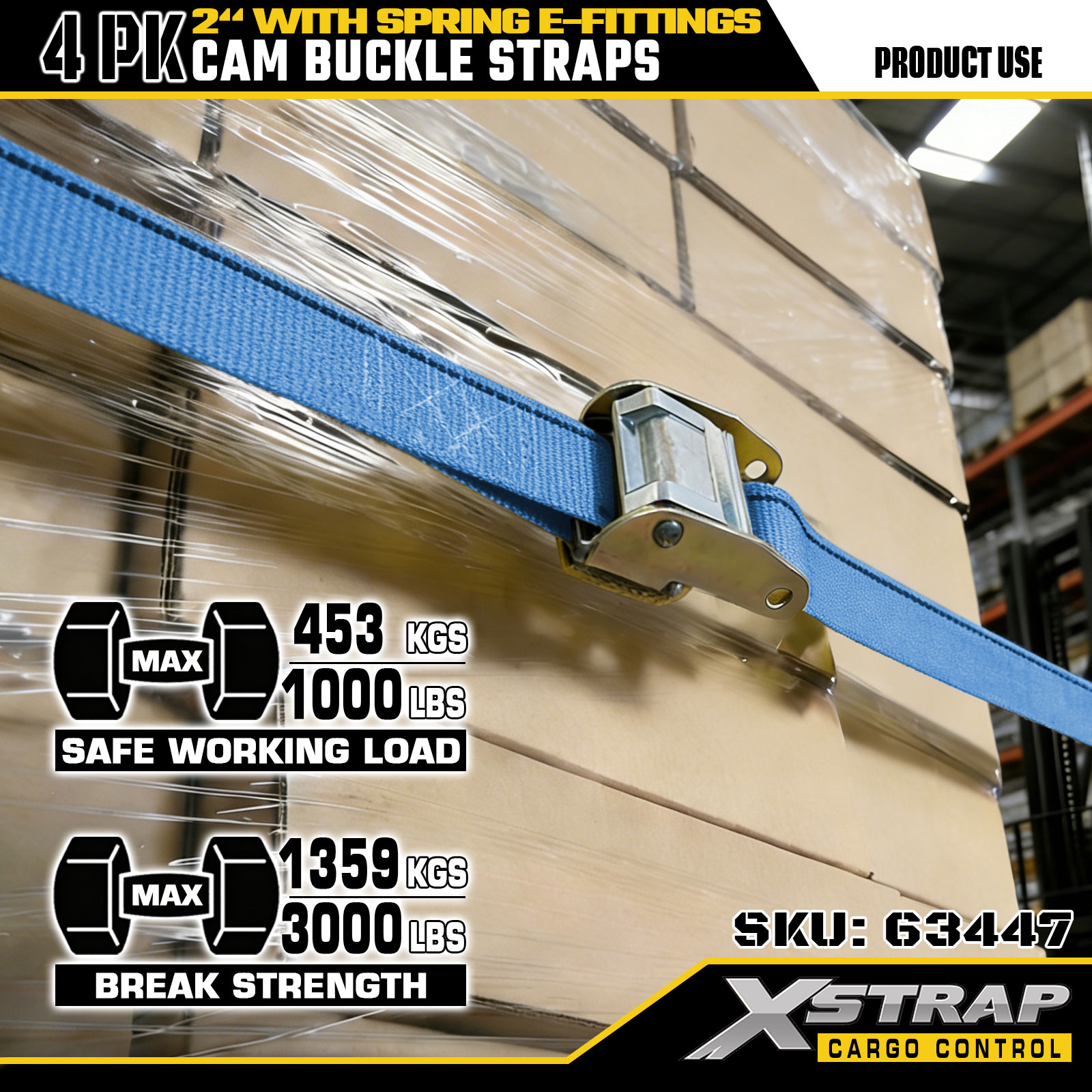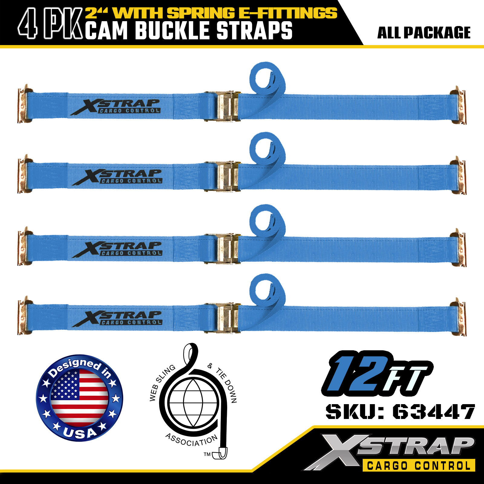 Xstrap 63447 4 Paket Tali Ratchet Biru 2" x 12' dengan E-Fitting Pegas & Kait F, SWL 733 lbs & Kekuatan Putus 332 lbs untuk Kontrol Kargo, Pemindahan & Transportasi