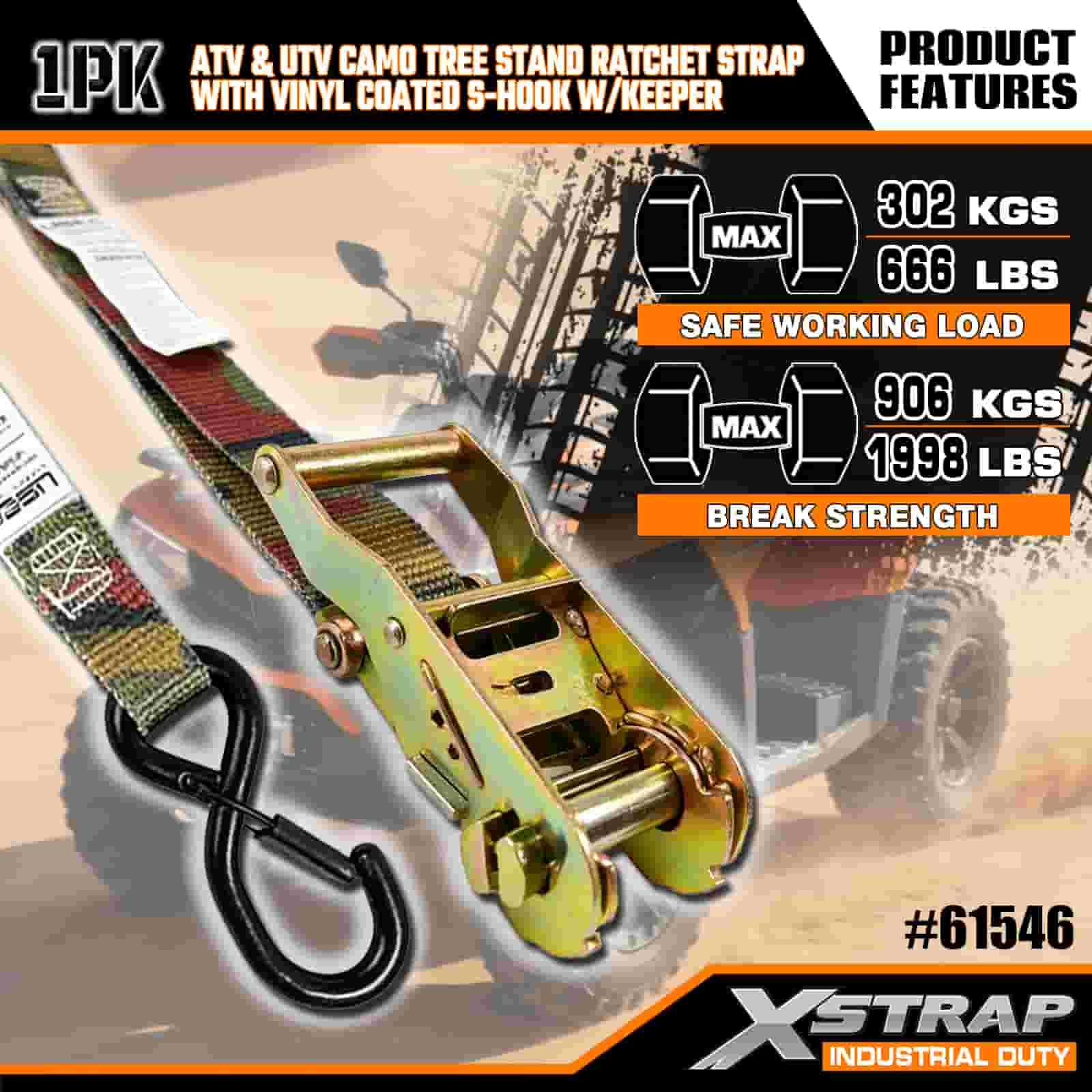- Blend In, Lock In:Desain kamuflase memungkinkan tali menyatu dengan lingkungan luar ruangan, sementara jahitannya yang diperkuat dan ratchet tugas berat menjaga ATV, dudukan pohon, atau sepeda motor Anda tetap terkunci rapat. Tidak perlu lagi khawatir memindahkan beban di medan yang berat.
