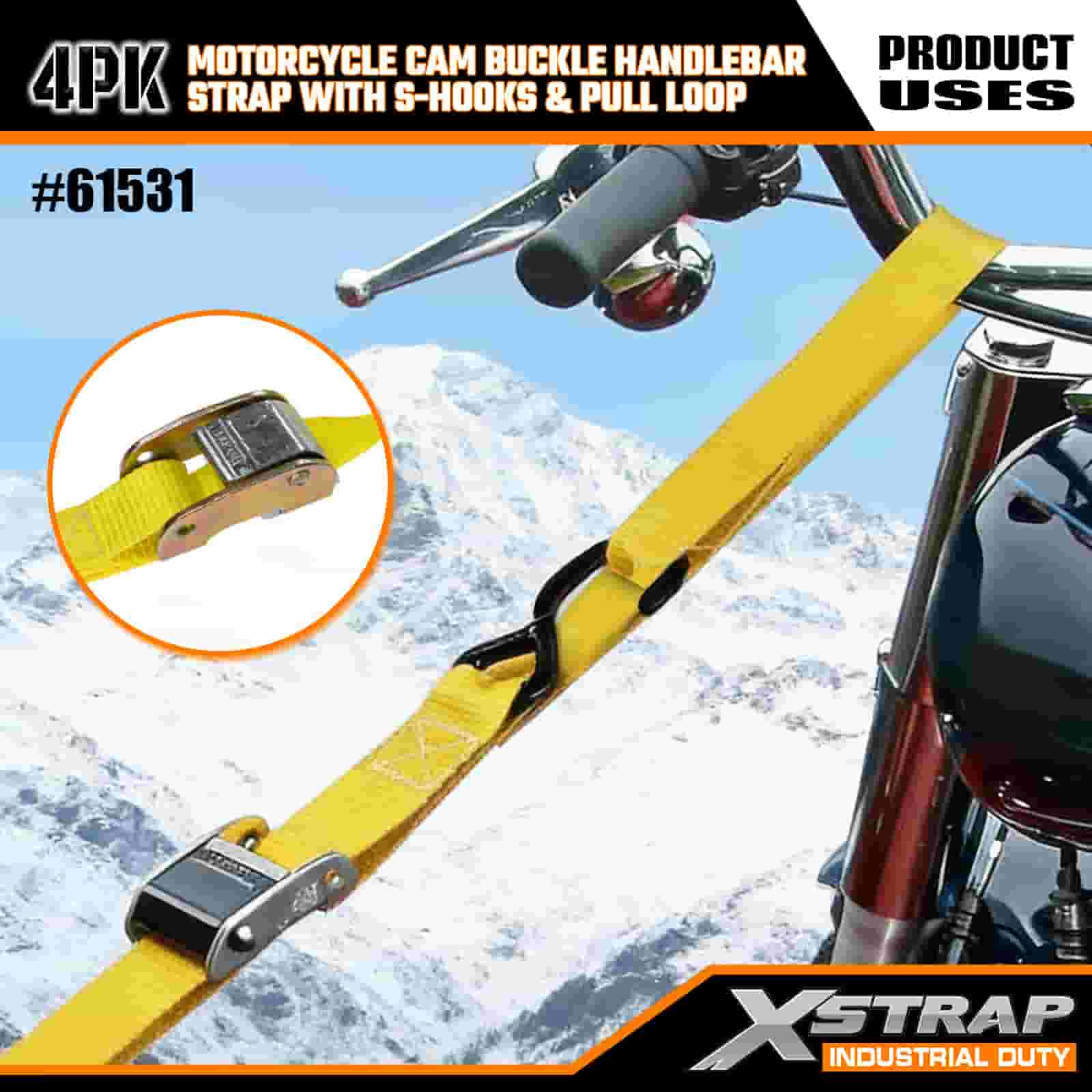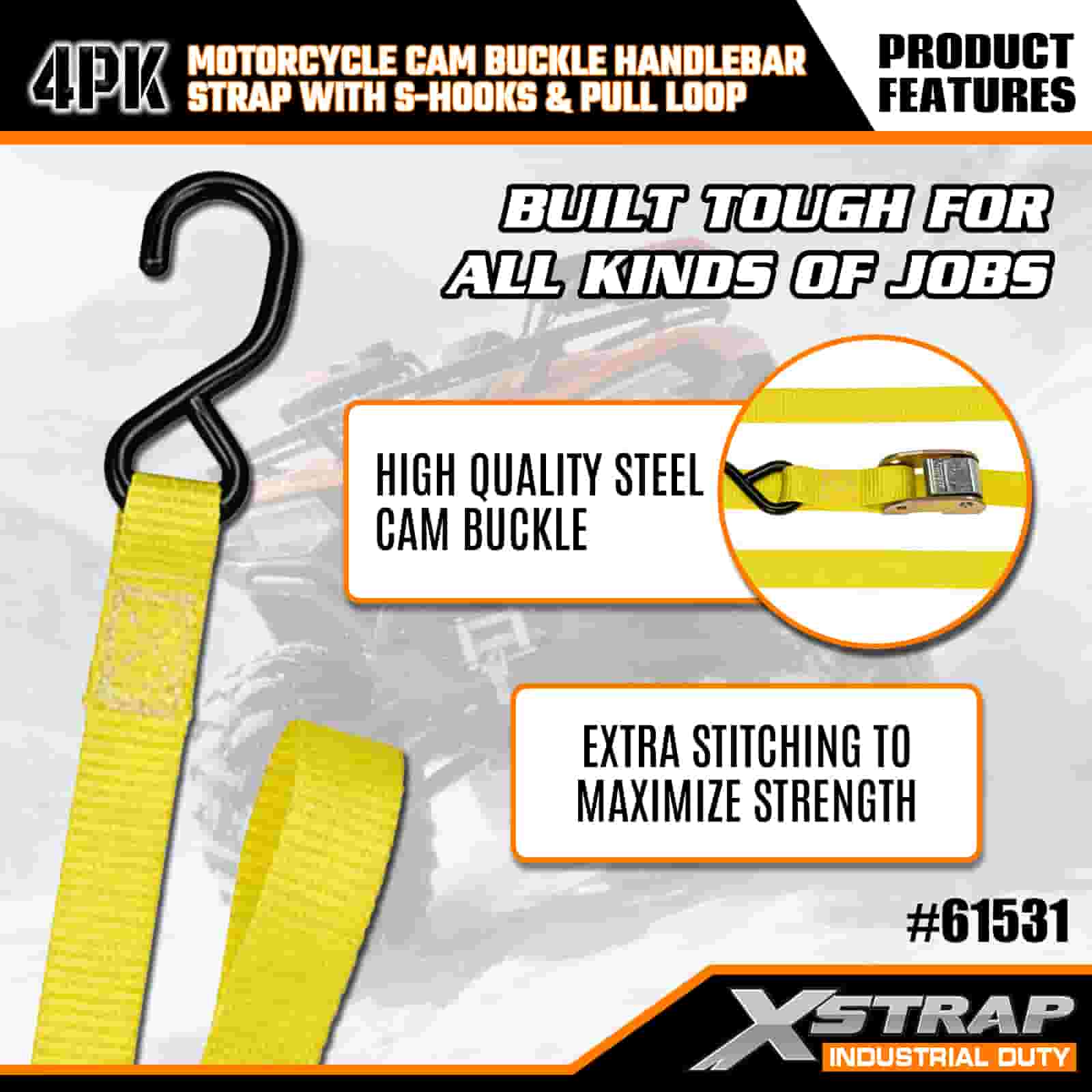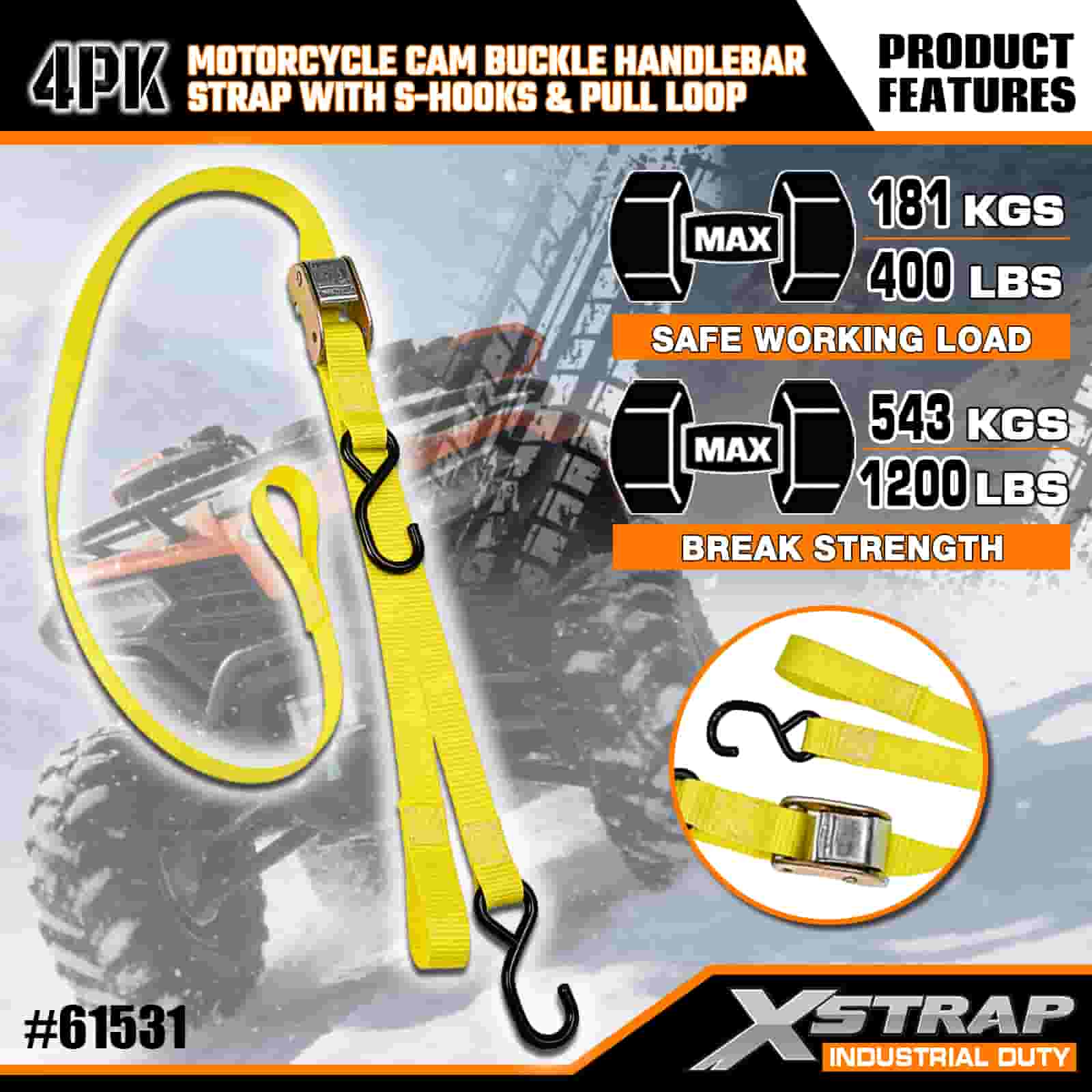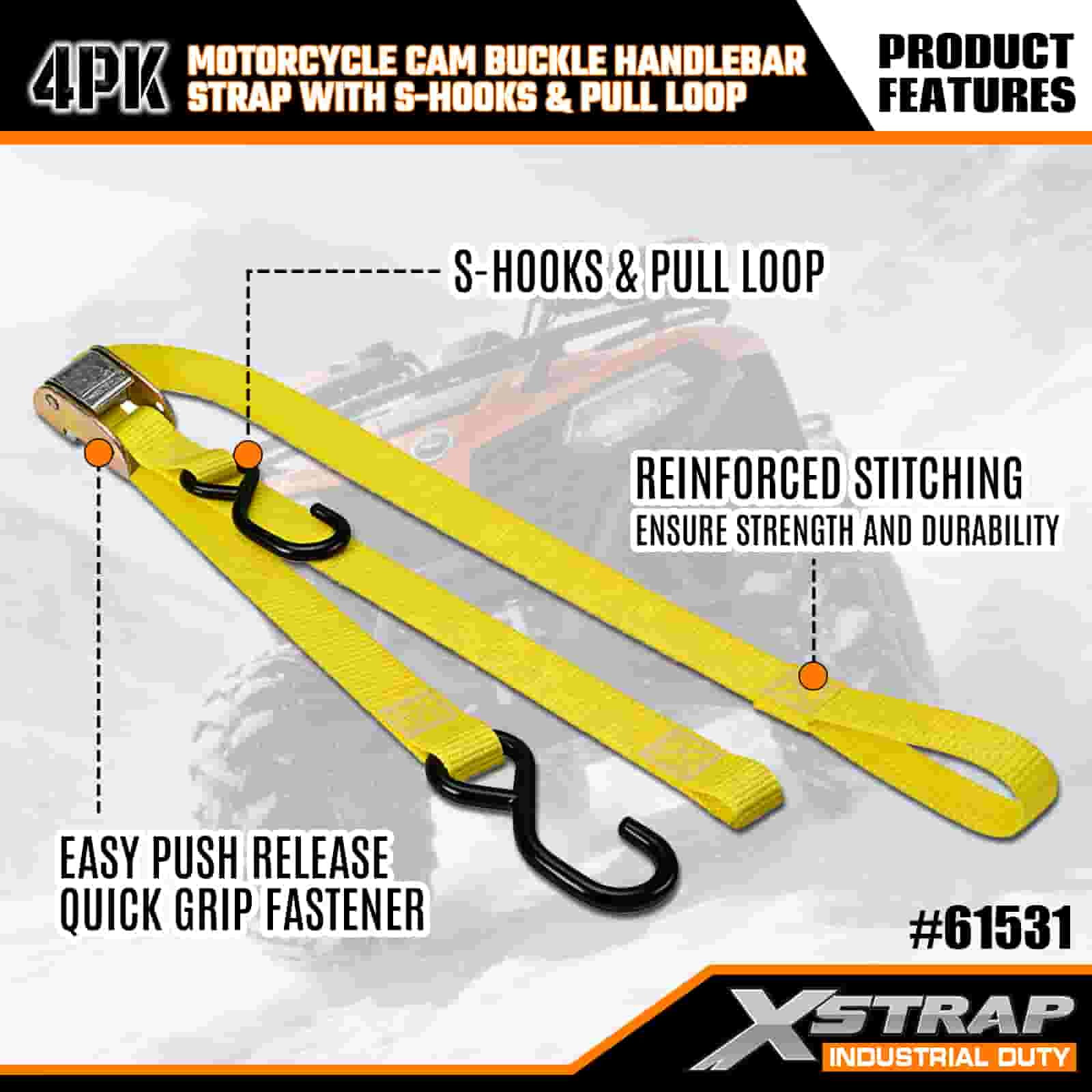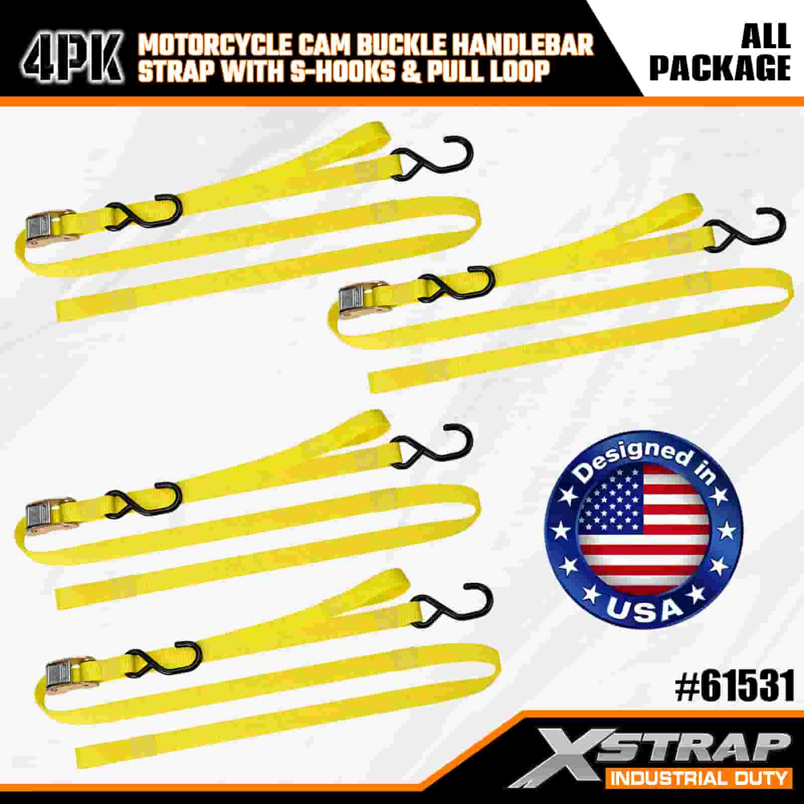 Xstrap 4PK Tali Stang Gesper Cam Sepeda Motor dengan Kait S & Lingkaran Tarik, Tali Pengikat Poliester 1” x 6' Tali Gesper Cam Tarik, Tali Pengaman Kargo Kapasitas 400lbs dengan Kait S untuk Profesional Serius untuk Mengamankan Trailer Kargo, Trailer Tempat Tidur Datar, Perahu Ski, Mobil Kecil.