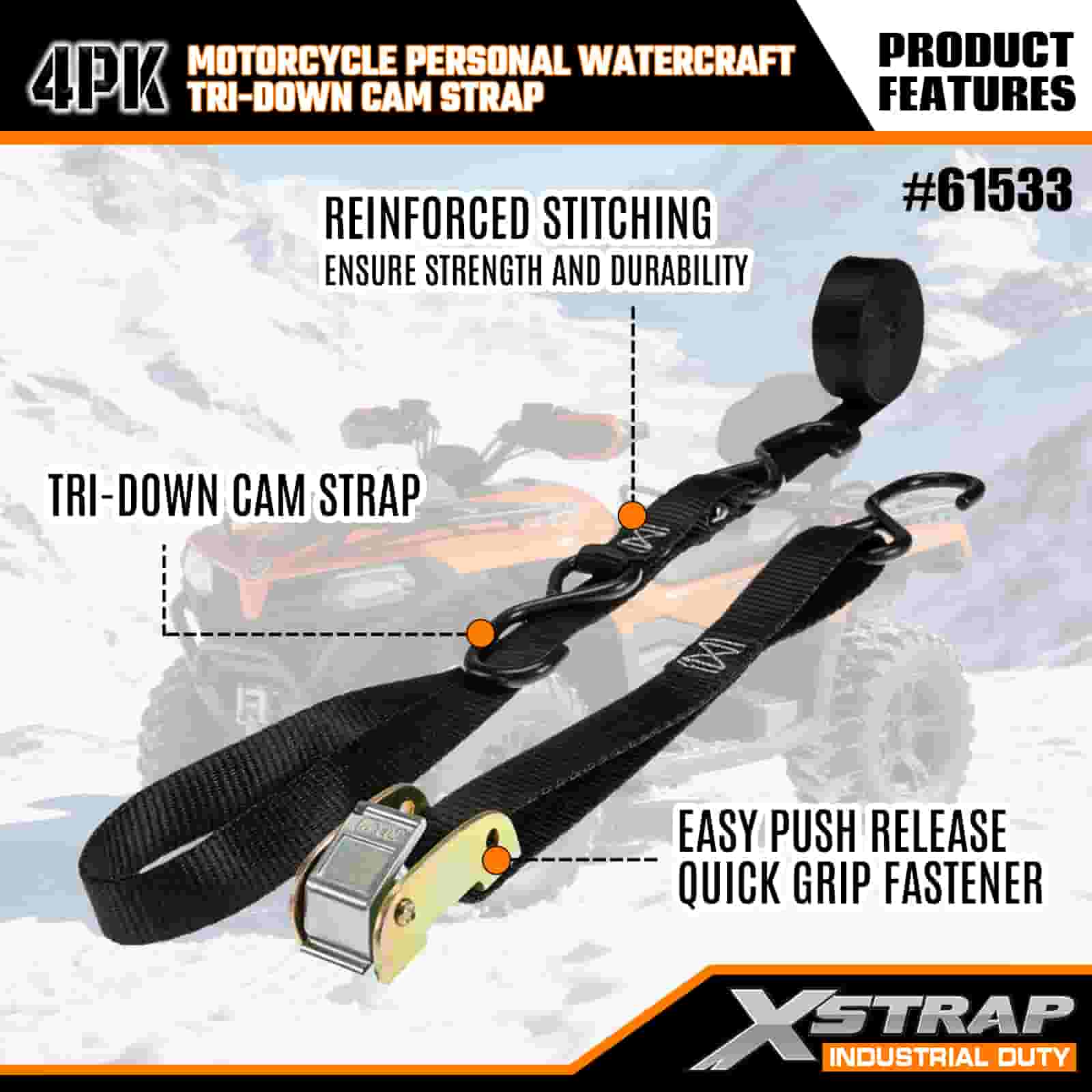 Xstrap 4PK Tali Cam Tri-Down Perahu Pribadi Sepeda Motor, Tali Pengikat Poliester 1” x 6' Tali Gesper Ratchet Tarik, Tali Pengaman Kargo Kapasitas 400lbs dengan Kait S untuk Profesional Serius untuk Mengamankan Trailer Kargo, Trailer Tempat Tidur Datar, Perahu Ski, Mobil Kecil.