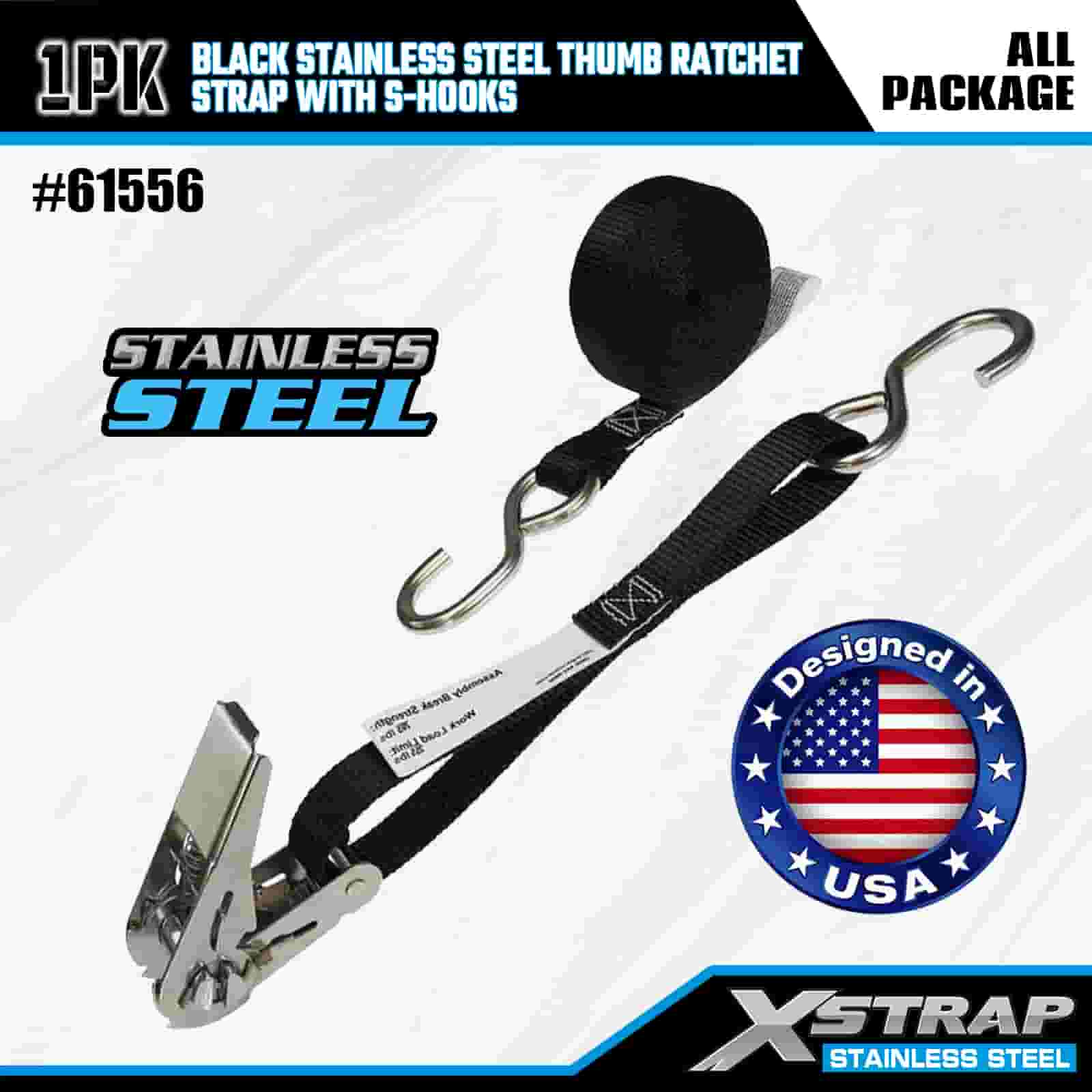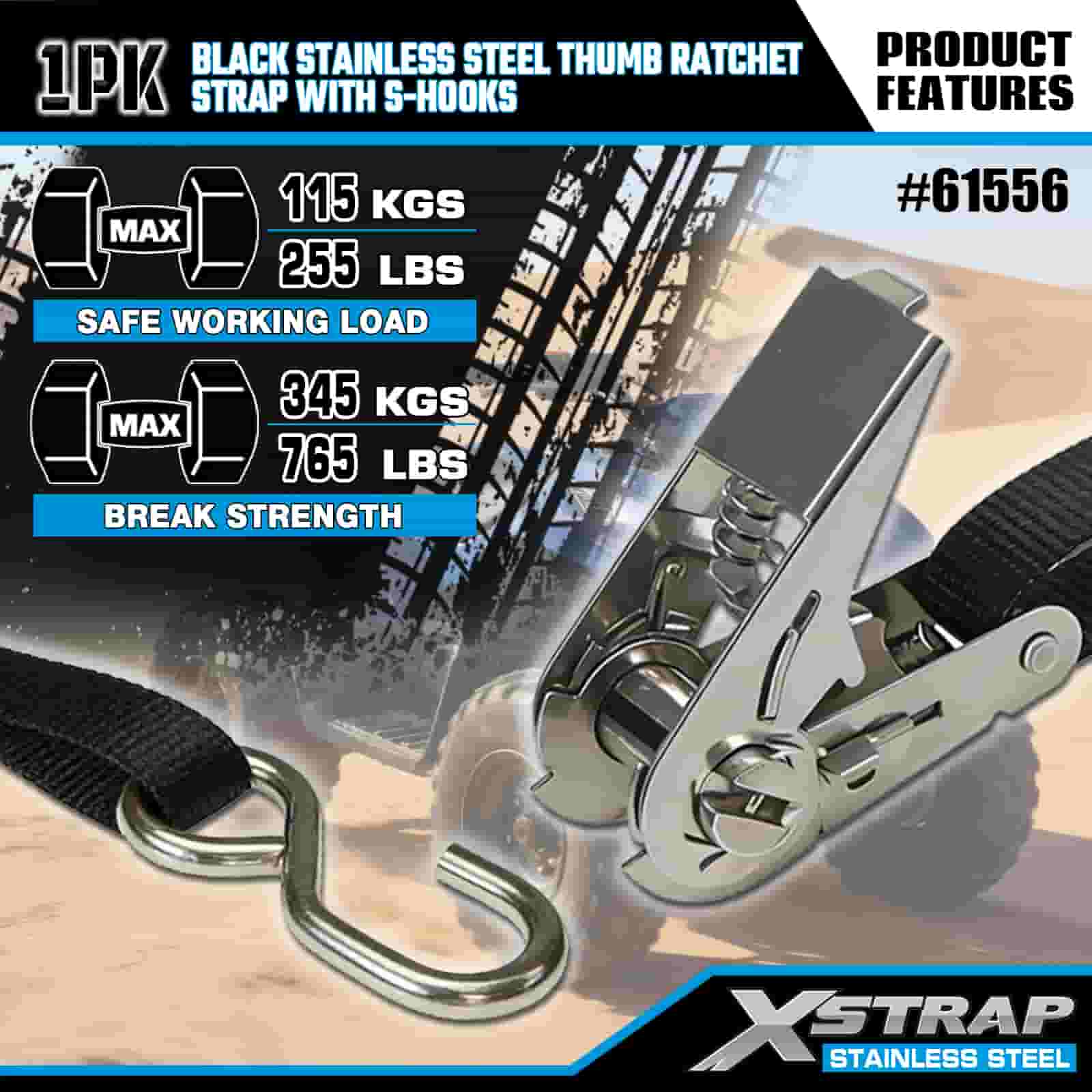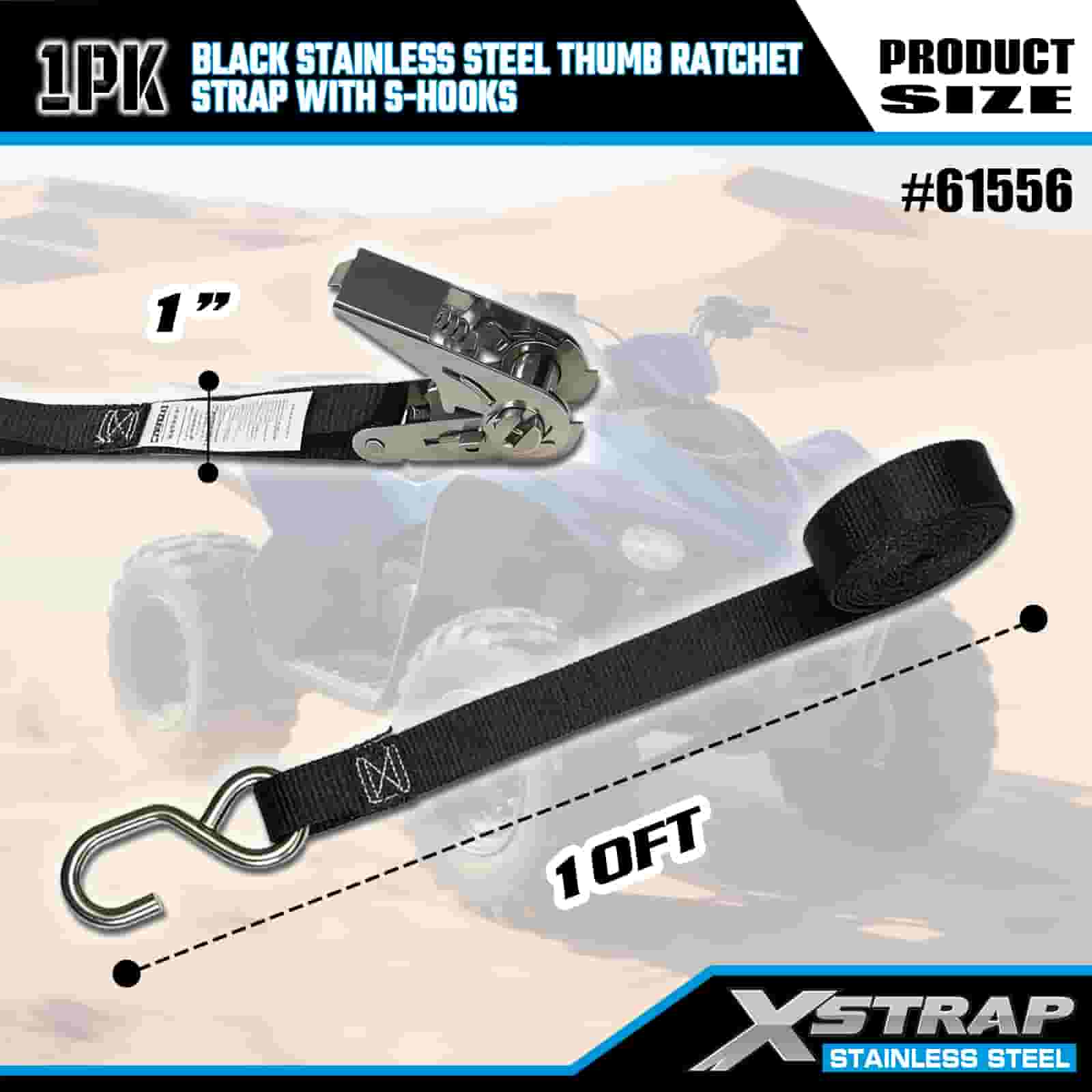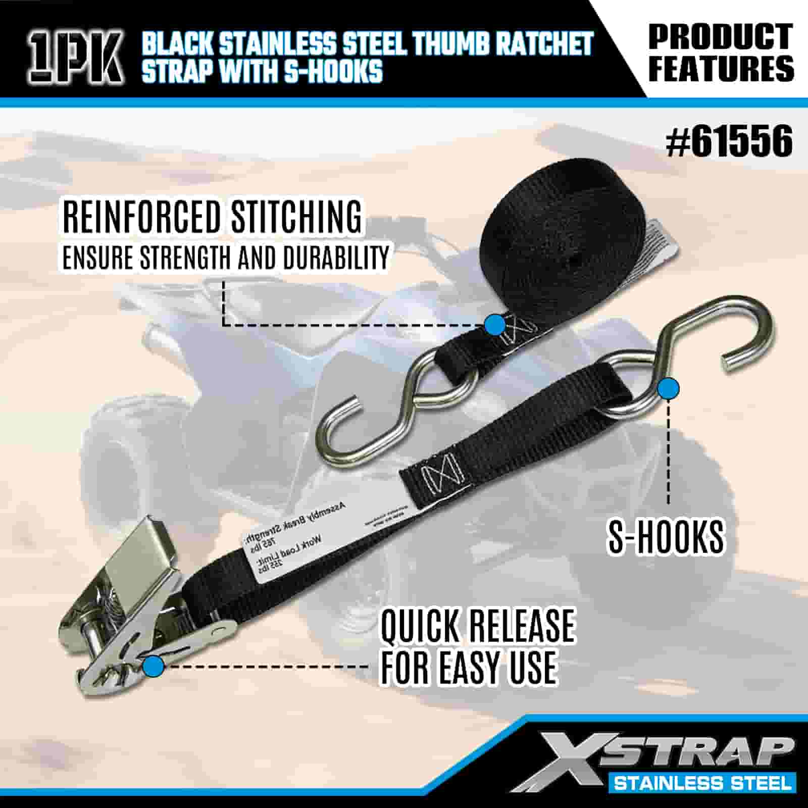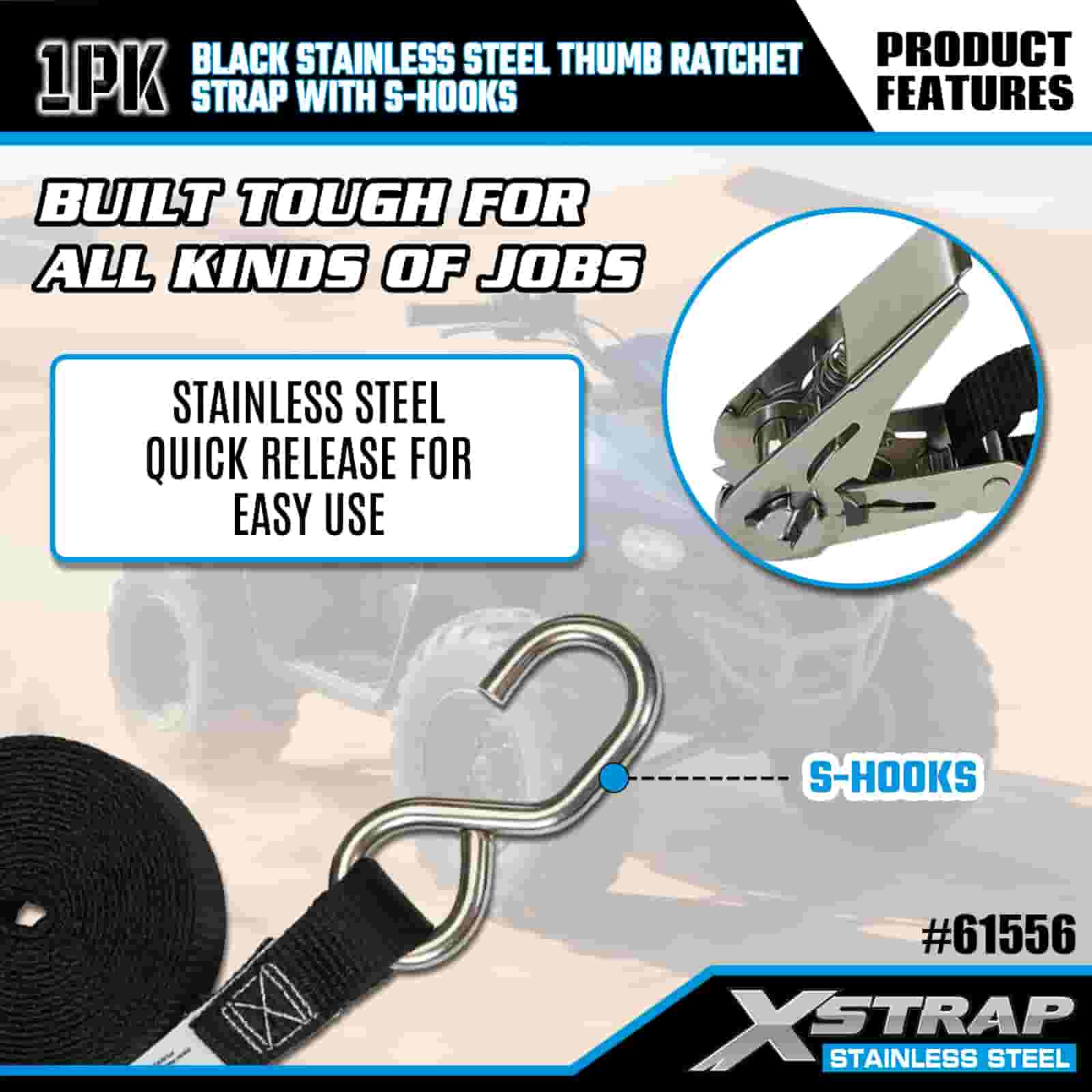 Xstrap Ratchet Jempol Baja Tahan Karat Hitam dengan Kait S, Tali Ratchet Tali Pengikat Poliester 1” x 10’, Tali Pengaman Pengikat Kargo Kapasitas 255 pon dengan Kait S untuk Trailer, Perahu Ski Trailer Tempat Tidur Datar, Mobil Kecil, Alat Berat.