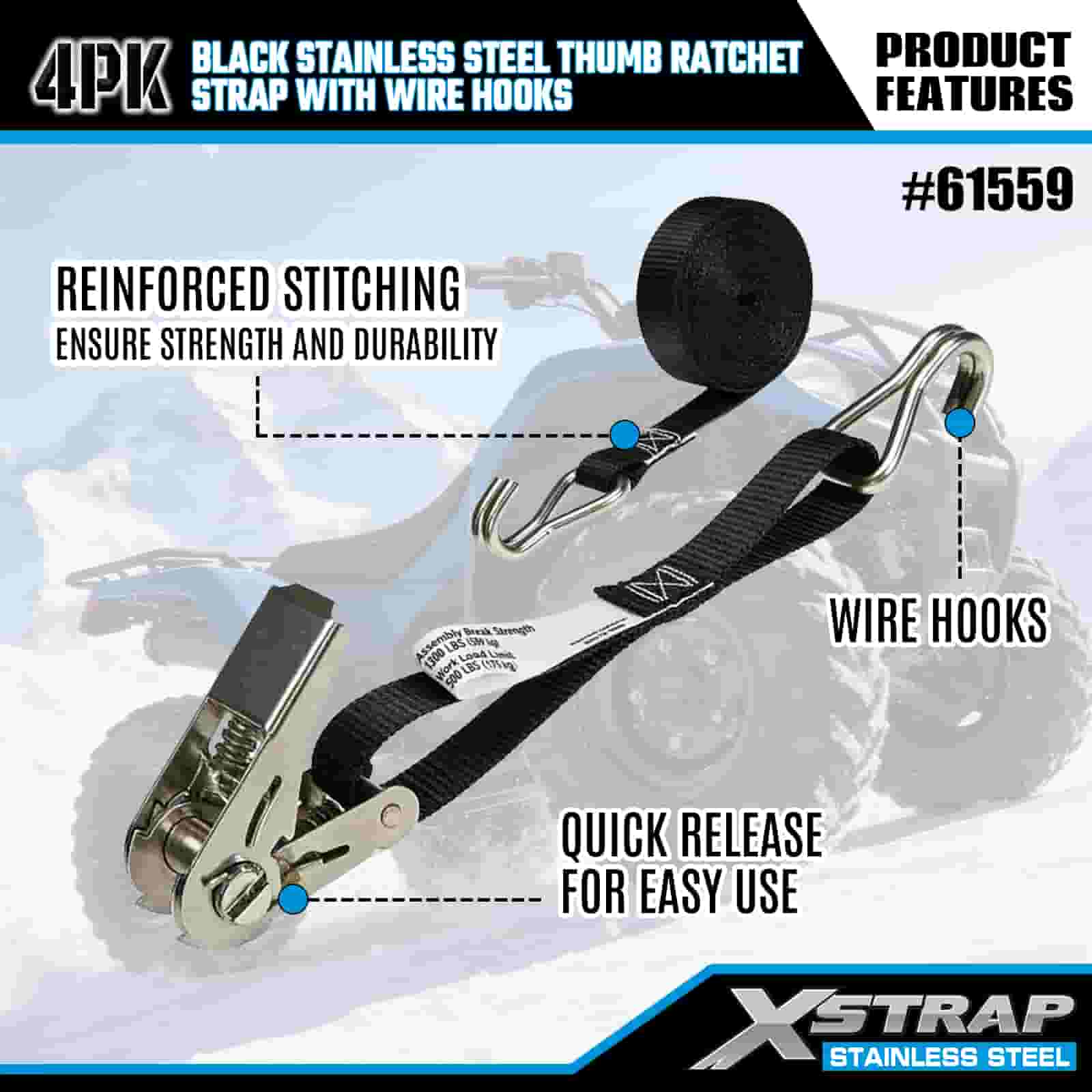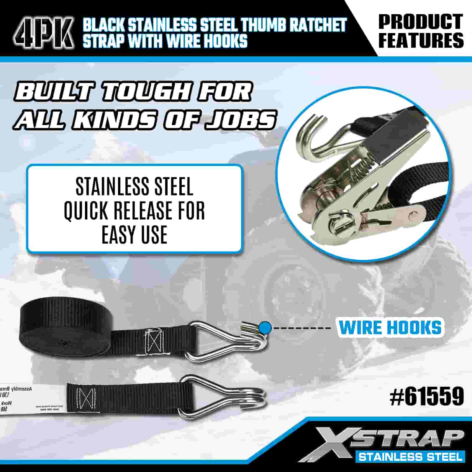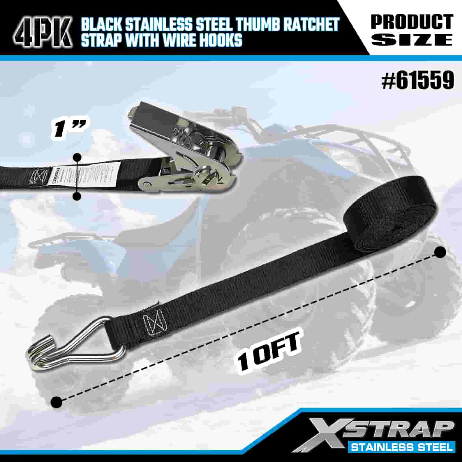 Xstrap 4PK Ratchet Jempol Stainless Steel Hitam dengan Kait Kawat, Tali Ratchet Tali Pengikat Poliester 1” x 10', Tali Pengaman Kargo Kapasitas 500lbs dengan Kait Kawat untuk Trailer, Perahu Ski Trailer Tempat Tidur Datar, Mobil Kecil, Alat Berat.