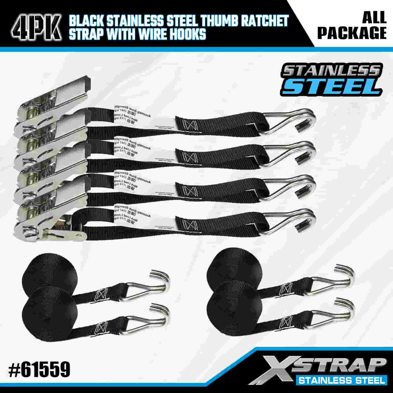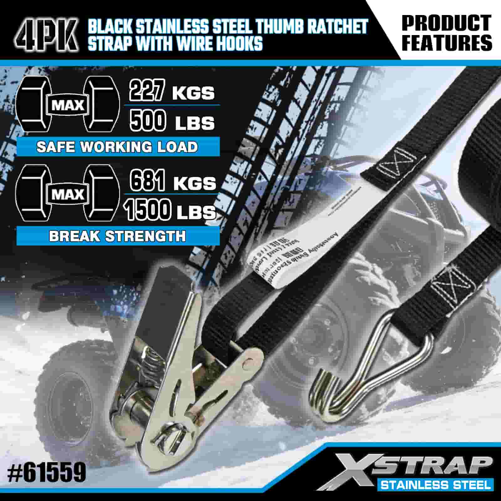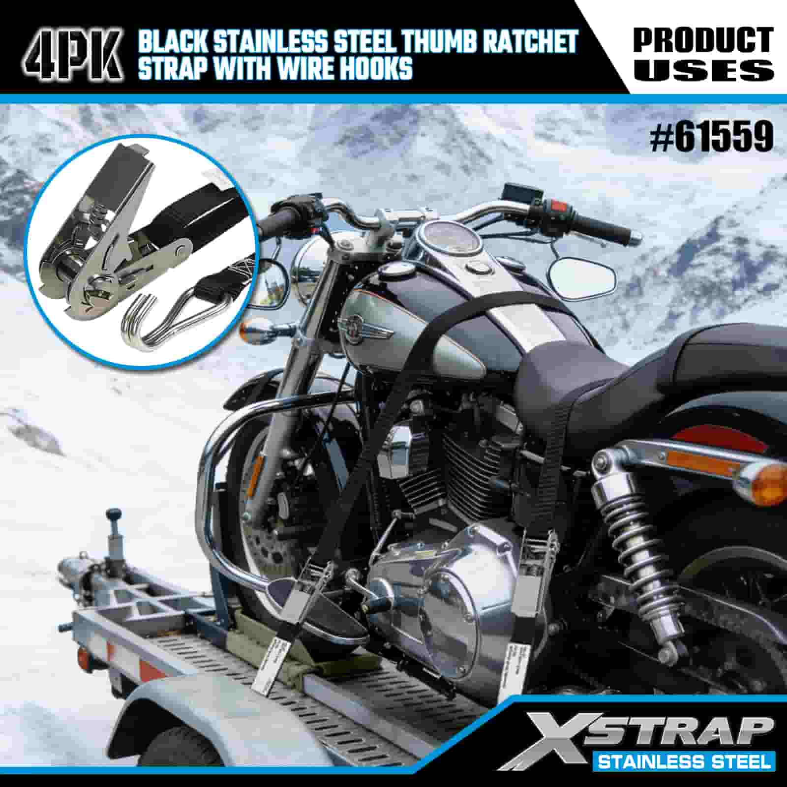 Xstrap 4PK Ratchet Jempol Stainless Steel Hitam dengan Kait Kawat, Tali Ratchet Tali Pengikat Poliester 1” x 10', Tali Pengaman Kargo Kapasitas 500lbs dengan Kait Kawat untuk Trailer, Perahu Ski Trailer Tempat Tidur Datar, Mobil Kecil, Alat Berat.