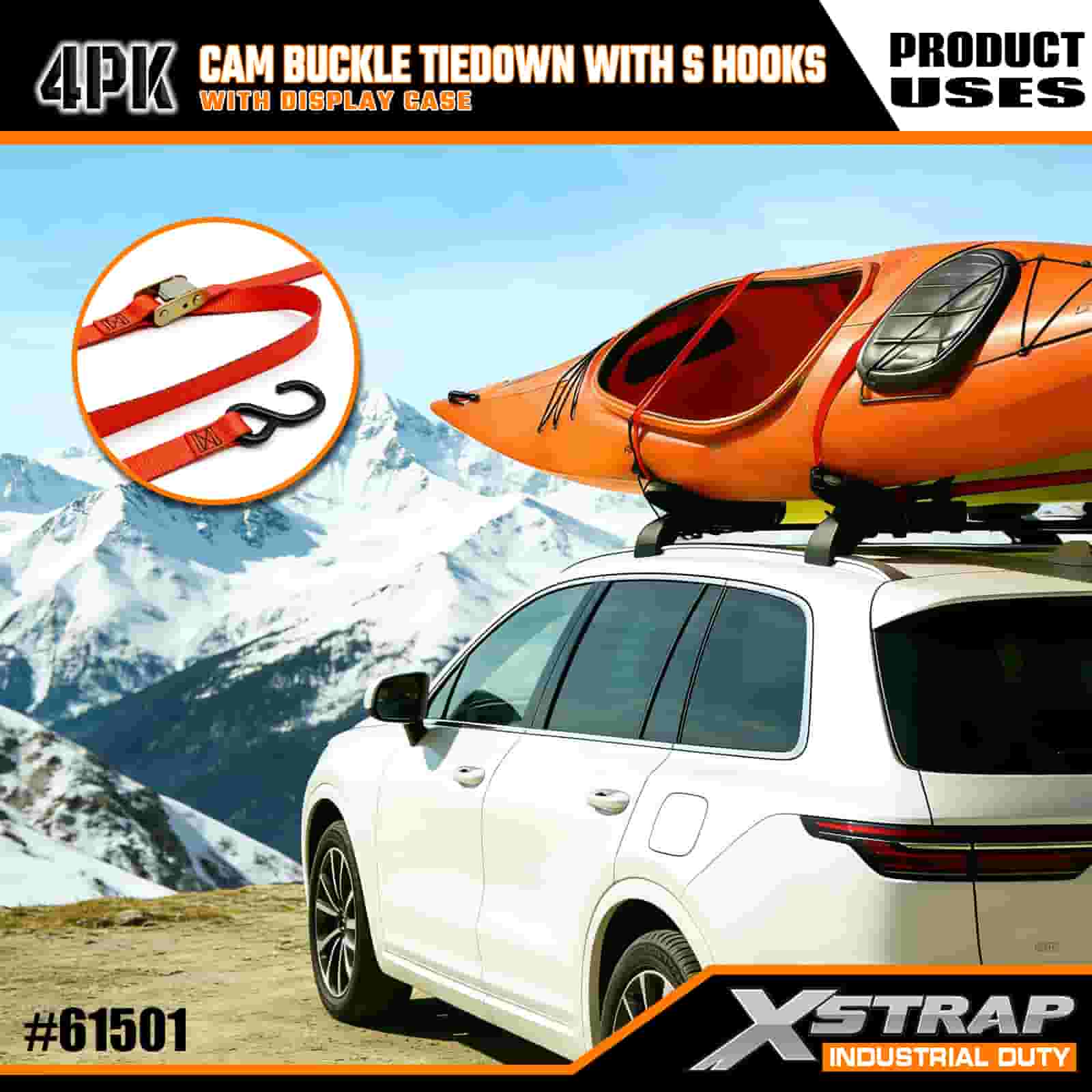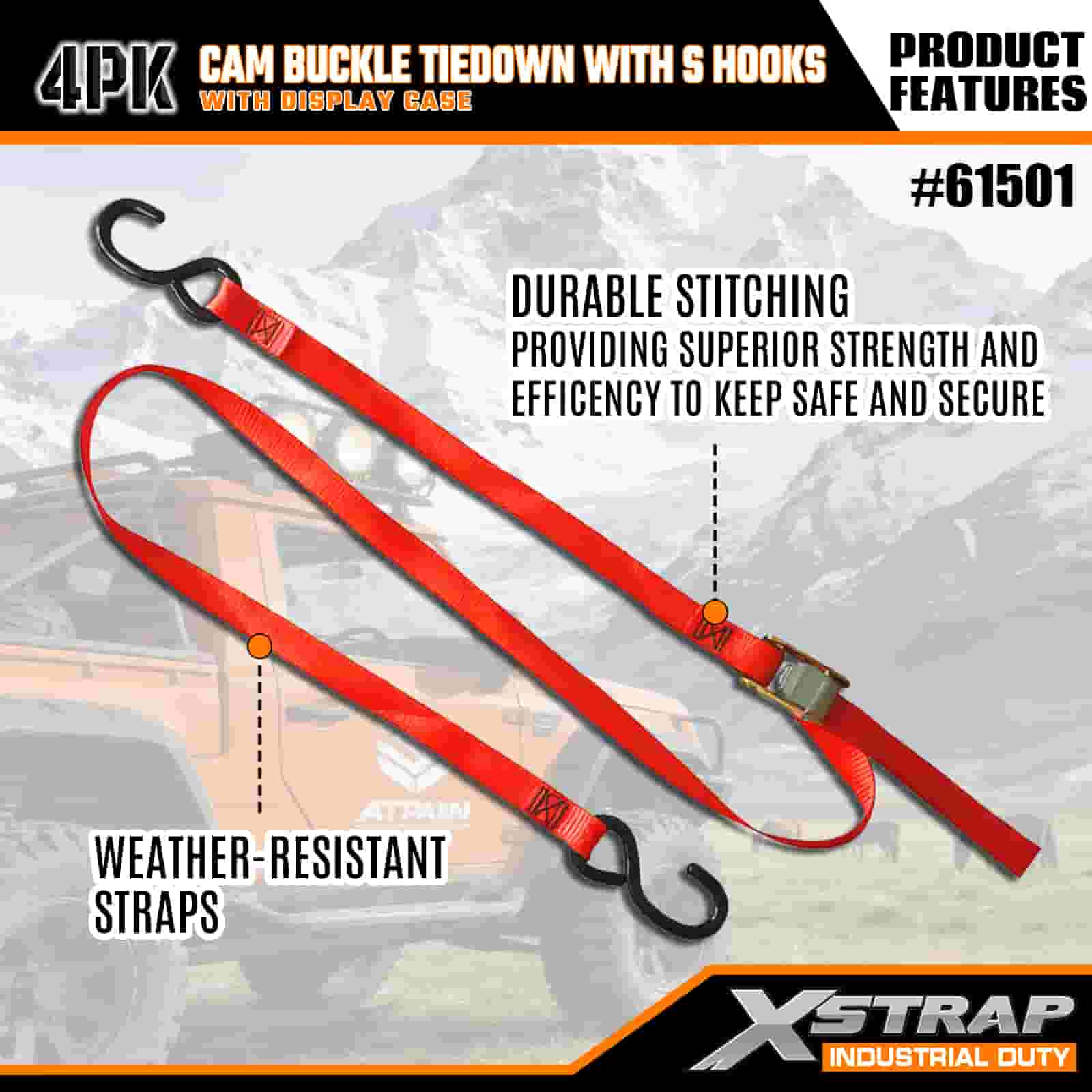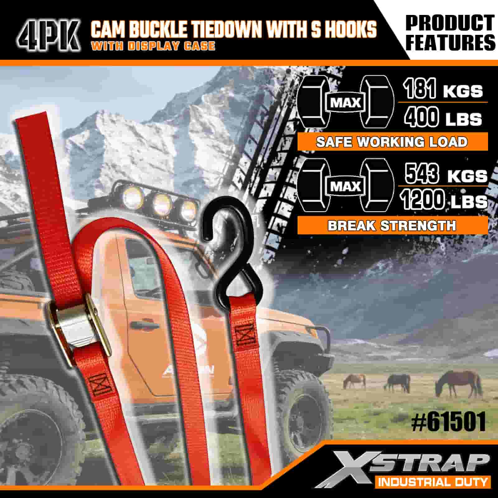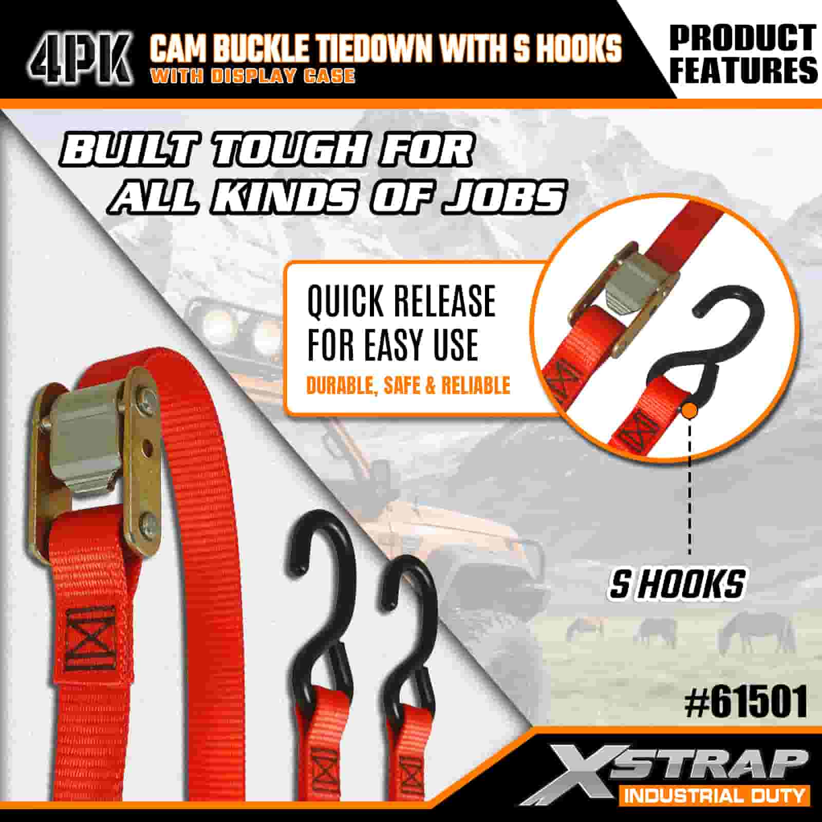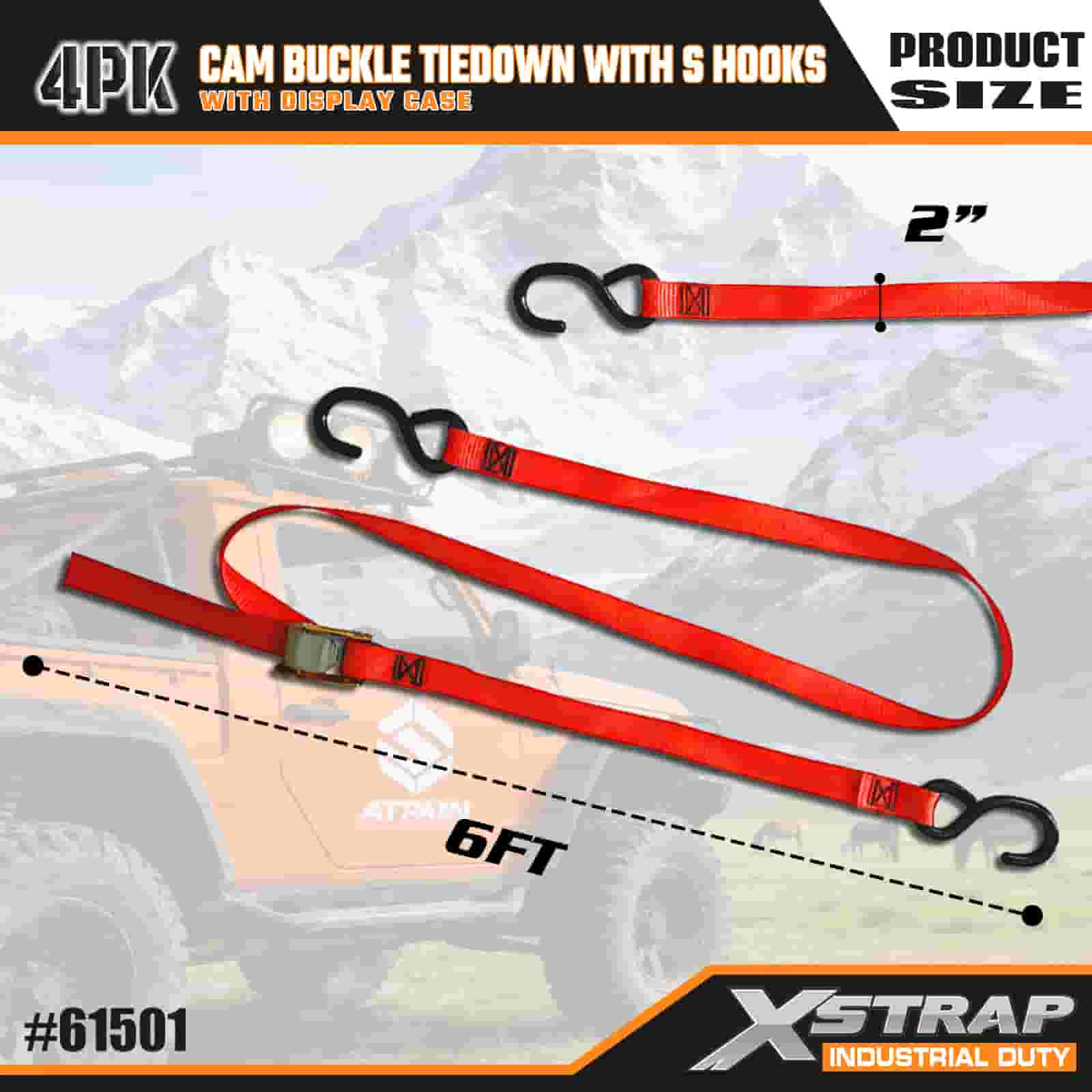 Xstrap 4 Pack Cam Buckle Tie Down dengan S Hooks, 2” x 6' Polyester Tie Down Strap dengan Cam Buckle, Tali Pengaman Kargo Kapasitas 400lbs dengan Kait S untuk Profesional Serius untuk Mengamankan Trailer Kargo, Trailer Tempat Tidur Datar, Perahu Ski, Mobil Kecil.