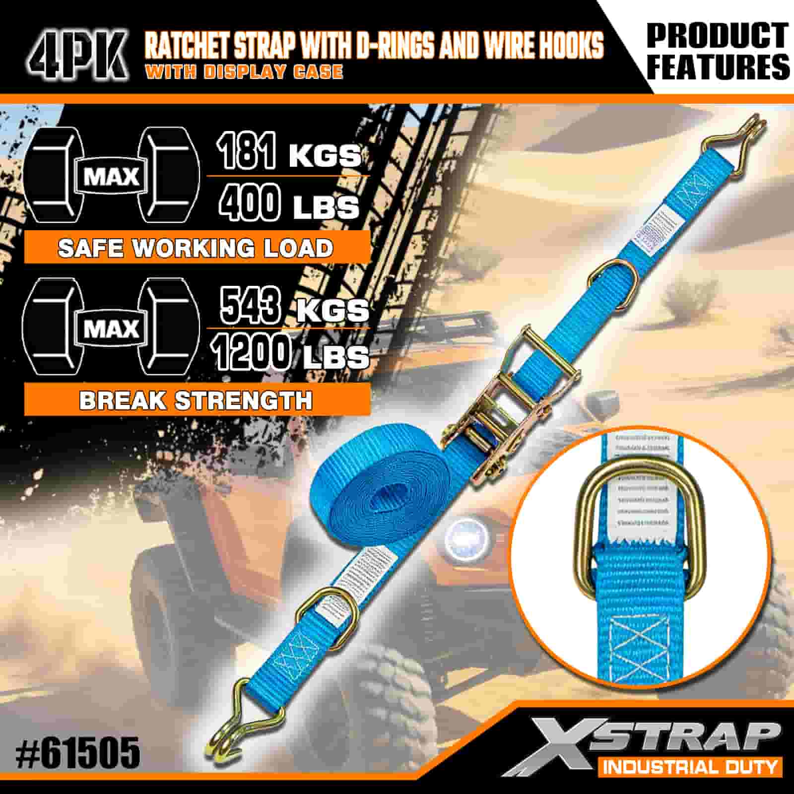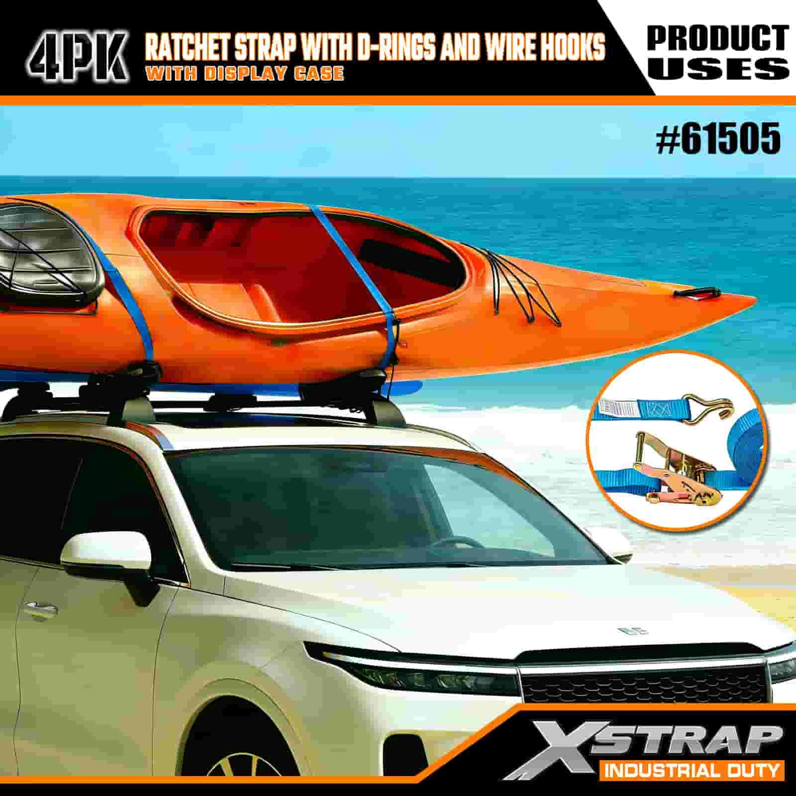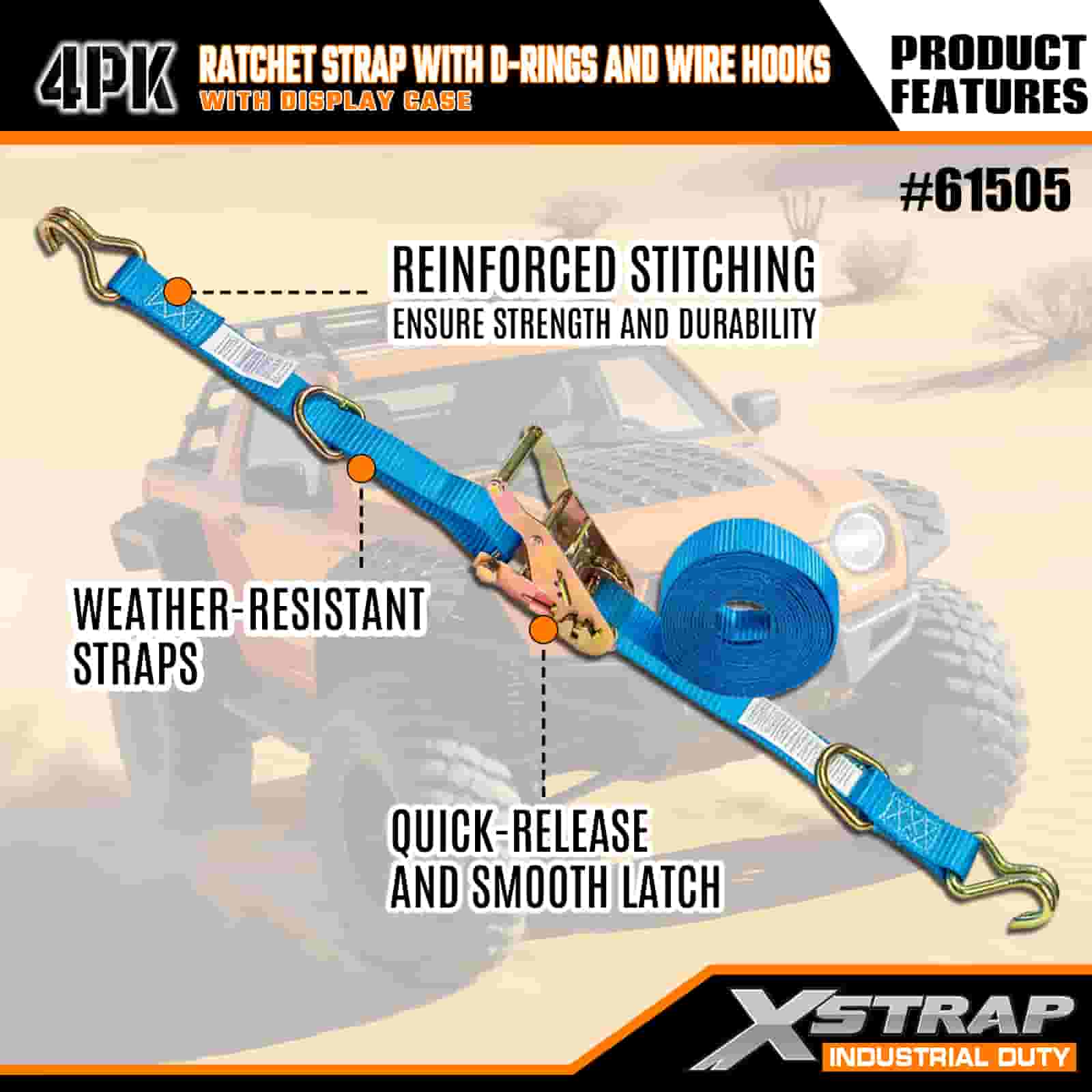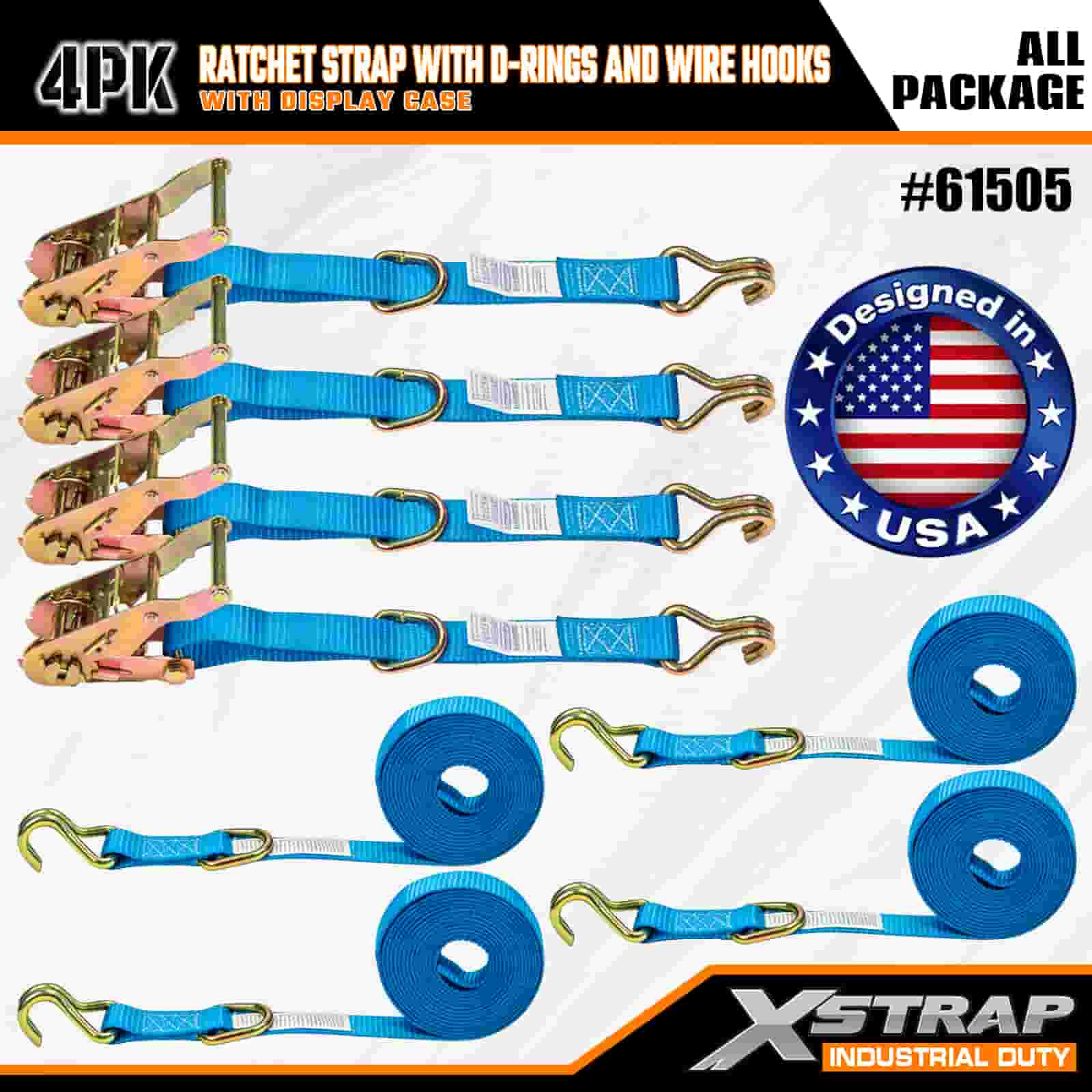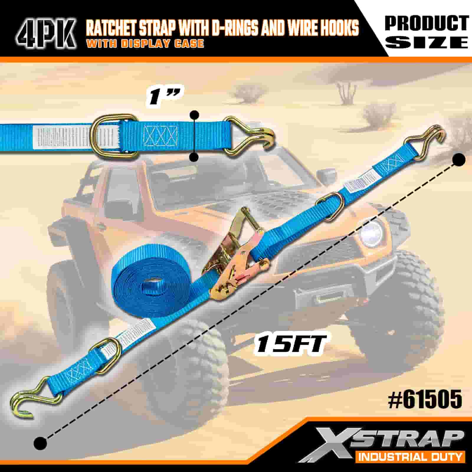 Xstrap 4 Pack Cam Buckle Tie Down dengan D-Ring dan Wire Hooks, 1” x 15' Polyester Tie Down Strap Pull Ratchet Strap, Tali Pengaman Kargo Kapasitas 400lbs dengan Kait Kawat untuk Profesional Serius untuk Mengamankan Trailer Kargo, Trailer Tempat Tidur Datar, Perahu Ski, Mobil Kecil.