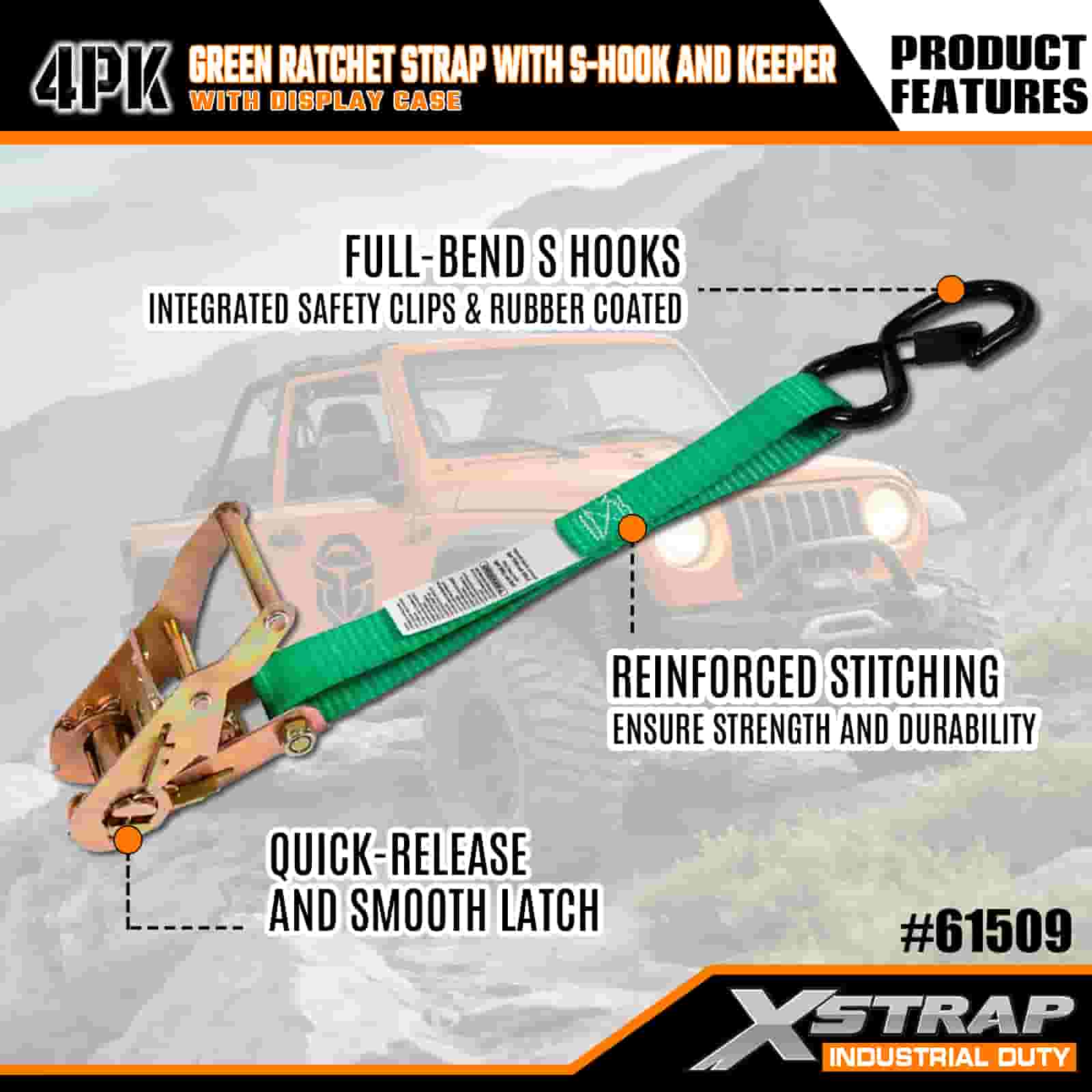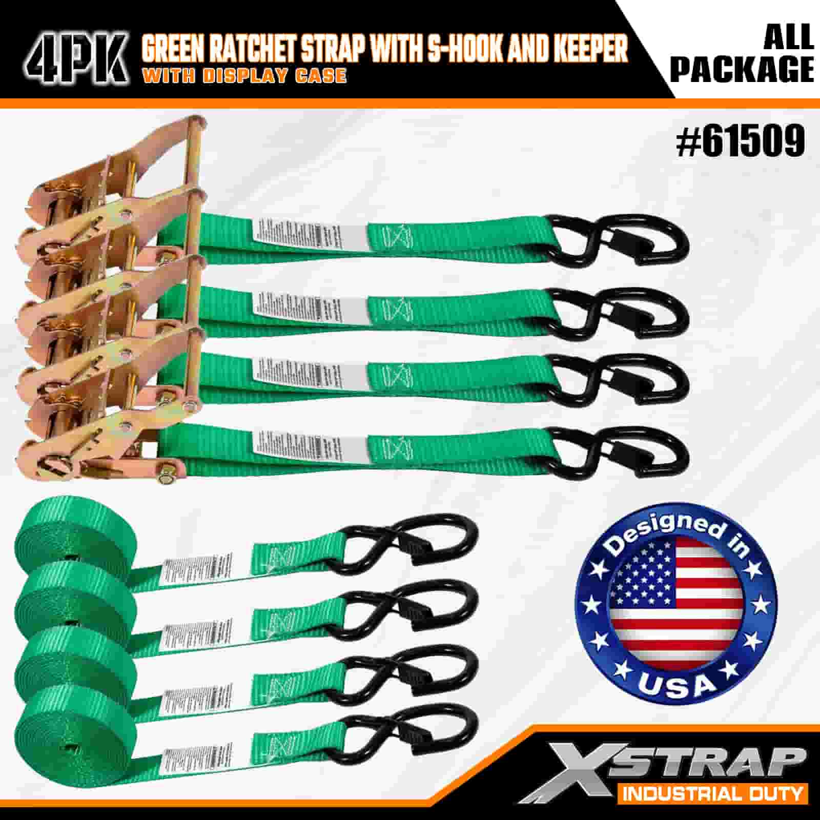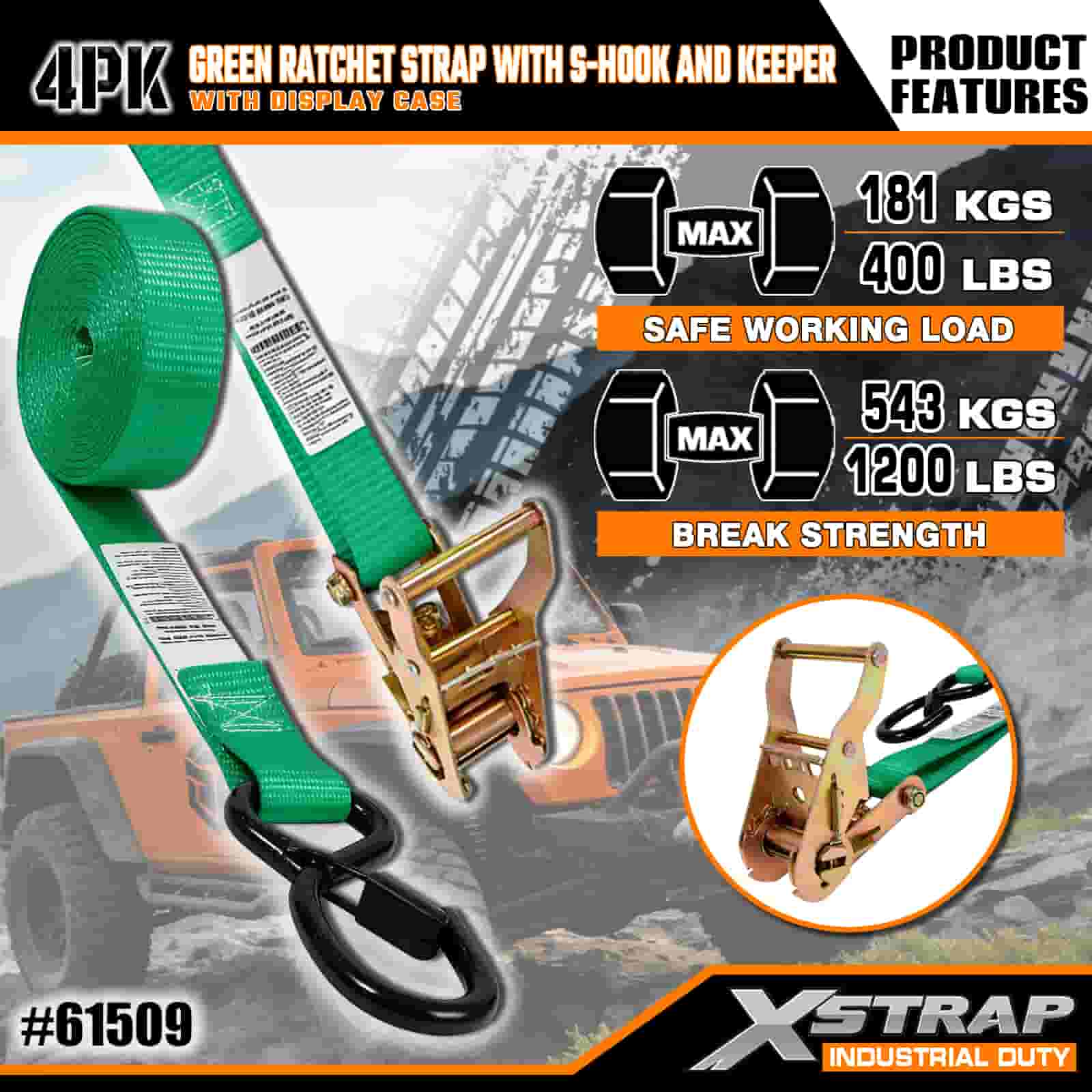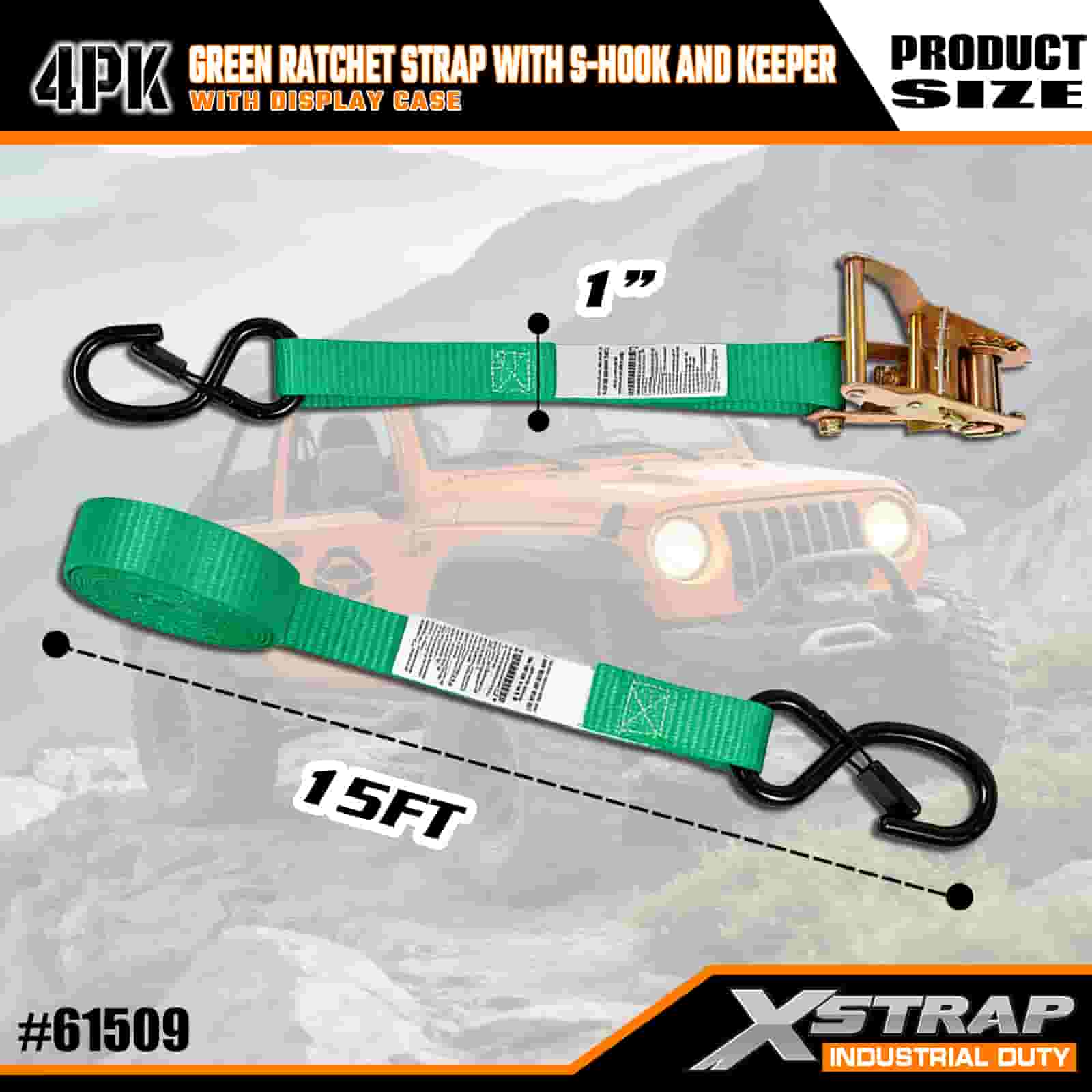 Xstrap 4 Paket Tali Ratchet dengan Kait Pengaman S, Tali Pengikat Tarik Poliester 1” x 15' Tali Ratchet Tarik, Tali Pengaman Kargo Kapasitas 400lbs dengan Kait Pengaman S untuk Profesional Serius untuk Mengamankan Trailer Kargo, Trailer Tempat Tidur Datar, Perahu Ski, Mobil Kecil.