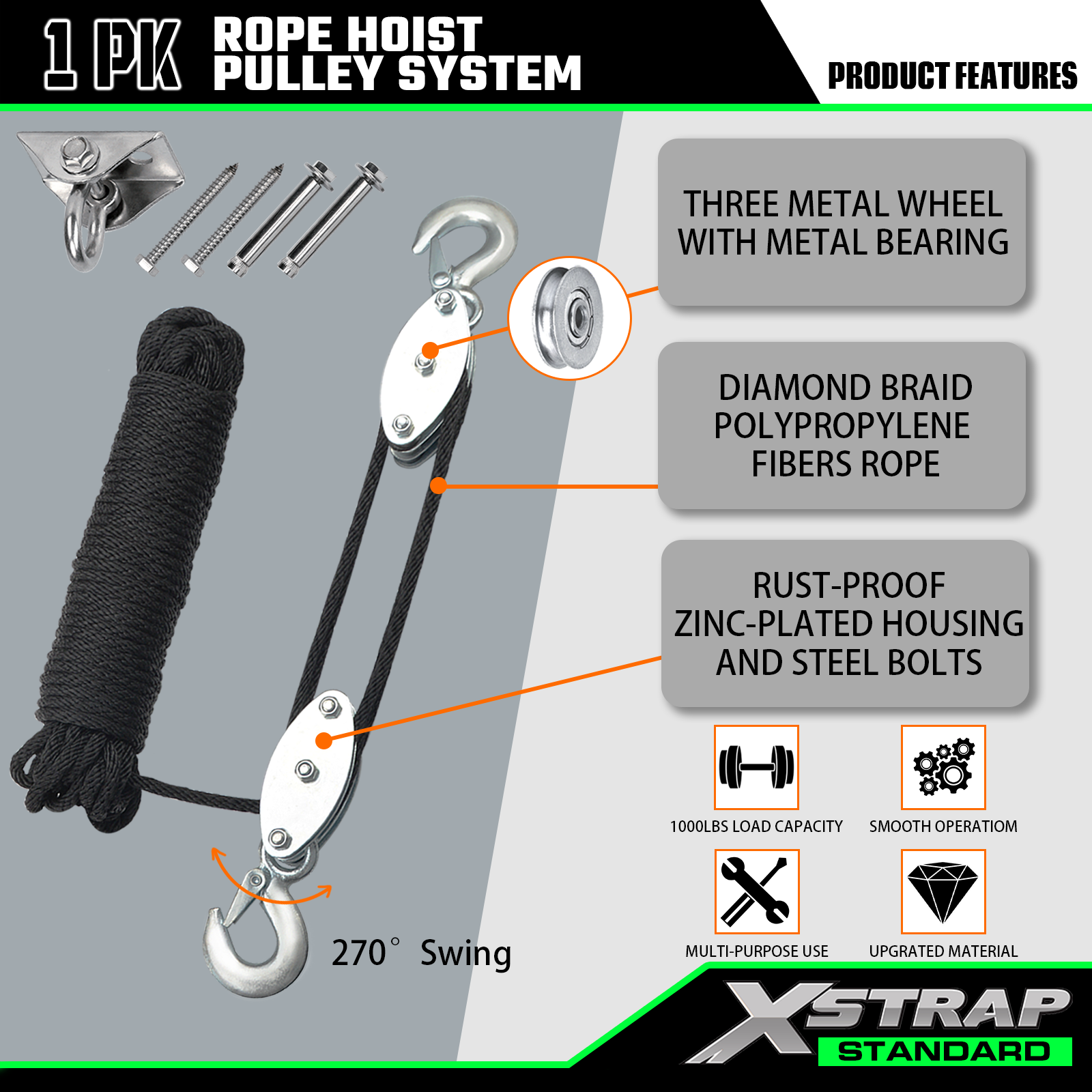Ini adalah Hoist Tali 50 Kaki STANDAR XSTRAP kami, Blok Roda 2000LB Tugas Berat, dan Sistem Katrol Tackle untuk Mengangkat Benda Berat dengan Sarung Tangan Kerja, 2 pcs Soft Loops, 1 Gantungan Ayun untuk Gudang Garasi.