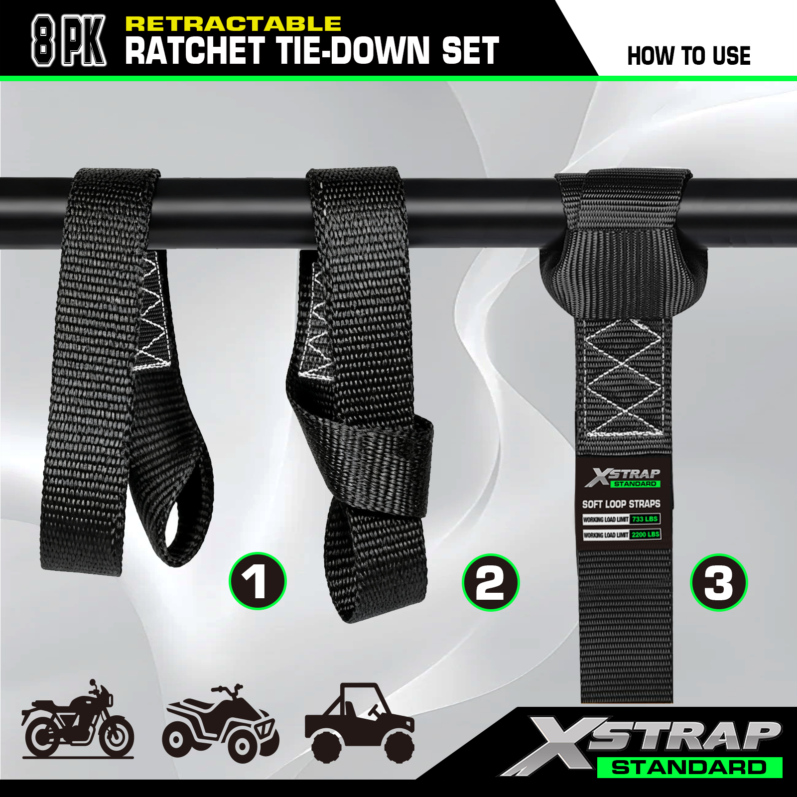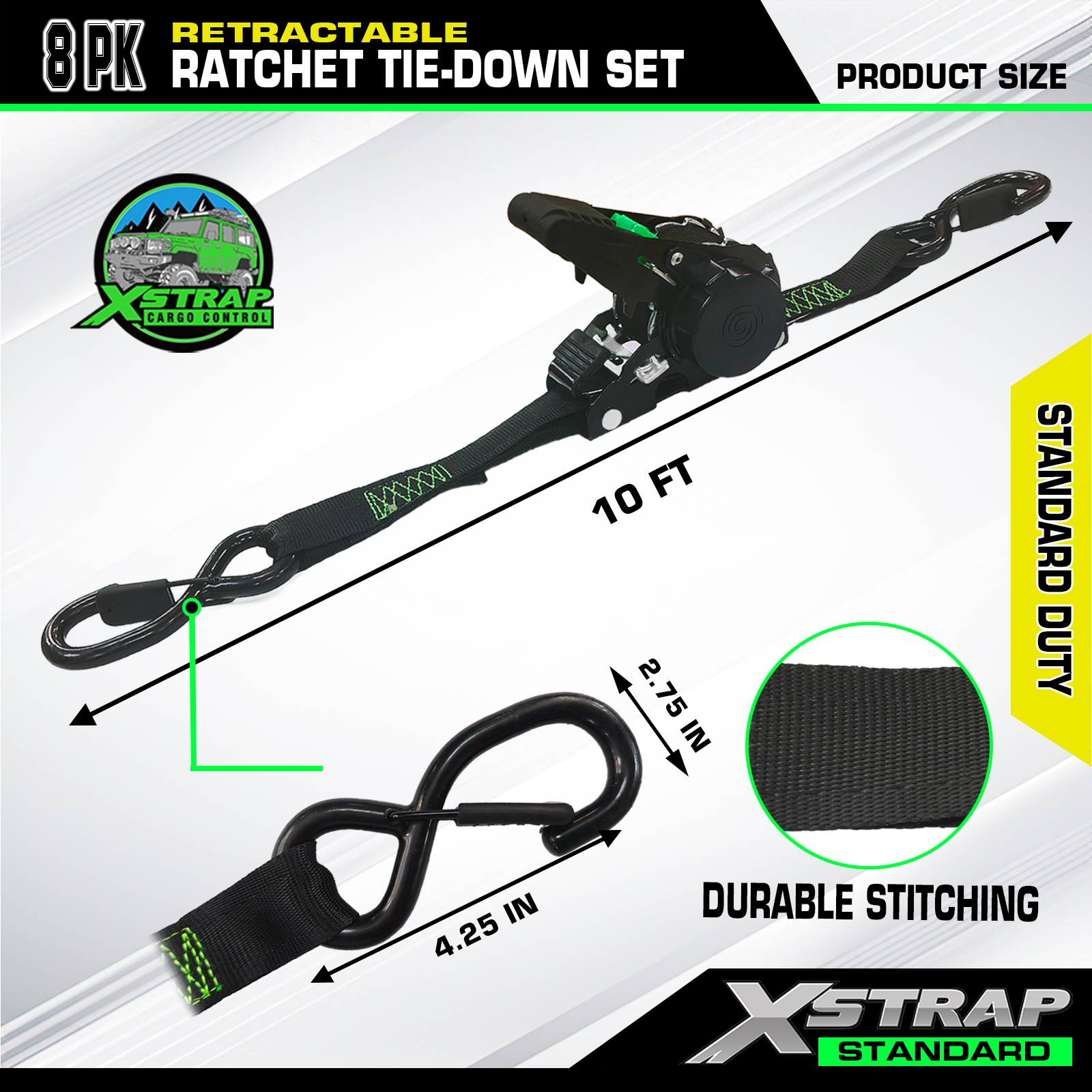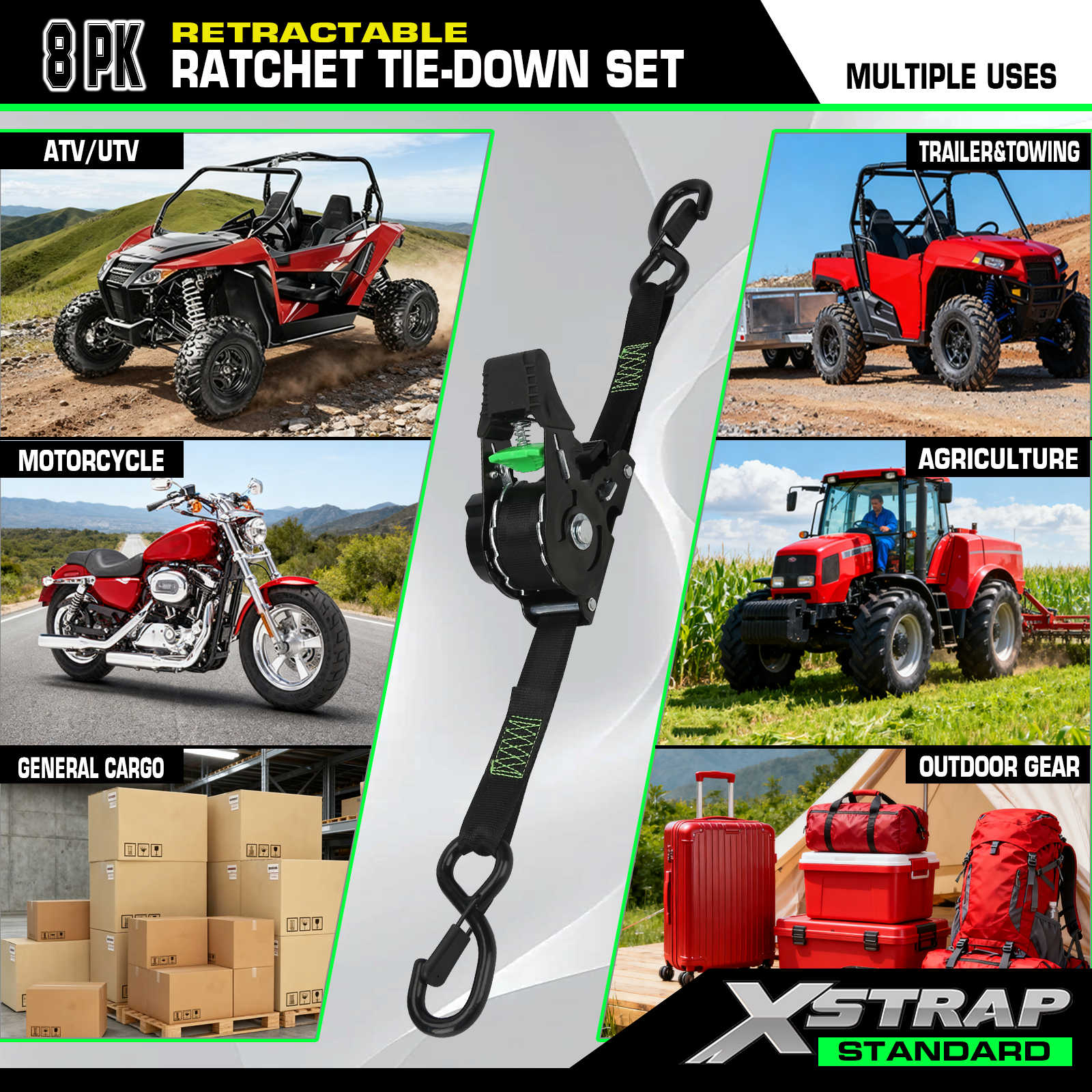 Tali ratchet yang dapat ditarik dilengkapi dengan mekanisme retraksi otomatis bawaan, yang memungkinkan tali dapat ditarik kembali dengan mulus ke dalam wadahnya setelah digunakan. Hal ini tidak hanya menjaga tali tetap rapi dan terlindungi, namun juga secara signifikan mengurangi waktu persiapan dan pembersihan. Anyaman poliester 10 kaki memberikan ketegangan yang kuat dan kekuatan yang dapat diandalkan untuk sepeda motor, ATV, sepeda, UTV. Pegangan ratchet yang ergonomis nyaman dioperasikan, menawarkan cengkeraman yang lebih baik dan lebih sedikit tenaga saat mengencangkan beban.