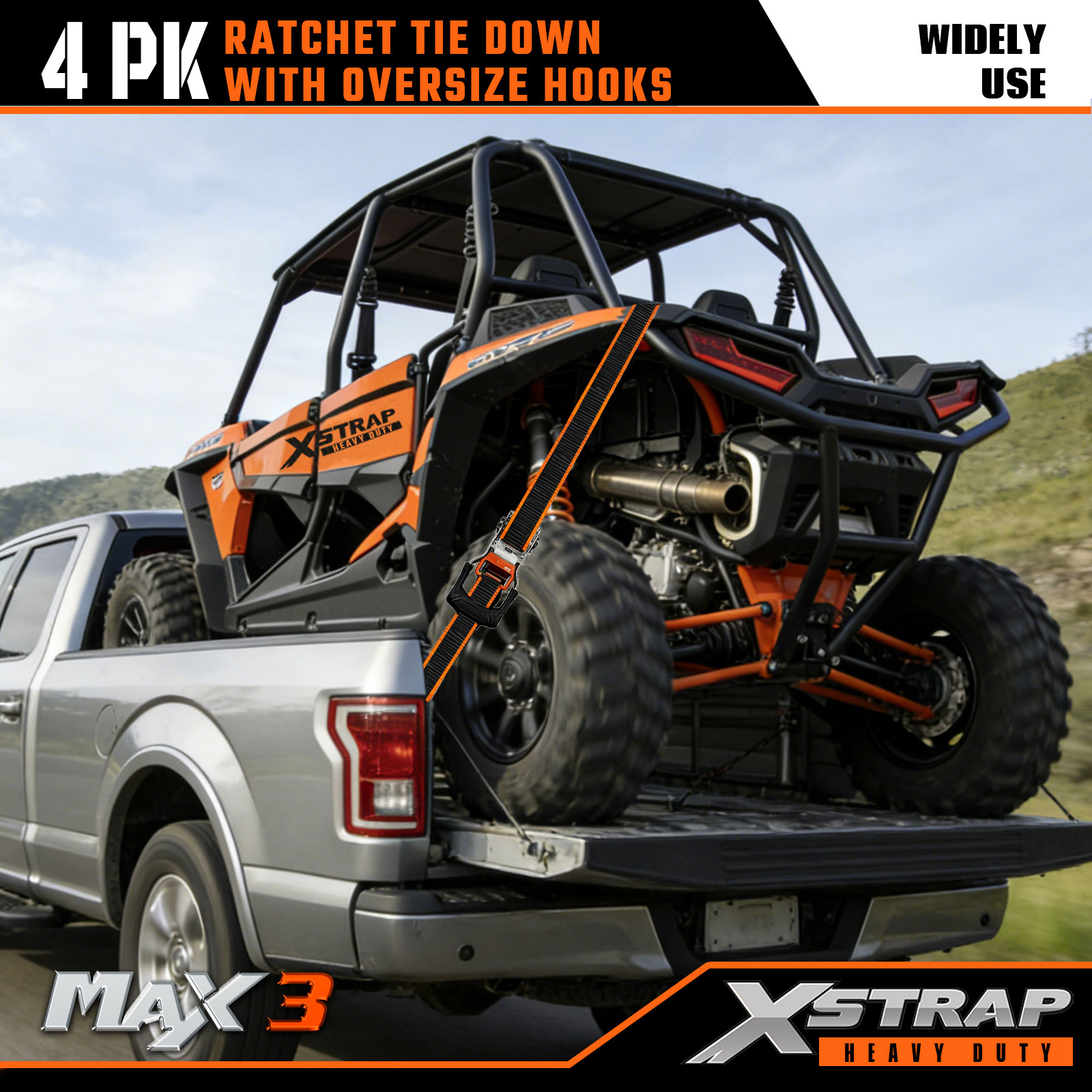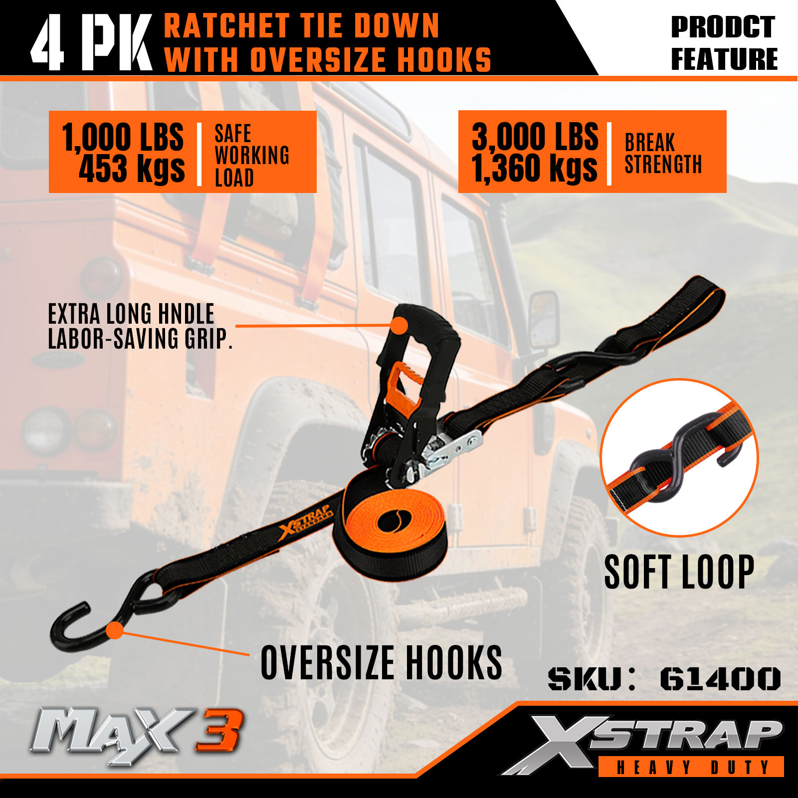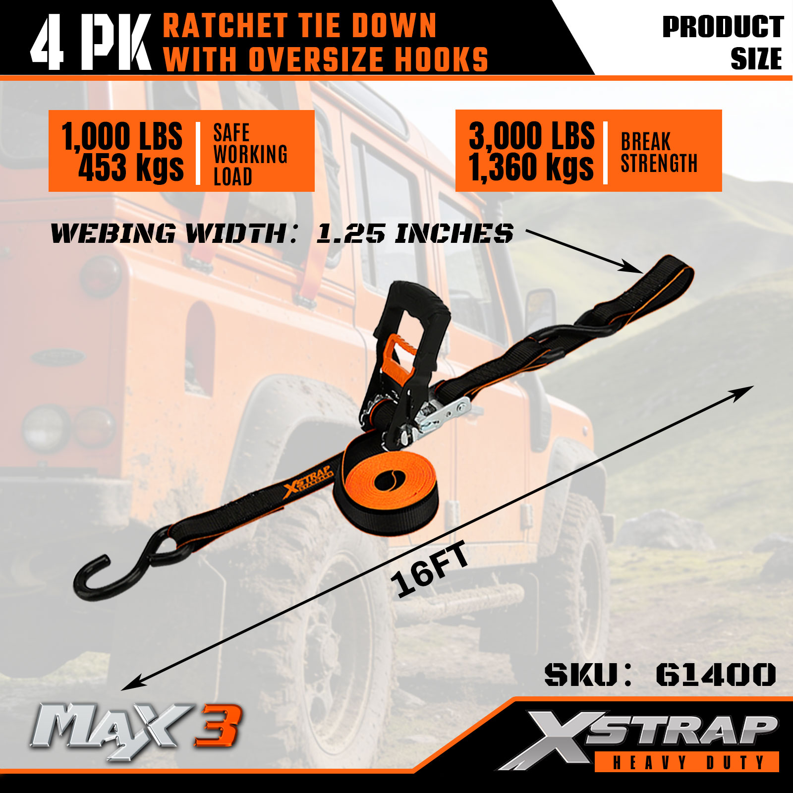Xstrap 4 Pack Ratchet Tie Down, 1-1/4” x 16' Polyester Tie Down Strap Pull Ratchet Strap, Tali Pengaman Kargo Kapasitas 1000lbs dengan Kait J Ganda untuk Truk Pickup, SUV, Rak Atas Mobil Sepeda Motor, Perahu Nelayan Ringan, Jet Ski, Mobil Salju, Traktor Rumput.