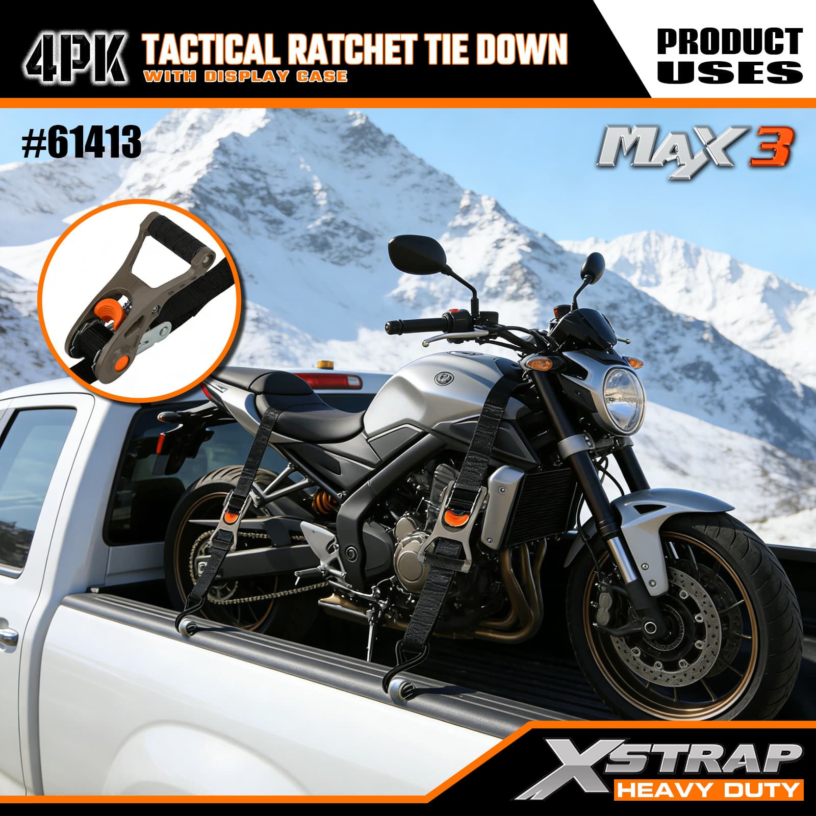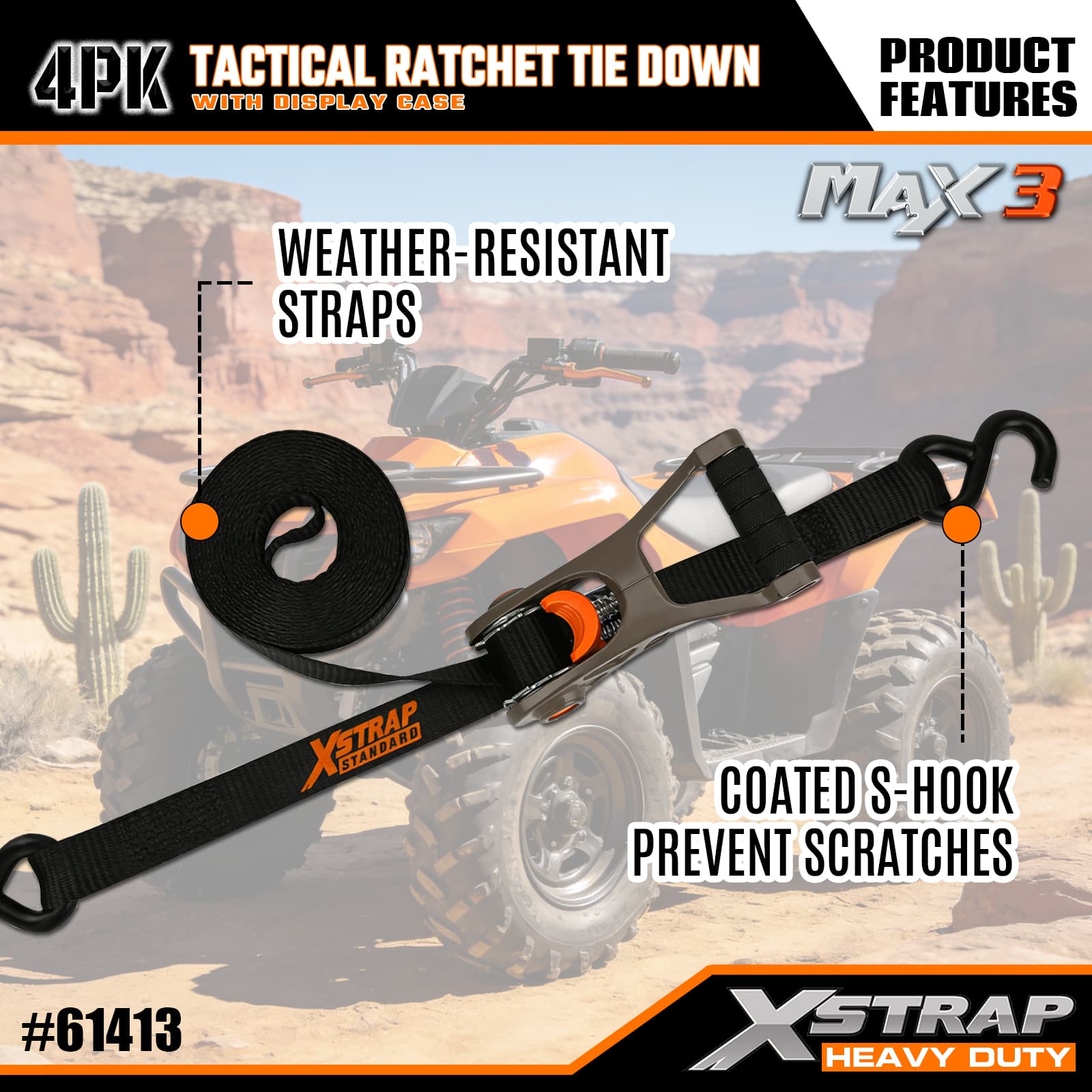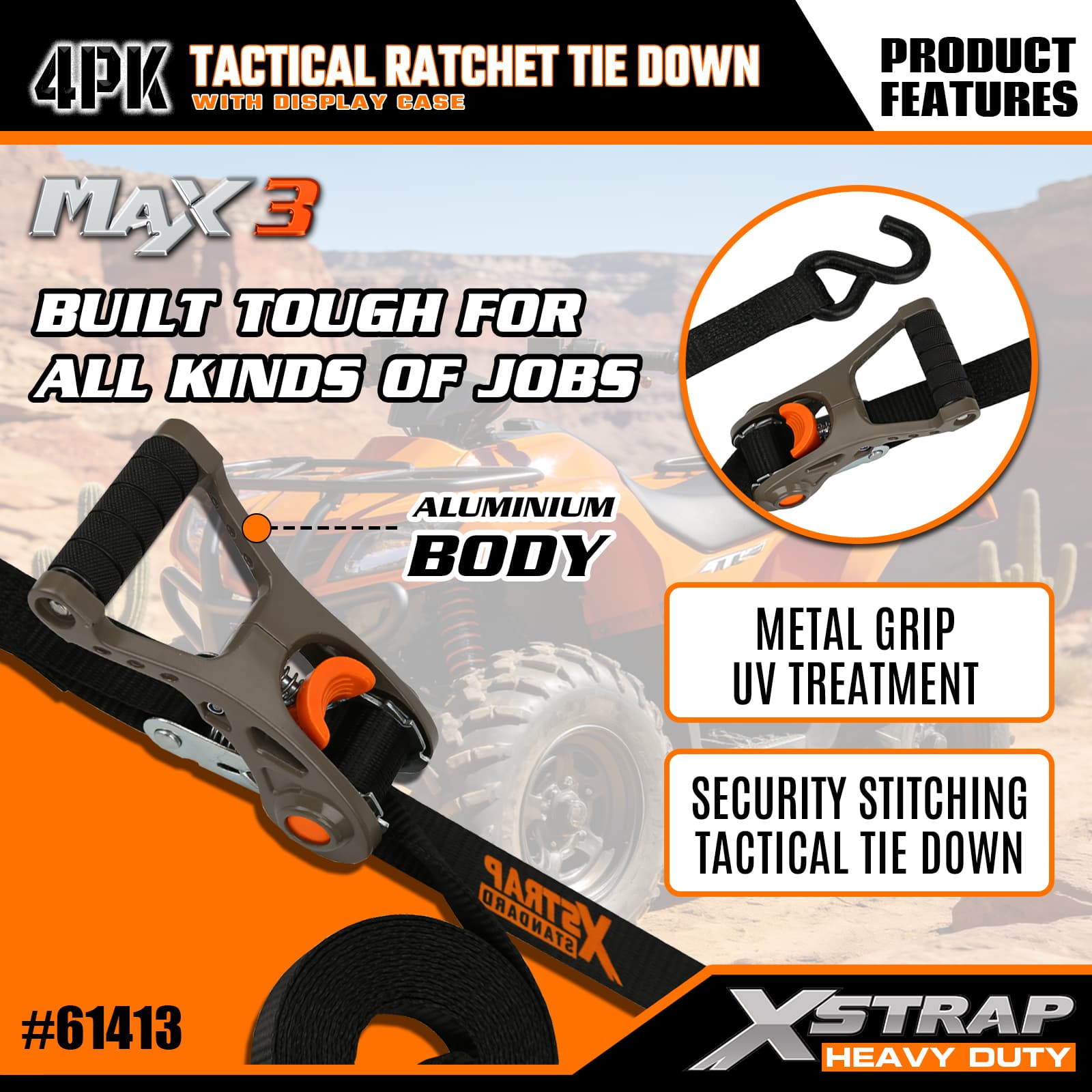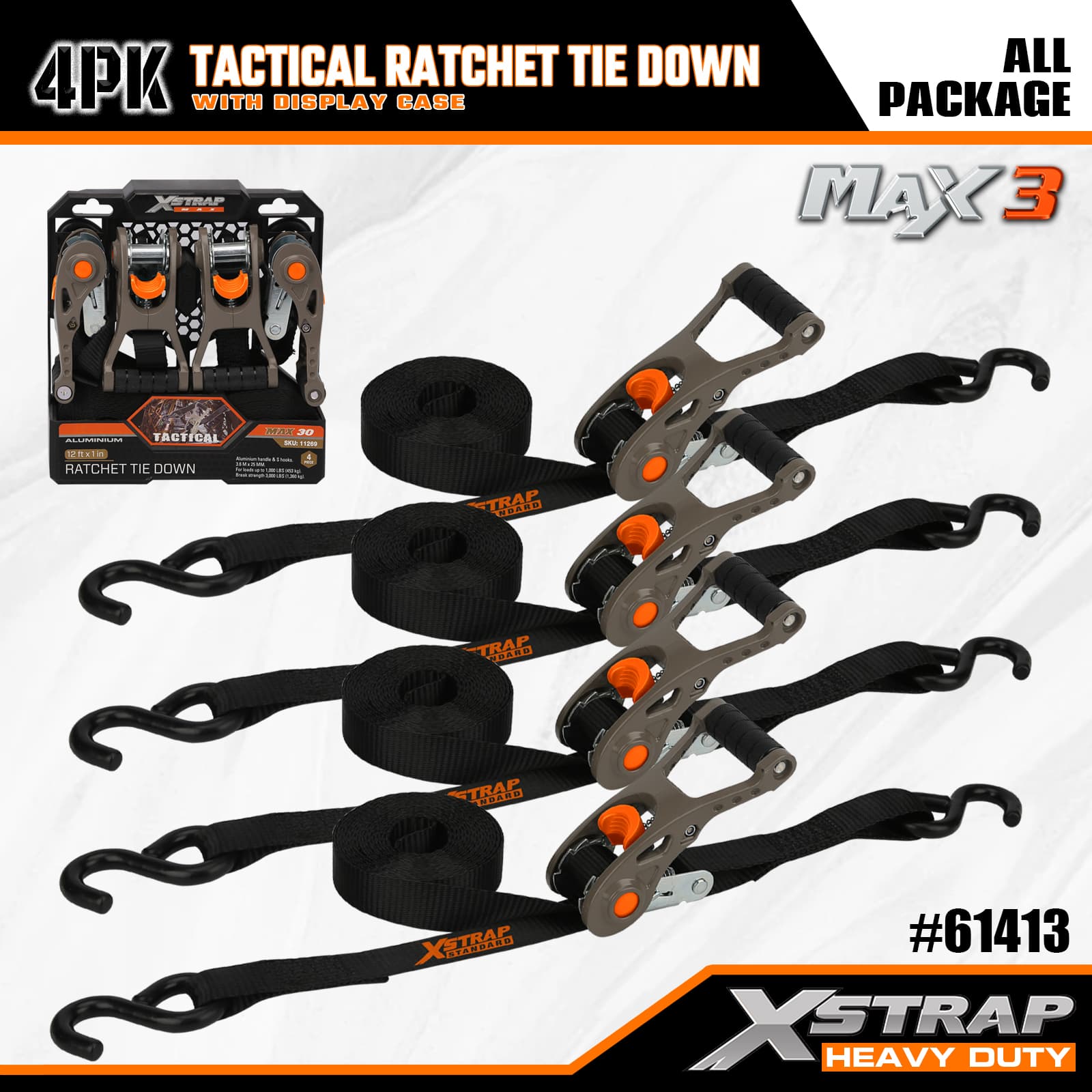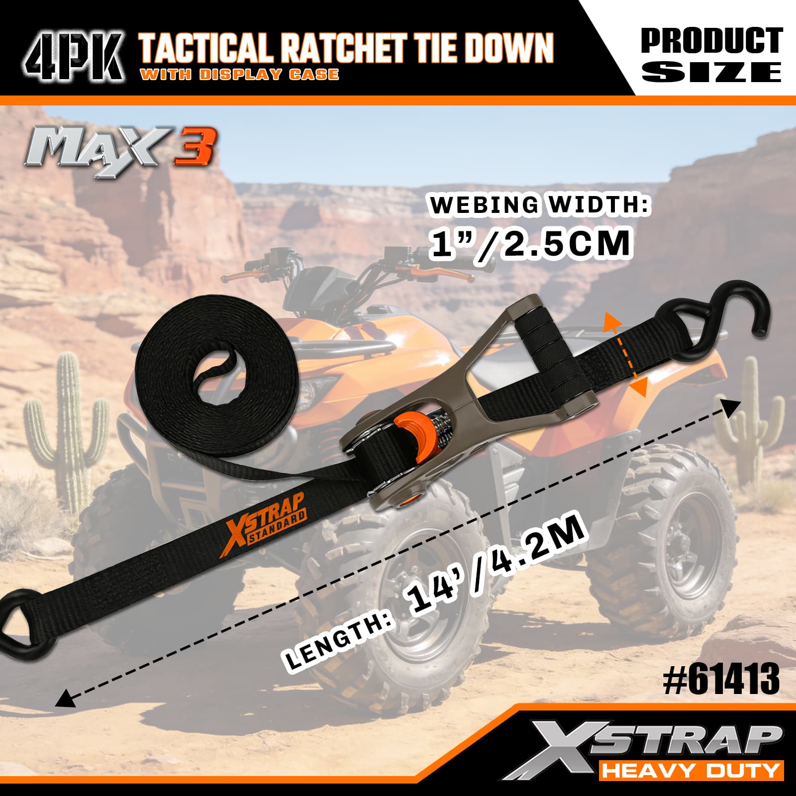 Xstrap 4 Pack Tactical Ratchet Tie Down dengan Soft Loop, 1” x 14' Polyester Tie Down Strap Pull Ratchet Strap, Tali Pengaman Kargo Kapasitas 1000lbs dengan Kait S untuk Truk, SUV, Rak Atas Mobil Sepeda Motor.