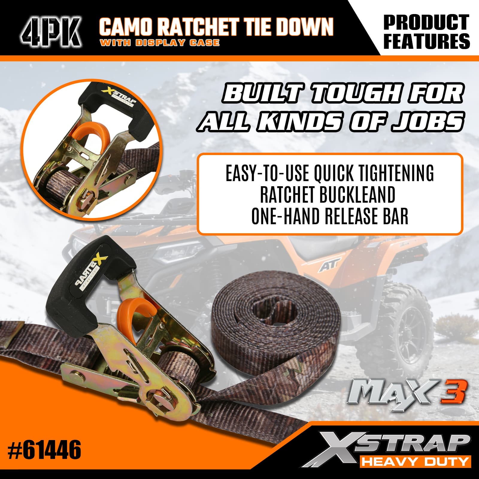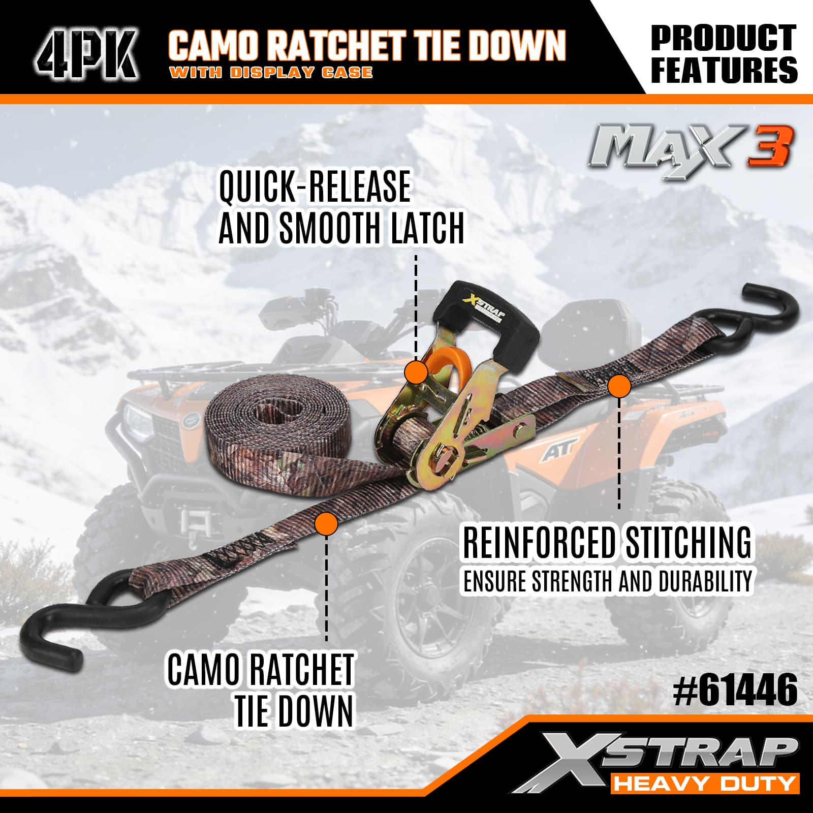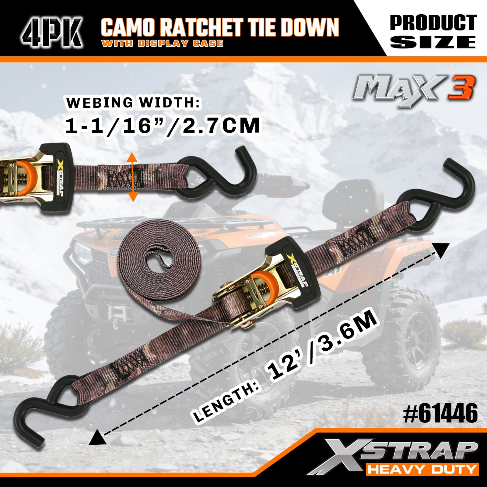 Xstrap 4 Paket Camo Ratchet Dasi Ke Bawah, 1-1/16 ” x 12' Tali Pengikat Poliester Tarik Tali Ratchet, Tali Pengaman Kargo Kapasitas 1000 pon dengan Kait S untuk Truk Pickup, SUV, Rak Atas Mobil Sepeda Motor, Perahu Nelayan Ringan, Jet Ski, Mobil Salju, Traktor Rumput.