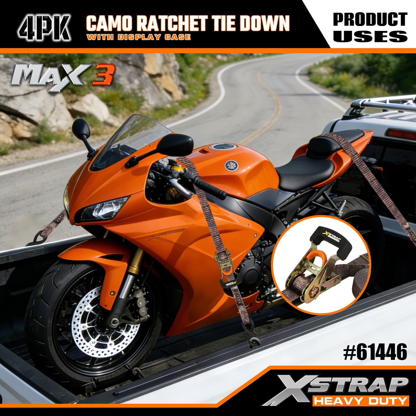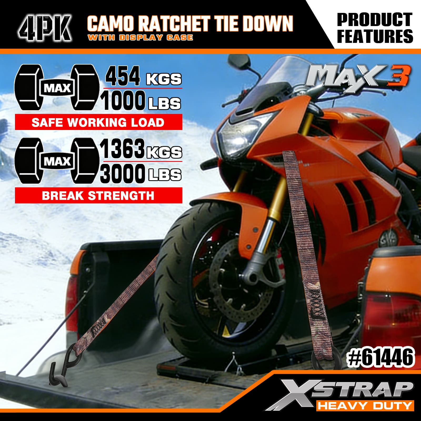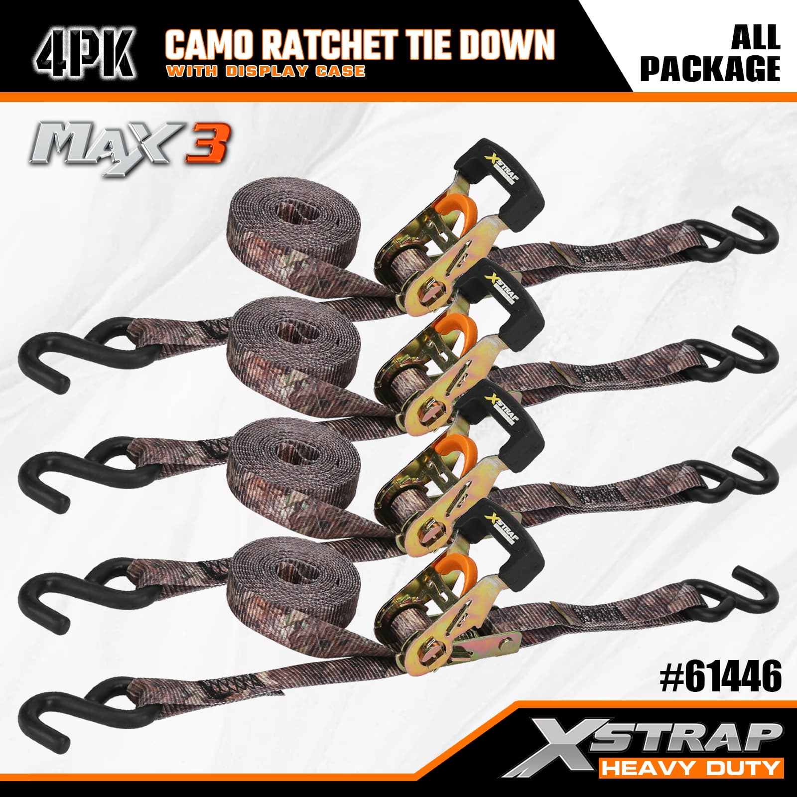 Xstrap 4 Paket Camo Ratchet Dasi Ke Bawah, 1-1/16 ” x 12' Tali Pengikat Poliester Tarik Tali Ratchet, Tali Pengaman Kargo Kapasitas 1000 pon dengan Kait S untuk Truk Pickup, SUV, Rak Atas Mobil Sepeda Motor, Perahu Nelayan Ringan, Jet Ski, Mobil Salju, Traktor Rumput.
