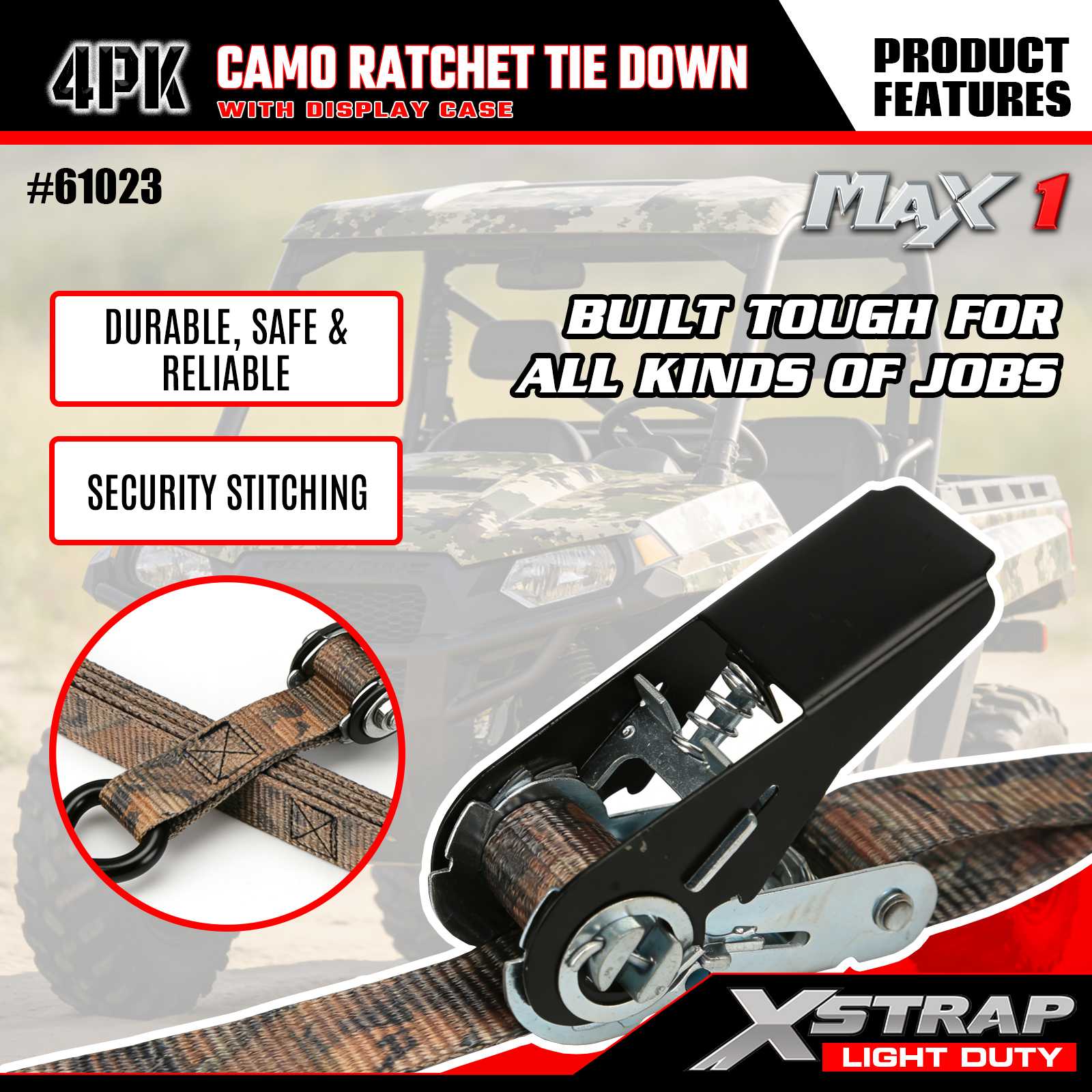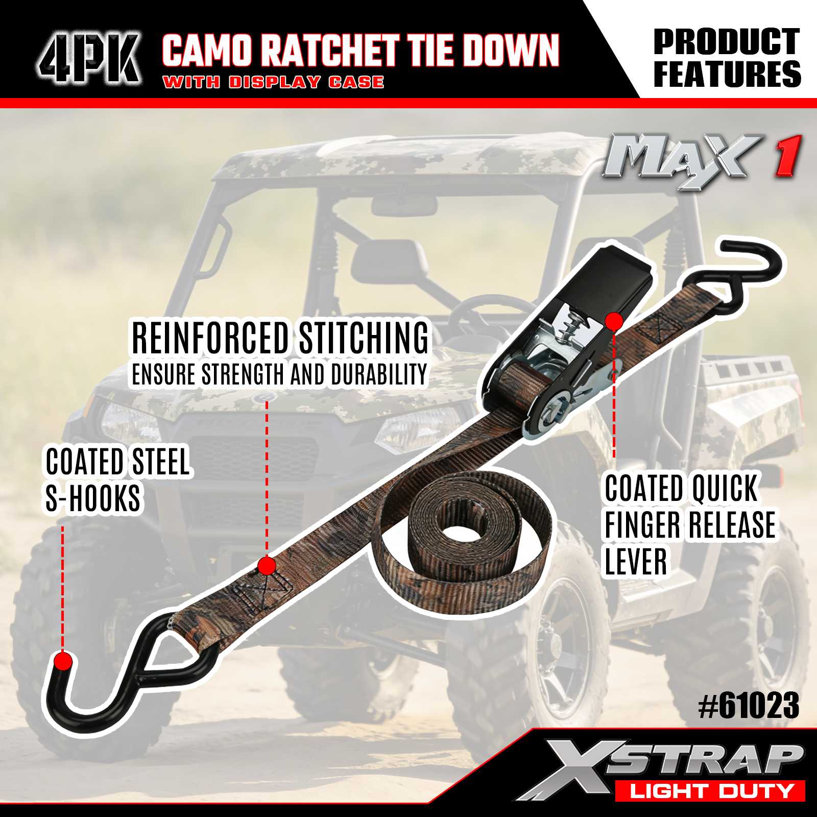 Xstrap 4PK CAMO Ratchet Tie Down Straps berukuran 1 inci x 10 kaki, beban kerja yang aman adalah 300 pon dan kekuatan putusnya adalah 900 pon.