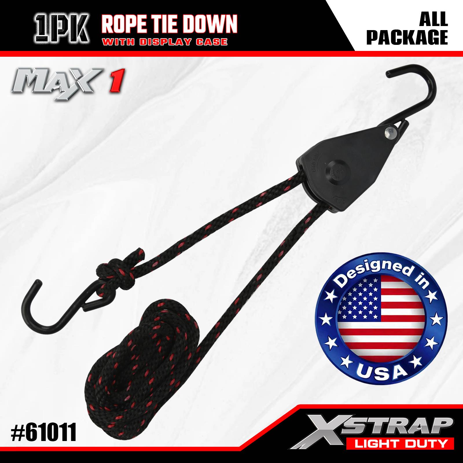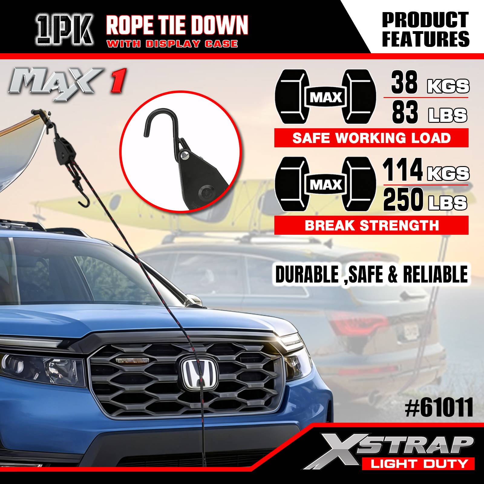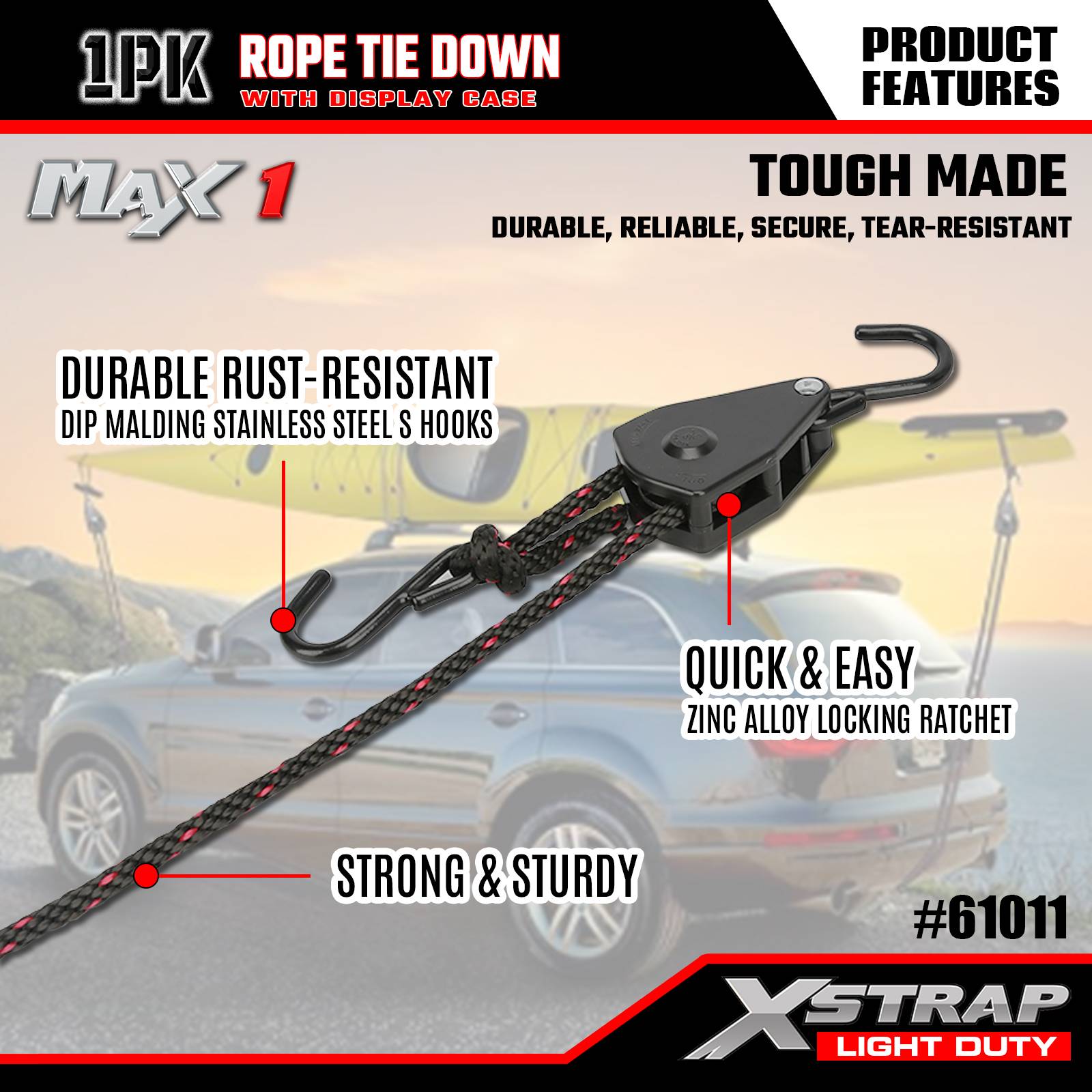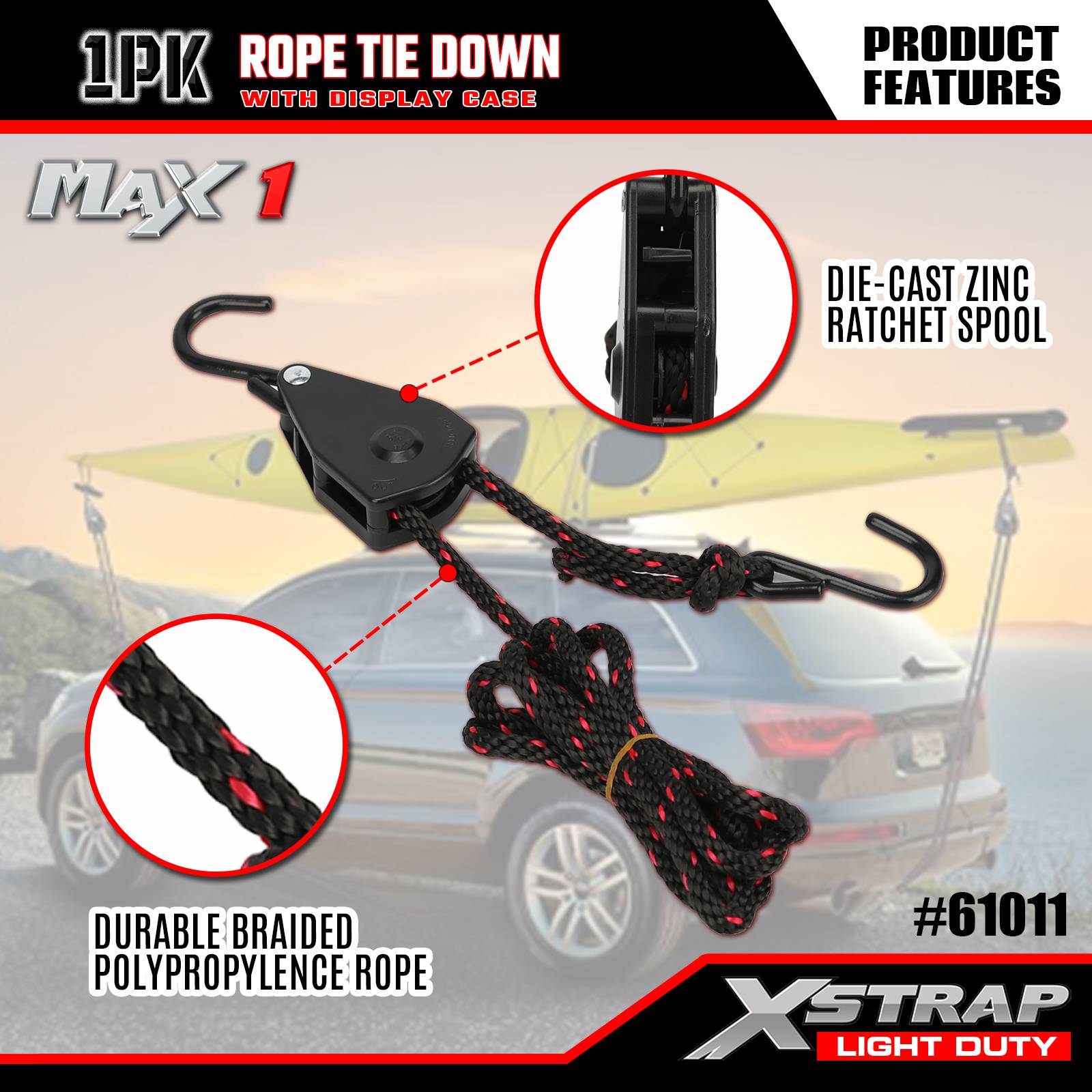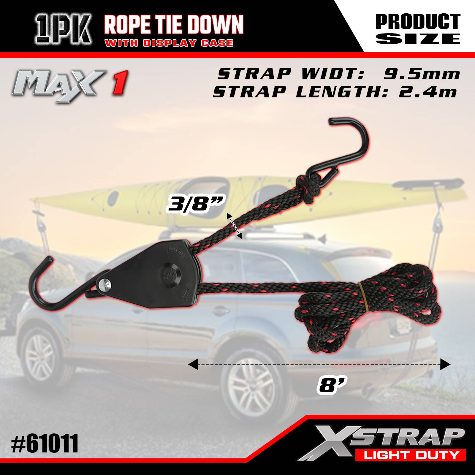 Xstrap 1 Pack Tali Pengikat Tali, 3/8” x 8’ - Penutup Beban 83 Lbs- Kekuatan Putus 250 Lbs-Tali Kargo untuk Mengamankan Beban Ringan (Kayak, Perlengkapan, Peralatan Kecil) ke Kendaraan/Rak