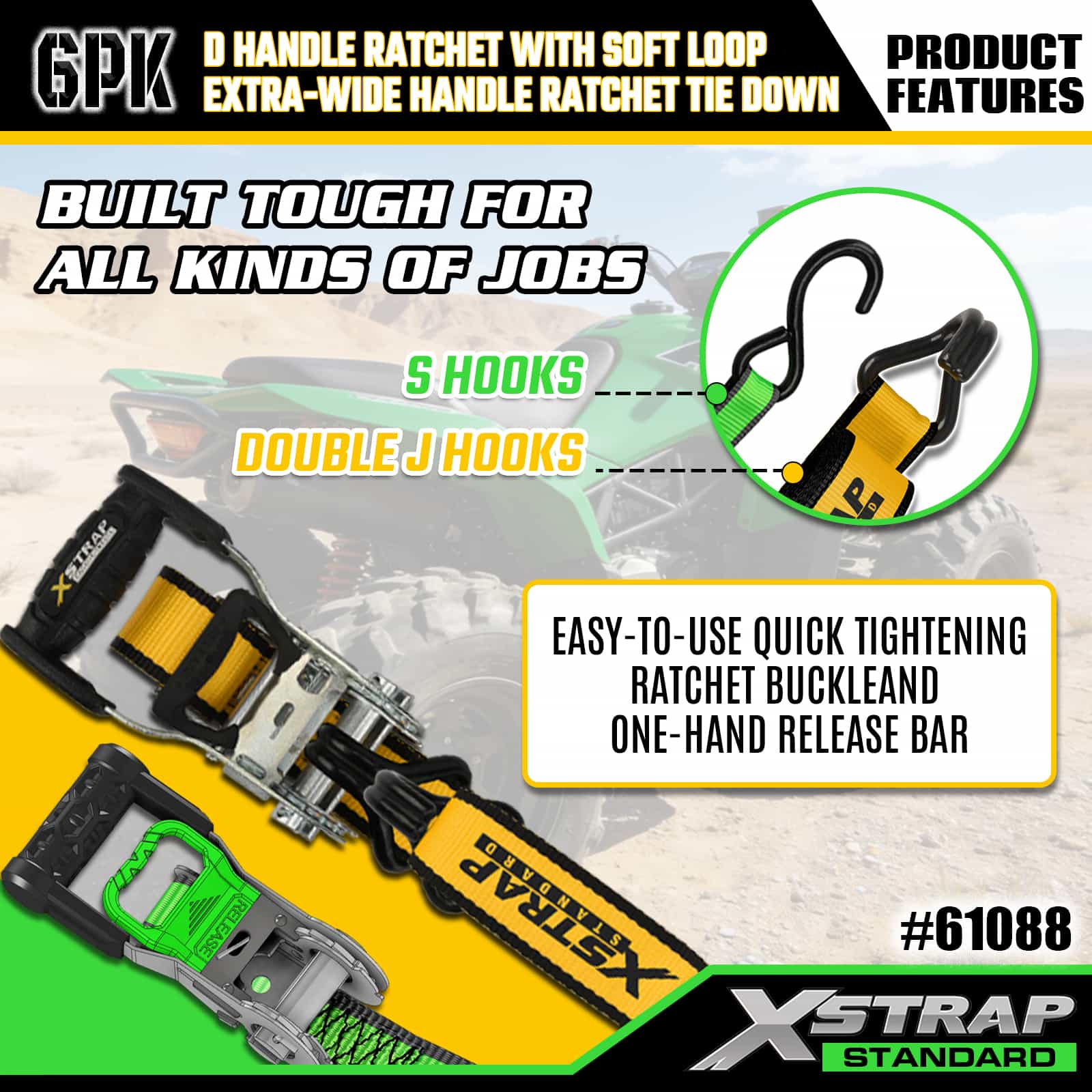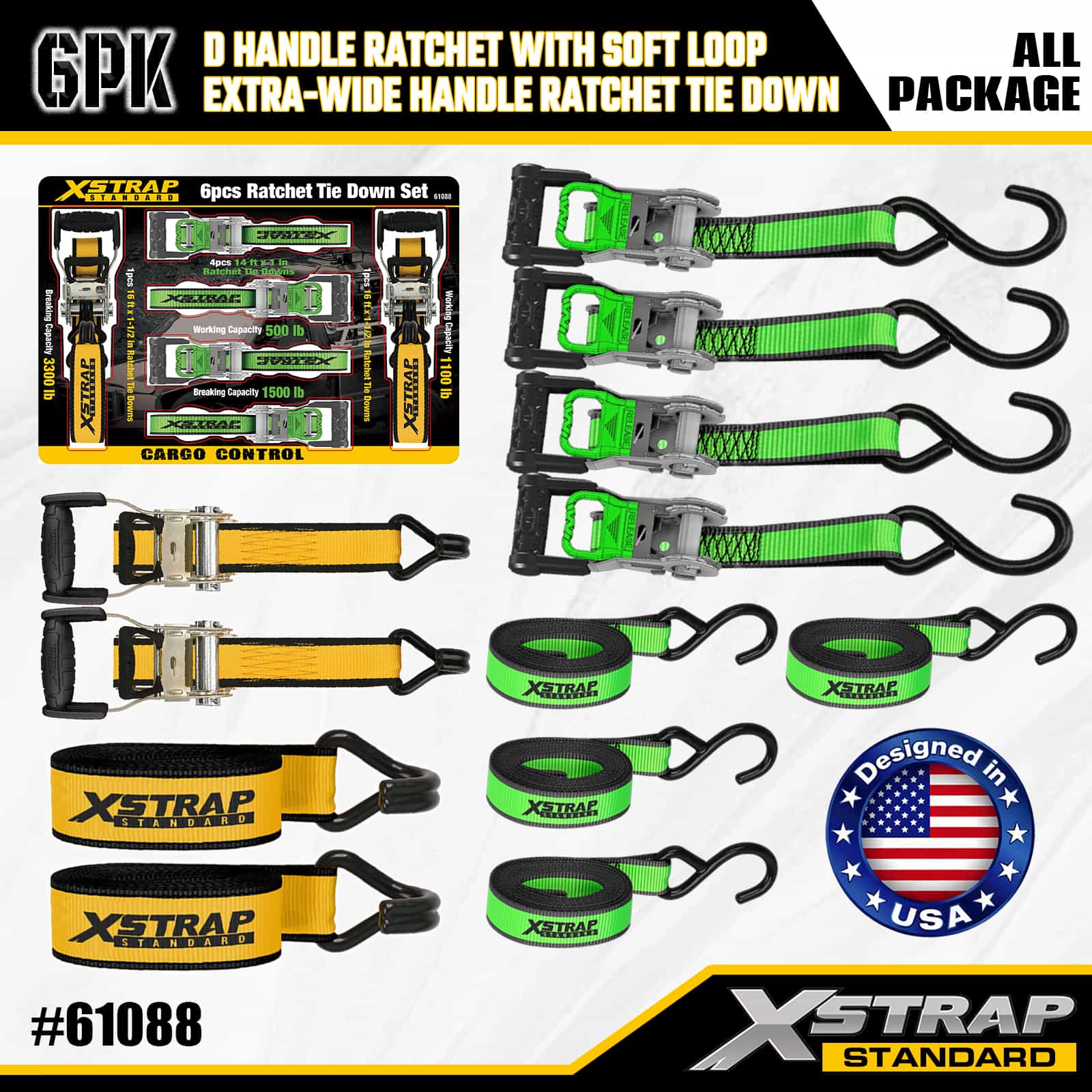 Xstrap 6 Pack Aluminium Ratchet Tie Down, 1” x 14' dan 1” x 16' Polyester Tie Down Strap Tarik Ratchet Strap, 500lbs dan 1100lbs Kapasitas Cargo Lashing Securing Straps dengan S Hooks dan Double J Hooks untuk Cargo control Pickup Truck, SUV, Car Top Racks Motorcycle,.