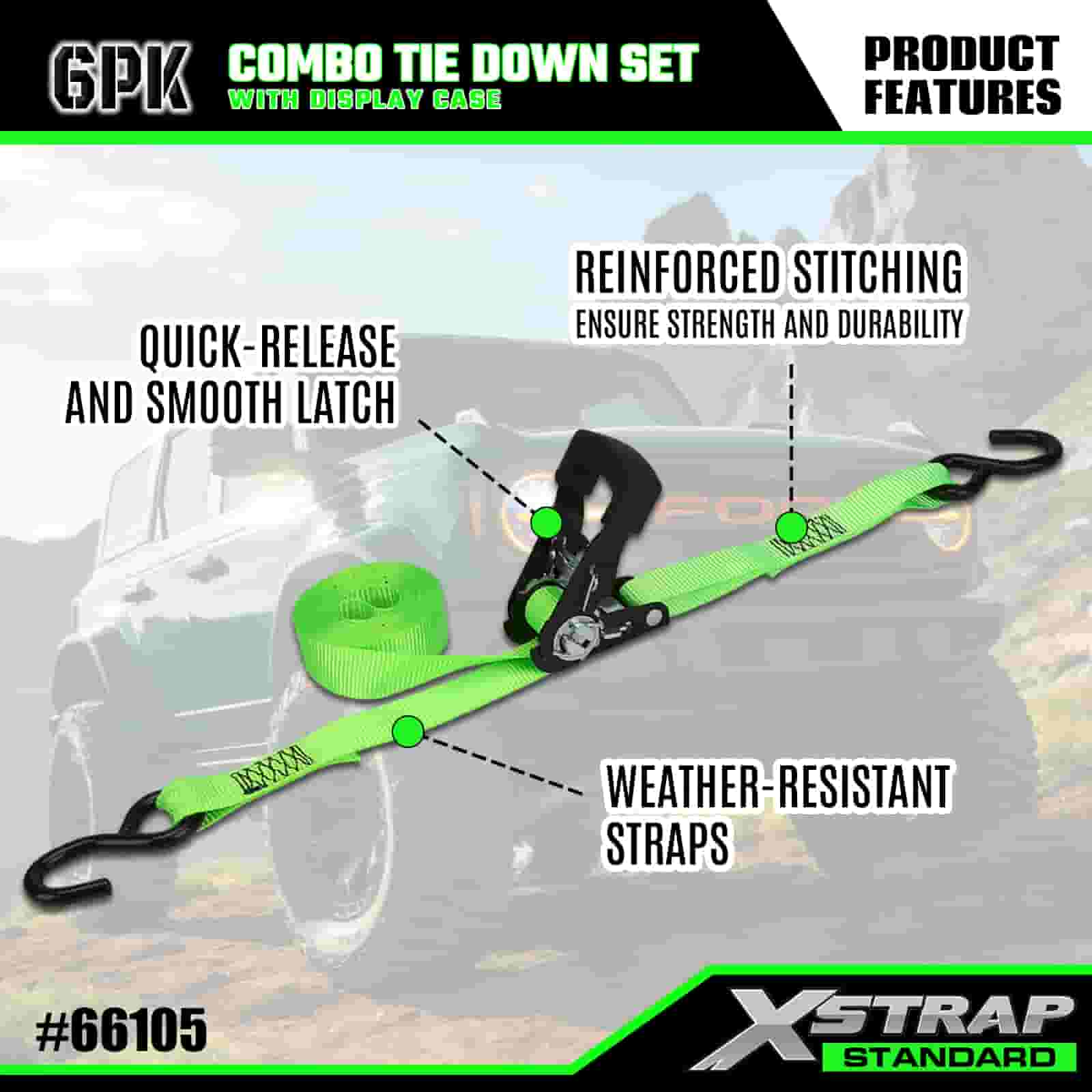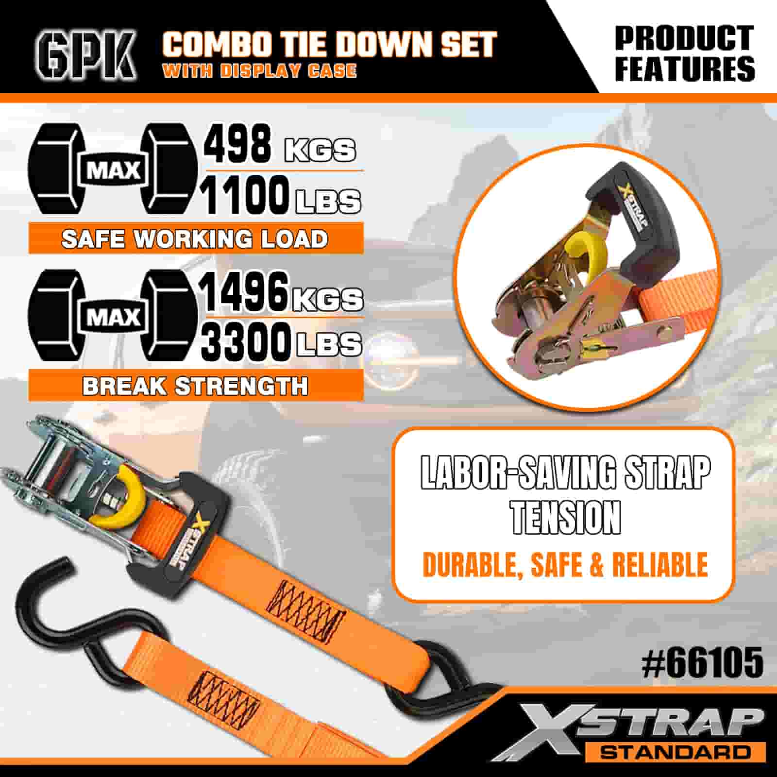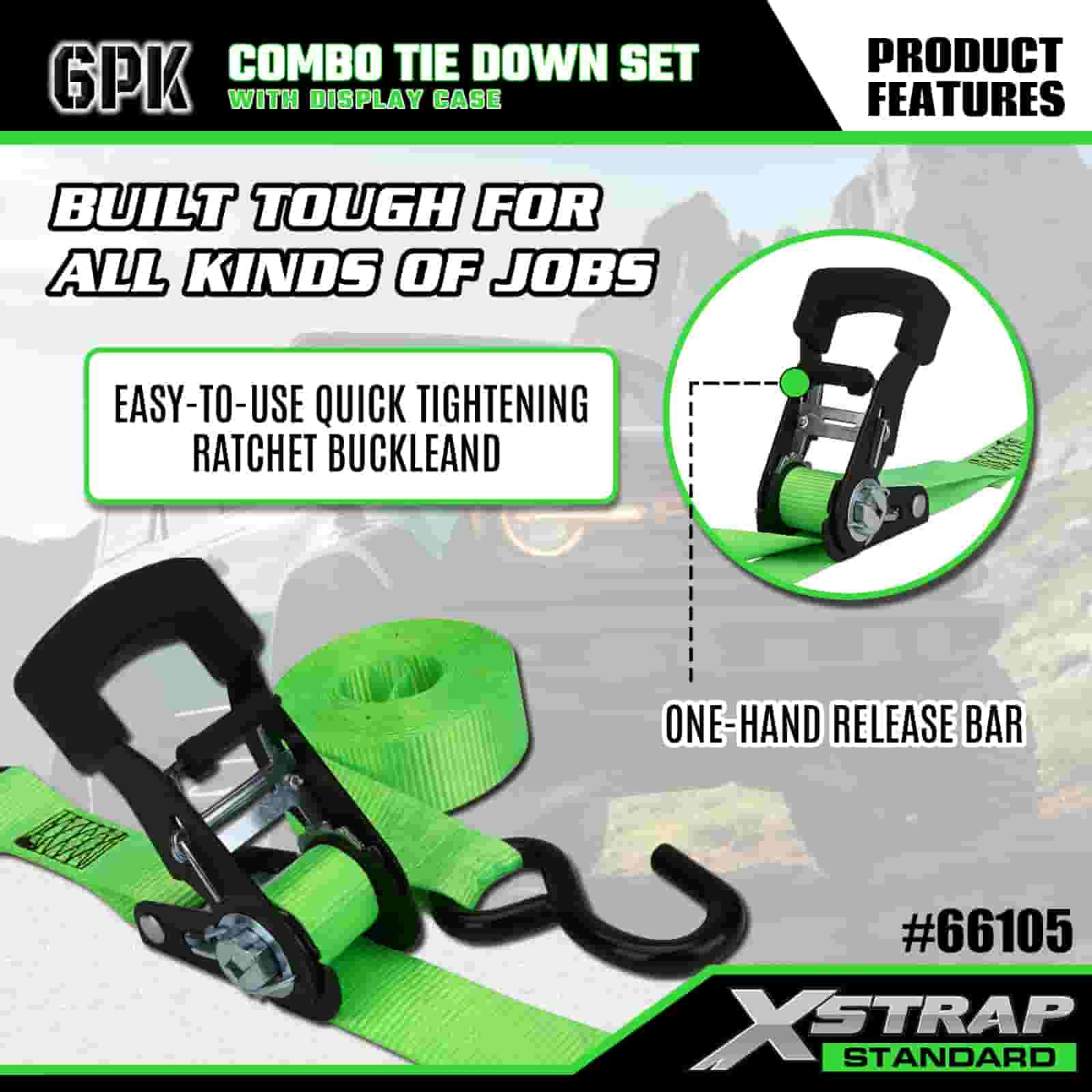 Xstrap 6 Pack Aluminium Ratchet Tie Down, 1” x 14' dan 1” x 10' Polyester Tie Down Strap Tarik Ratchet Strap, 500lbs dan 1100lbs Kapasitas Cargo Lashing Securing Straps dengan S Hooks untuk Cargo control Pickup Truck, SUV, Car Top Racks Motorcycle,.