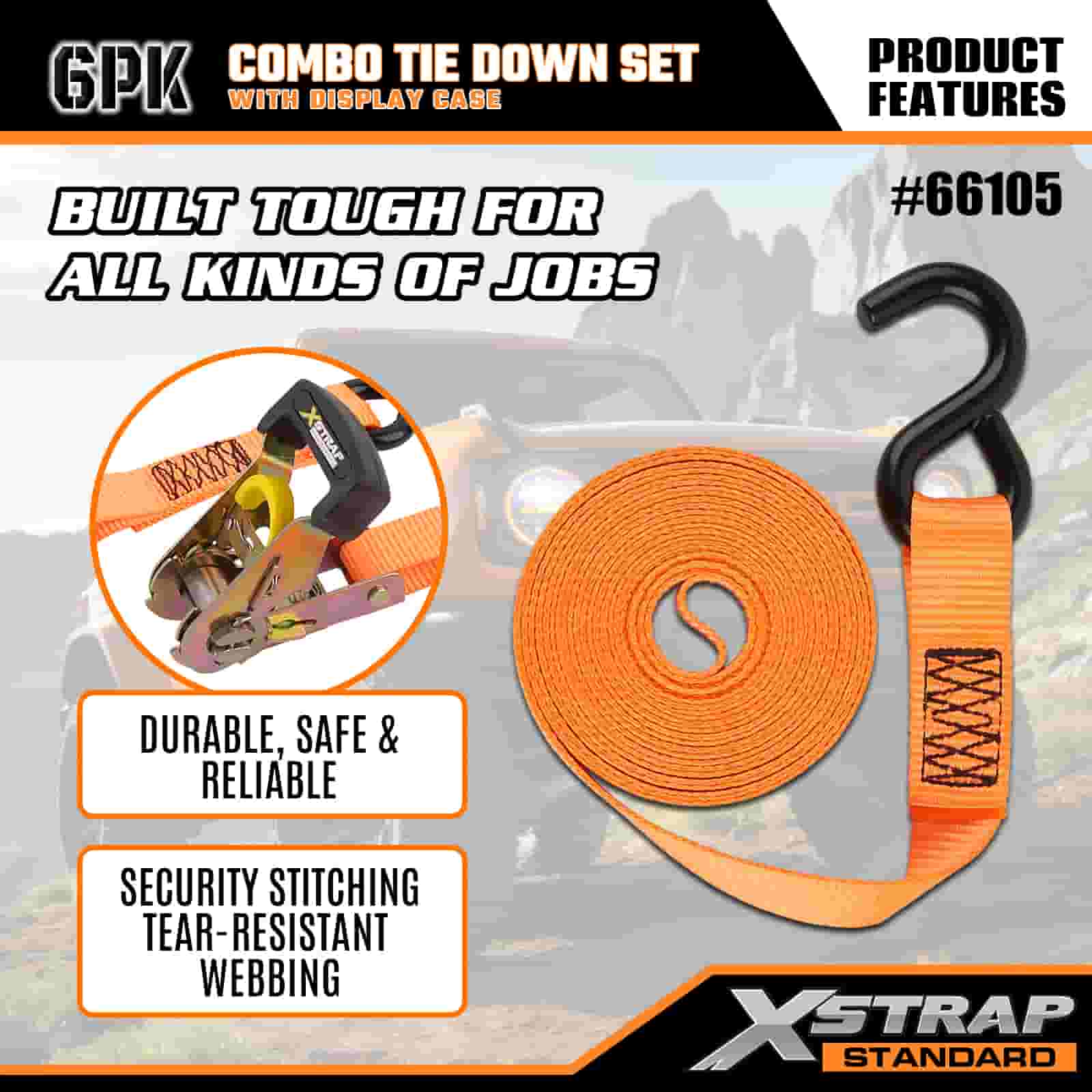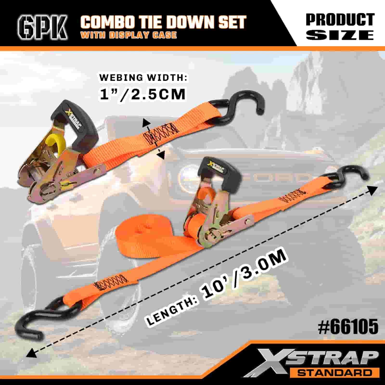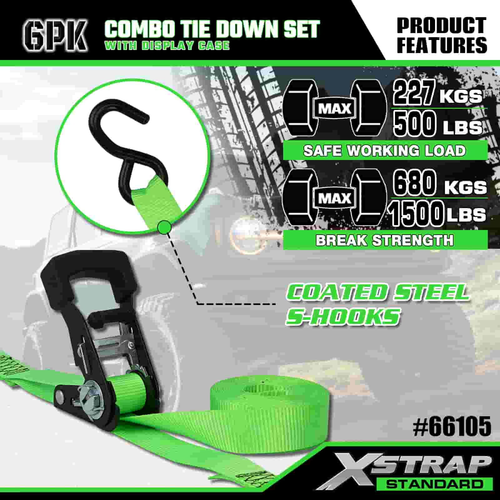 Xstrap 6 Pack Aluminium Ratchet Tie Down, 1” x 14' dan 1” x 10' Polyester Tie Down Strap Tarik Ratchet Strap, 500lbs dan 1100lbs Kapasitas Cargo Lashing Securing Straps dengan S Hooks untuk Cargo control Pickup Truck, SUV, Car Top Racks Motorcycle,.