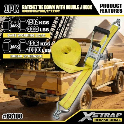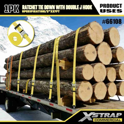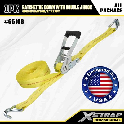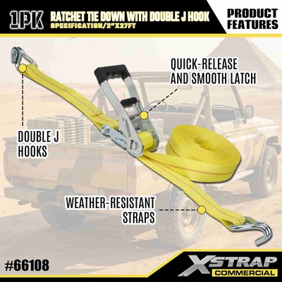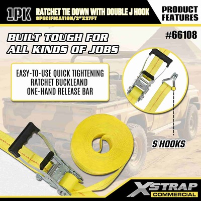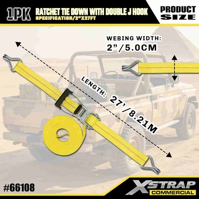 Xstrap Ratchet Tie Down dengan Double J Hooks, 2” x 27' Polyester Tie Down Strap Pull Ratchet Strap, 3333lbs Kapasitas Cargo Lashing Securing Straps dengan Double J Hooks untuk Cargo control Pickup Truck, SUV, Car Top Racks Motorcycle,.