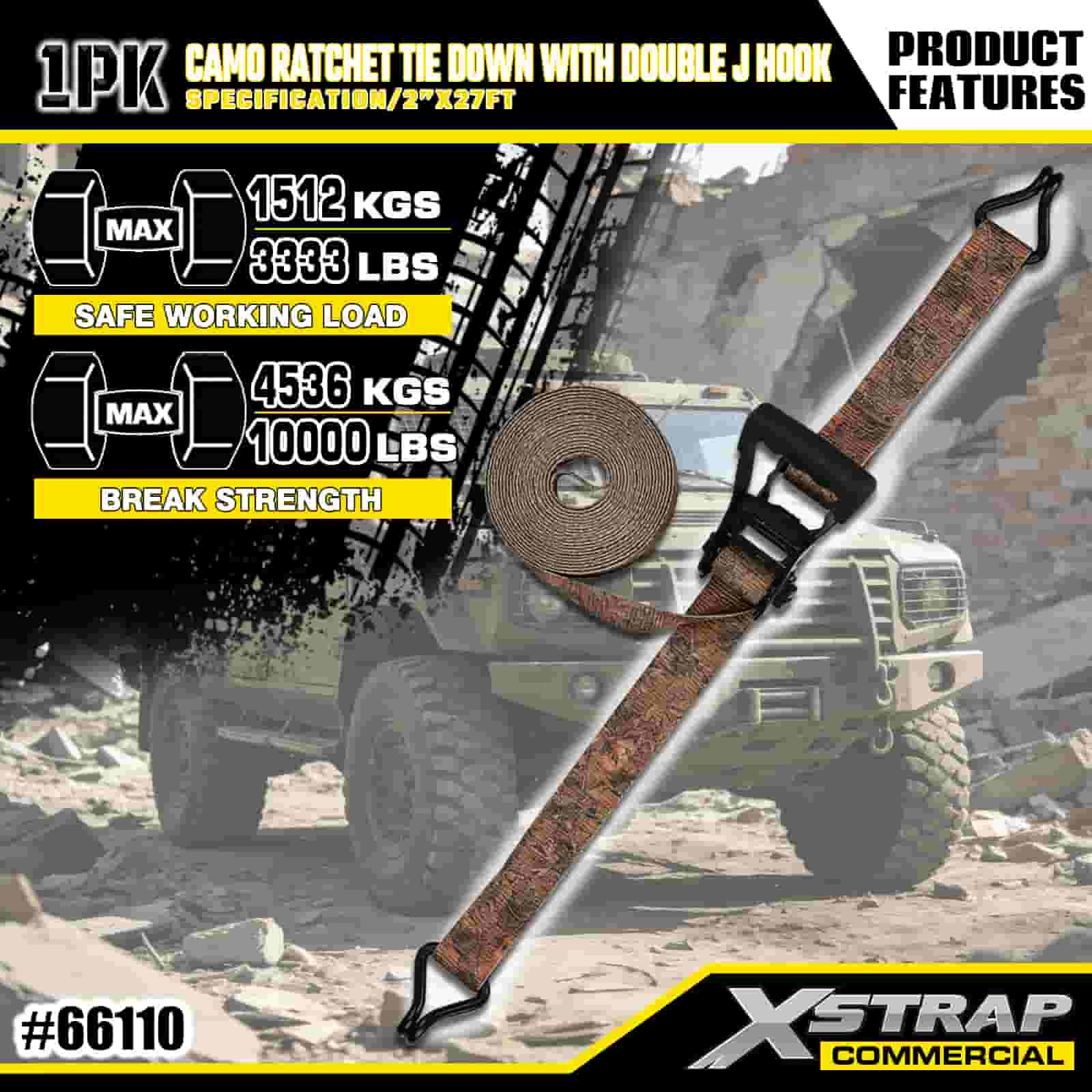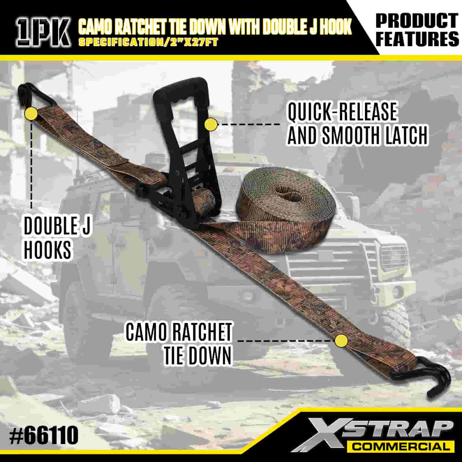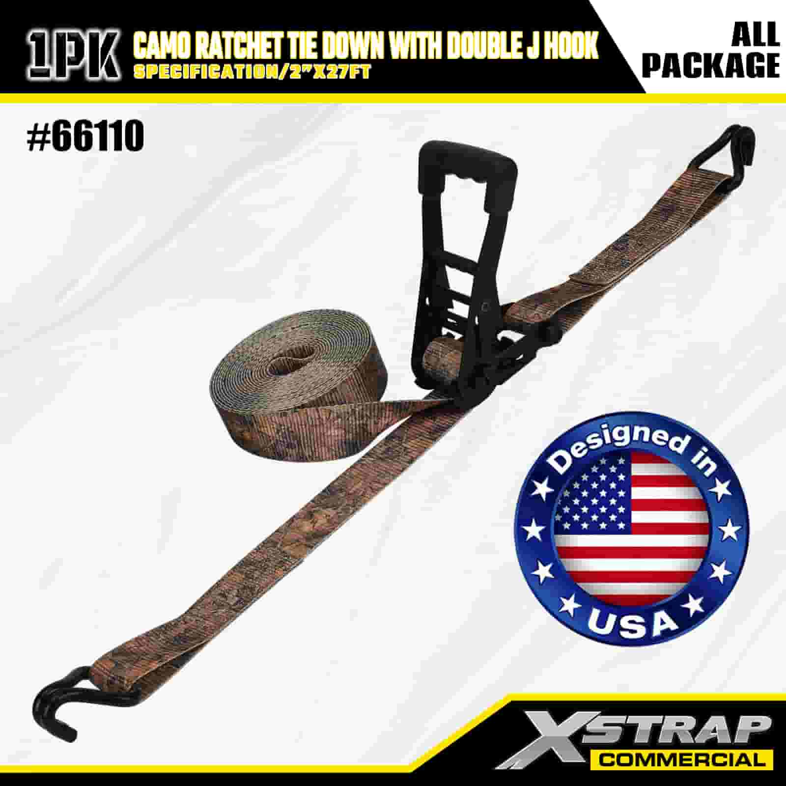 Xstrap CAMO Ratchet Tie Down dengan Double J Hooks, 2” x 27' Polyester Tie Down Strap Pull Ratchet Strap, 3333lbs Kapasitas Cargo Lashing Securing Straps dengan Double J Hooks untuk Cargo control Pickup Truck, SUV, Car Top Racks Motorcycle,.
