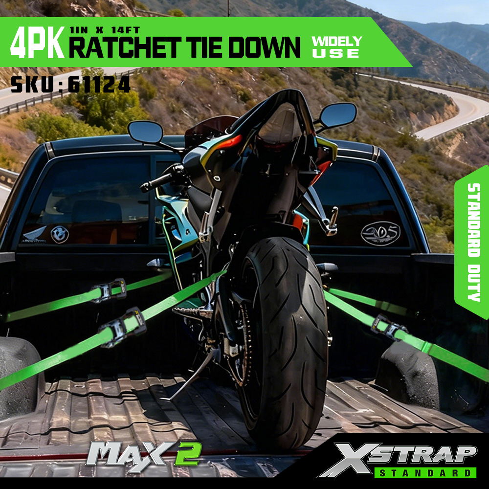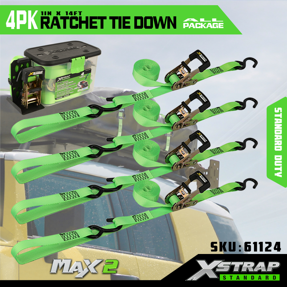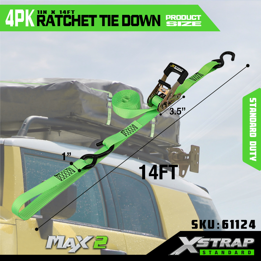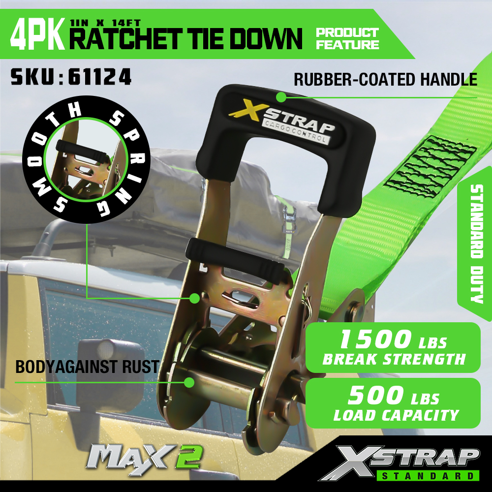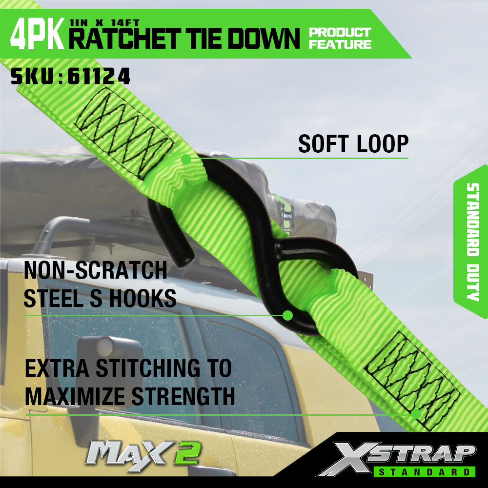 Xstrap 4 Paket Tali Ratchet Pengikat, Tali Pengikat Ratchet Poliester 1"x 14' dengan Loop Lembut, Tali Pengaman Pengaman Kargo Kapasitas 1500lbs (500lbs) dengan ratchet Logam & Kait S untuk Kargo, Truk, Mesin Pemotong, ATV.