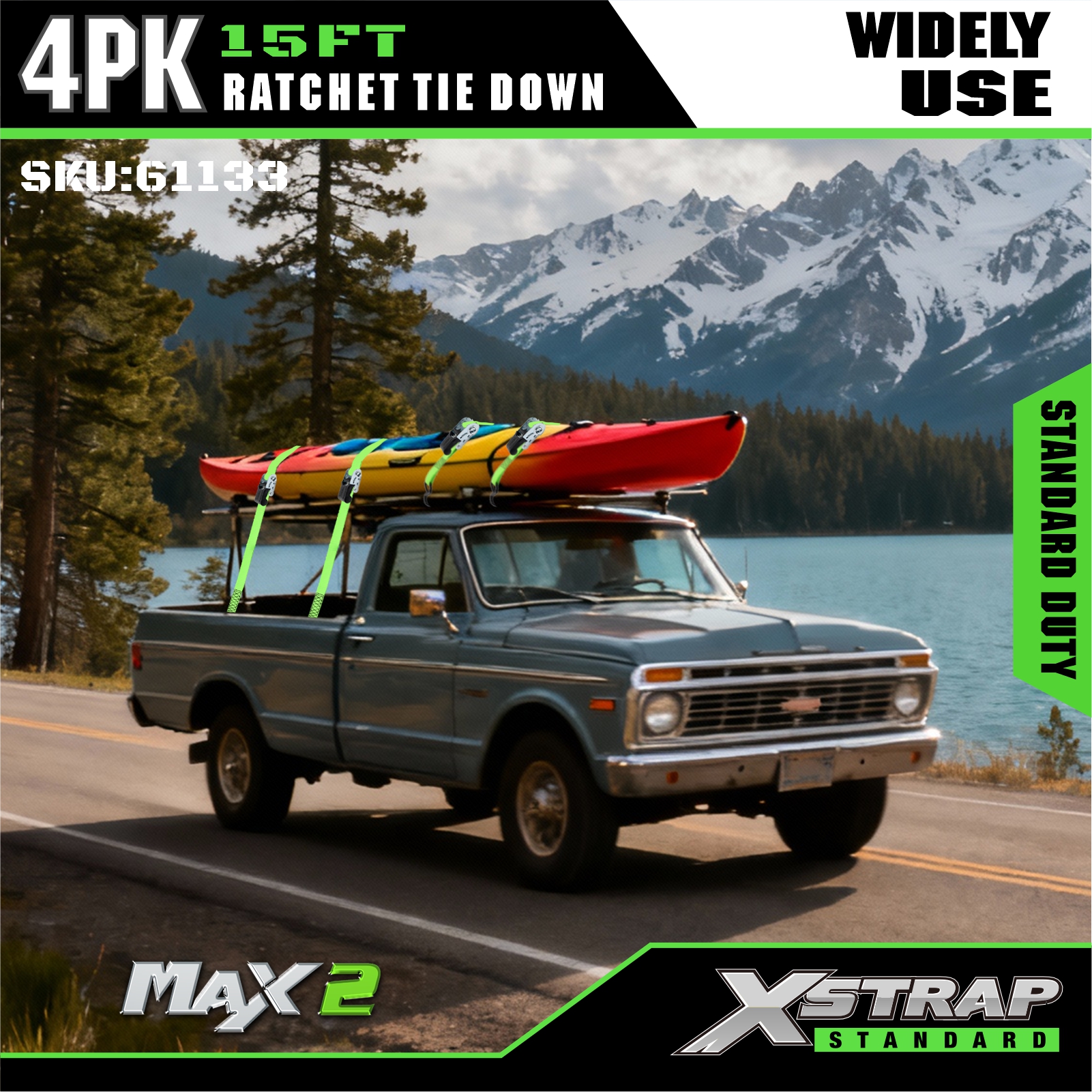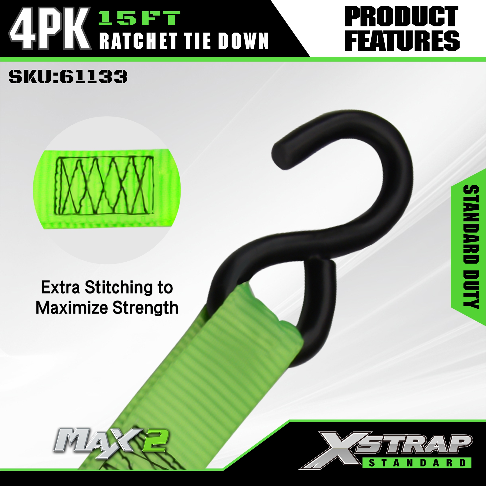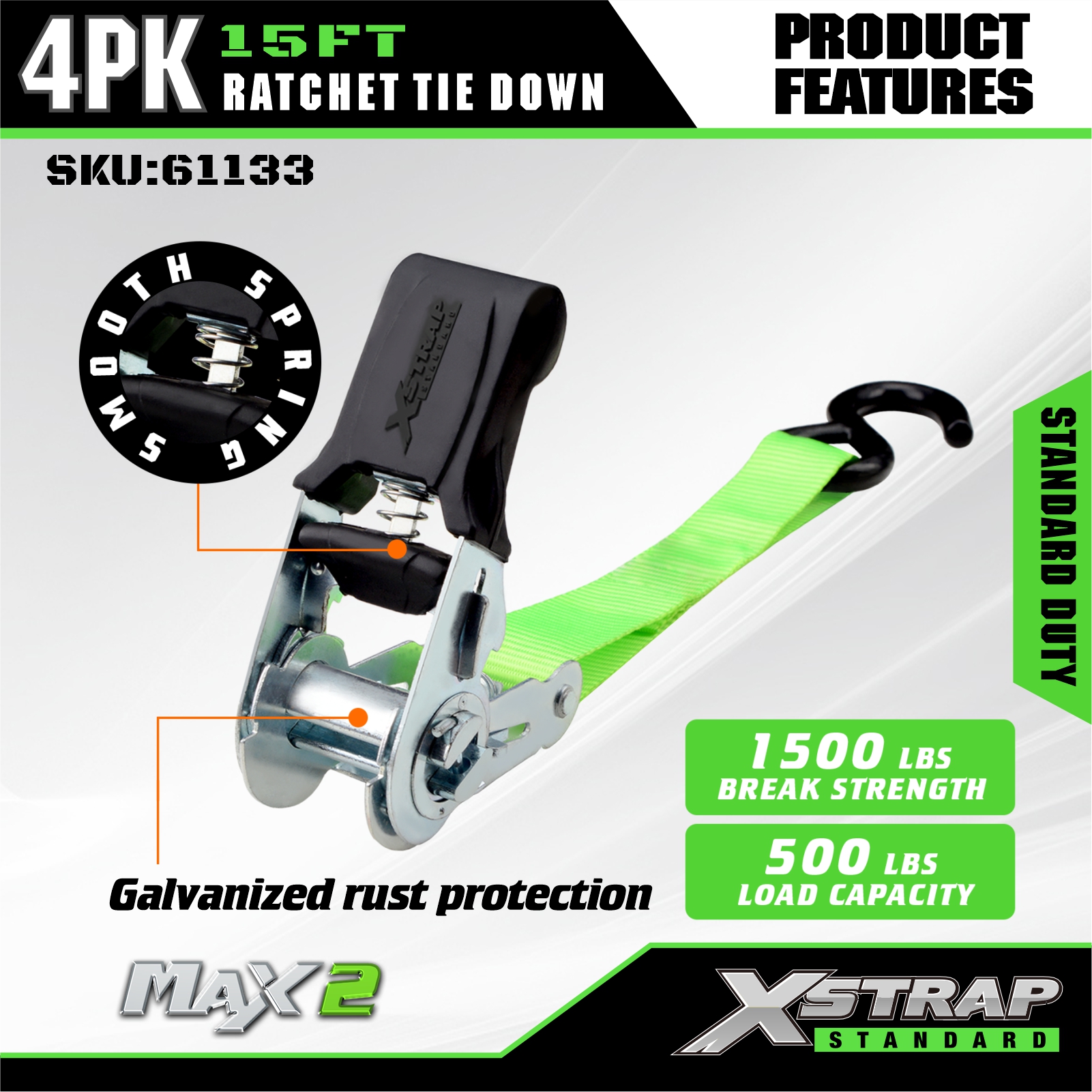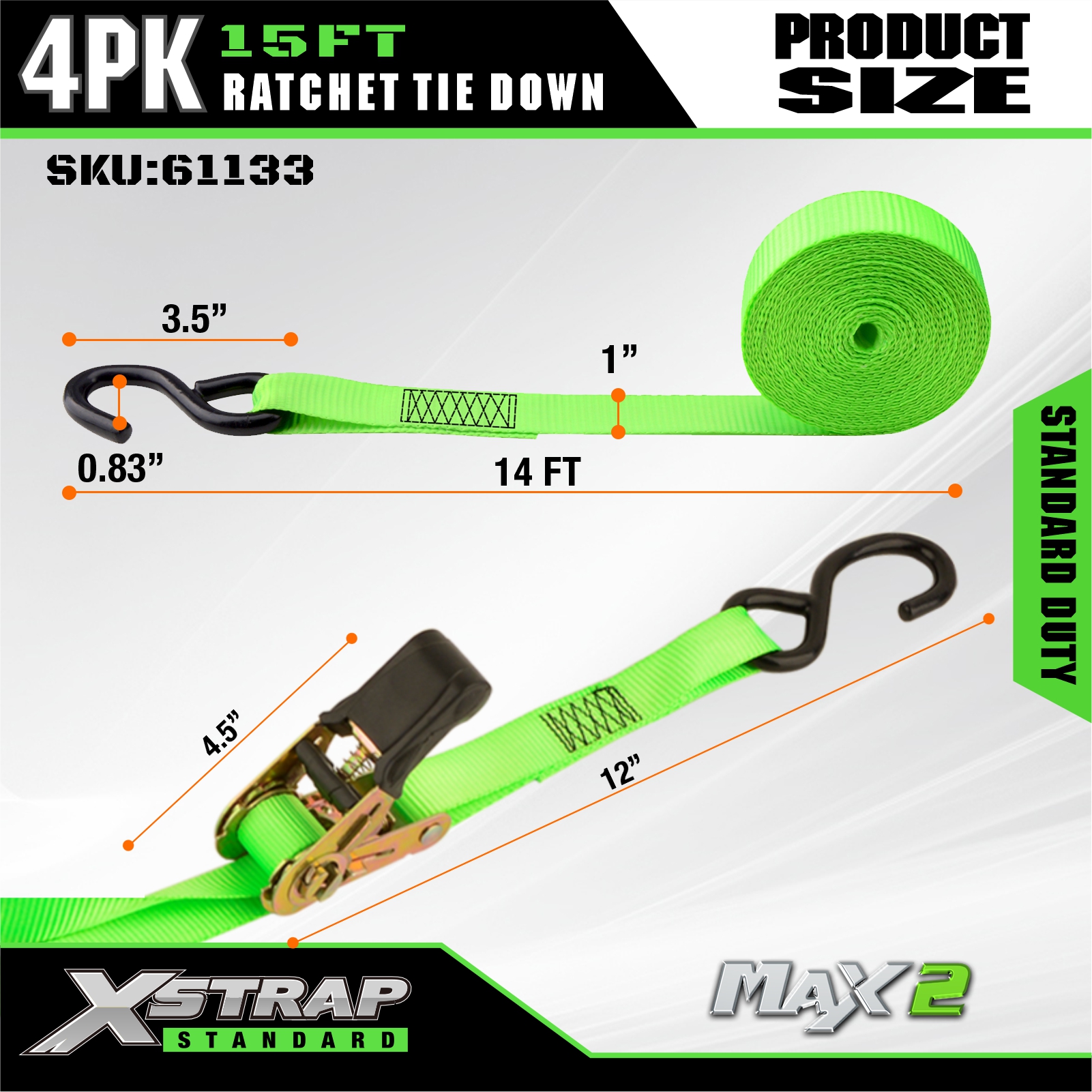 Xstrap 4 Pack Ratchet Tie Down, Tali Ratchet Tarik Tali Pengikat Poliester 1” x 15', Tali Pengaman Kargo Kapasitas 500 pon dengan Kait S untuk Truk Pickup, SUV, Rak Atas Mobil Sepeda Motor, Perahu Nelayan Ringan, Jet Ski, Mobil Salju, Traktor Rumput.