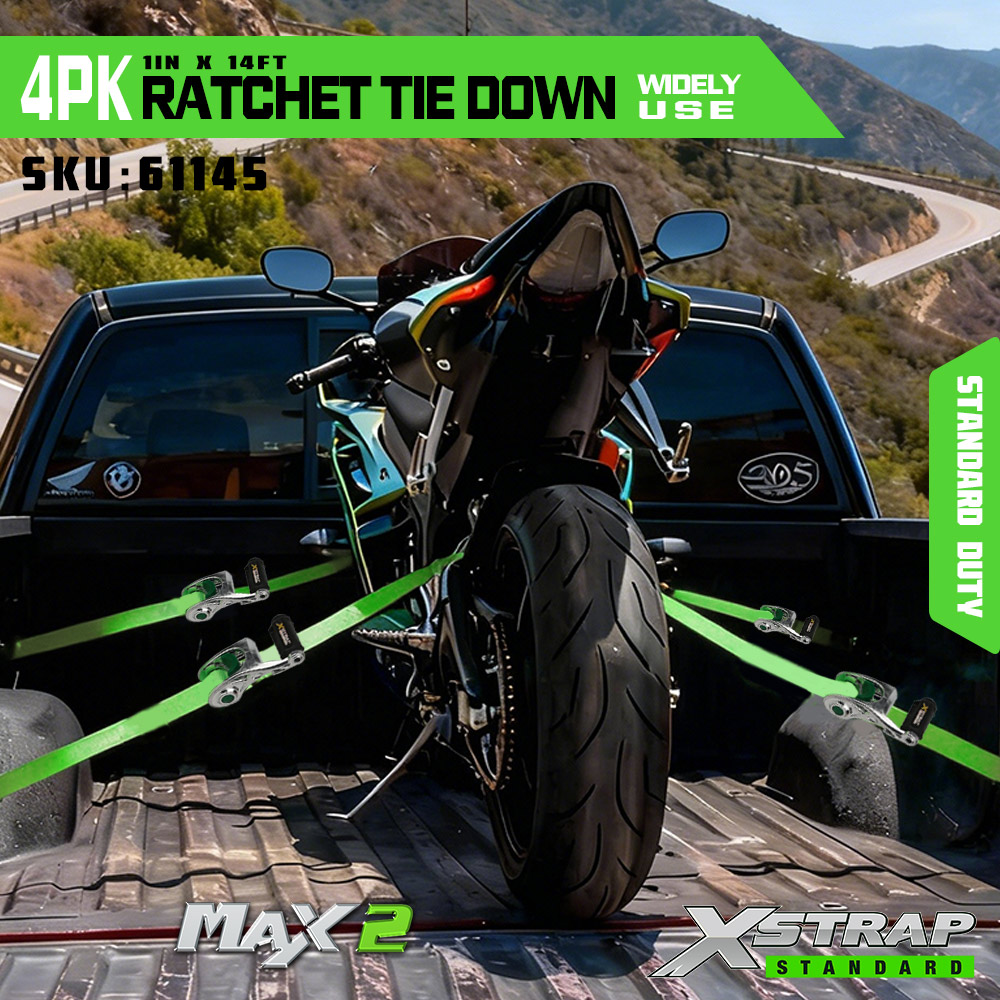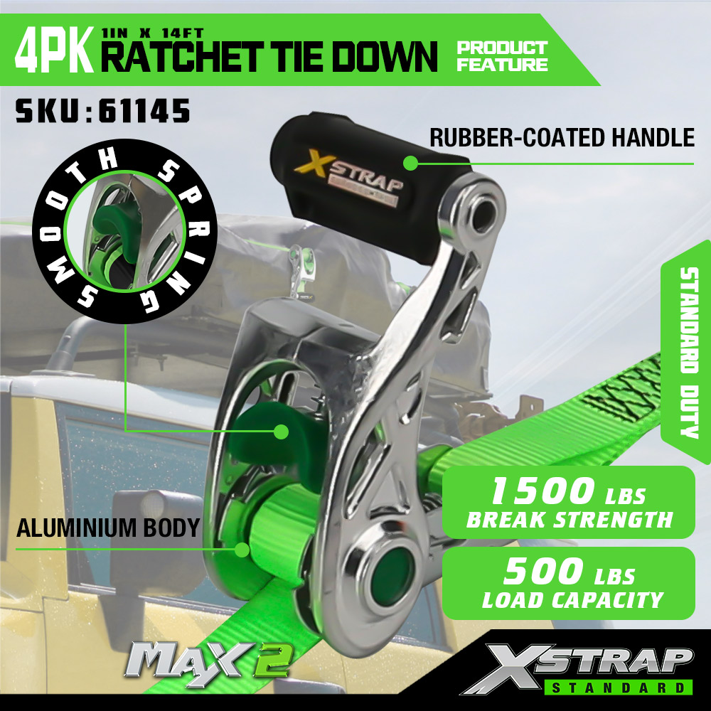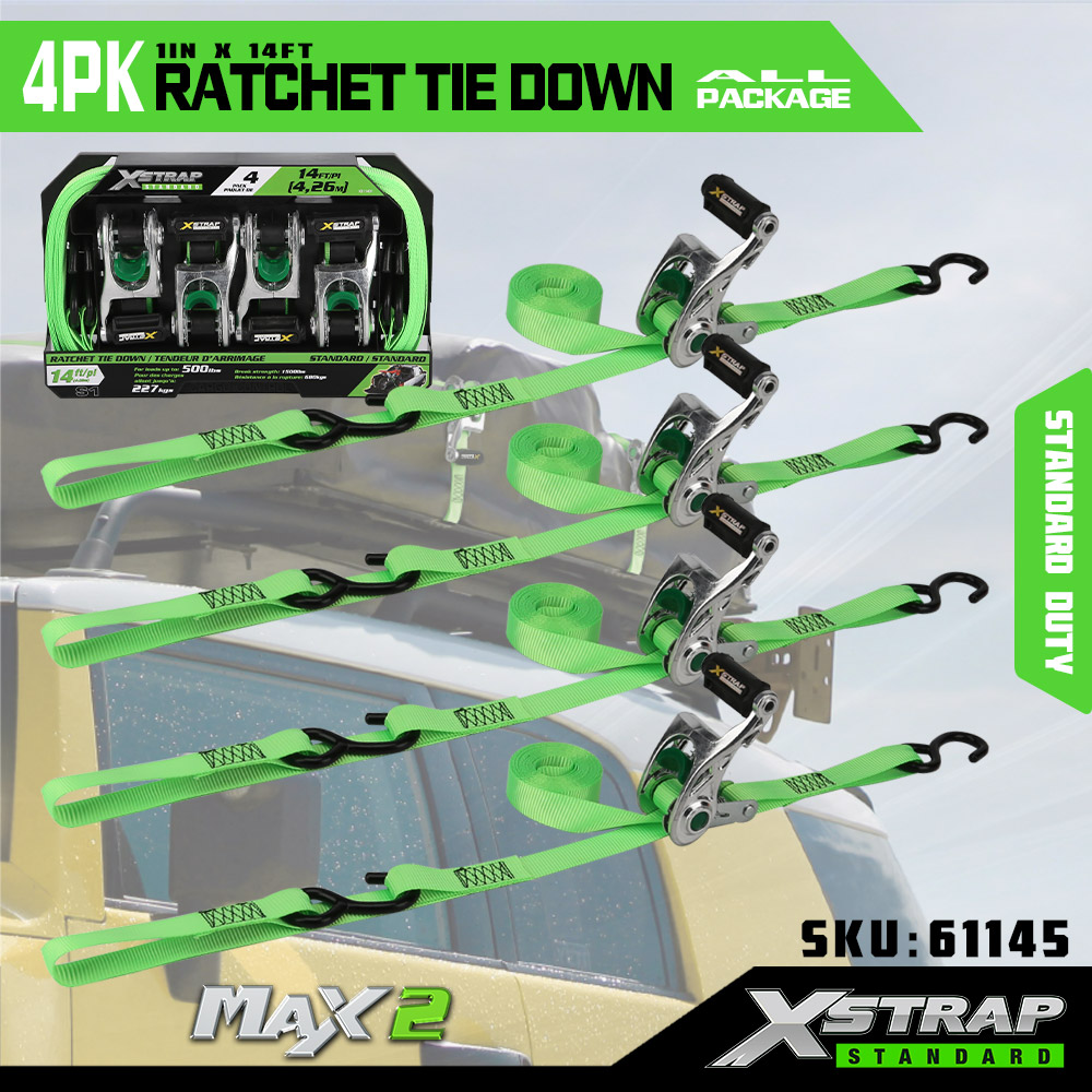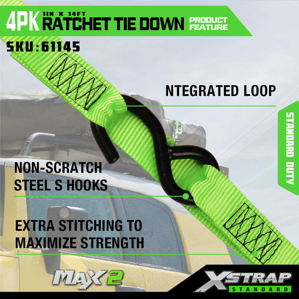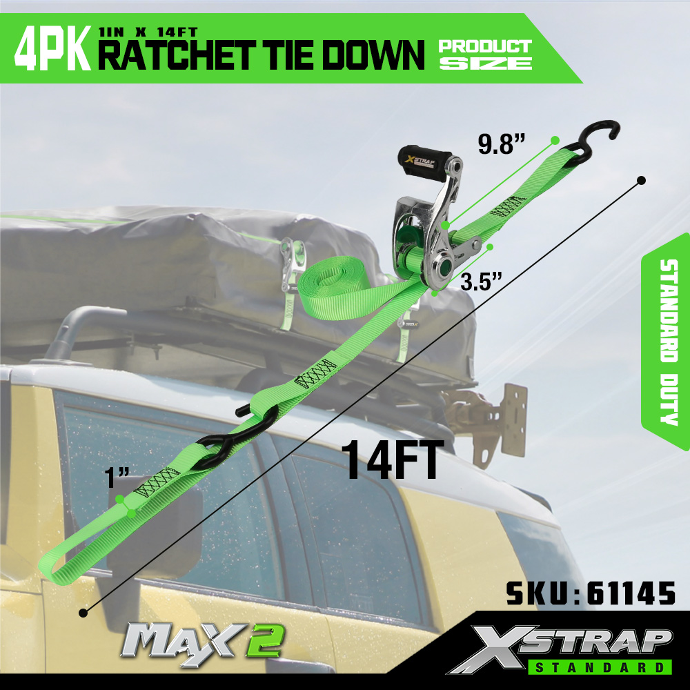Xstrap 4 Pack Ratchet Tie Down dengan Soft Loop, 1” x 14' Polyester Tie Down Strap Pull Ratchet Strap, Tali Pengaman Kargo Kapasitas 1000lbs dengan Kait S untuk Truk, SUV, Rak Atas Mobil Sepeda Motor.