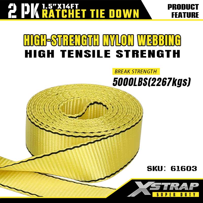 - Anyaman Nilon Tarik Tinggi (Kekuatan Patah 5000LBS): Dibuat dengan tali nilon kuning berkekuatan tinggi (lebar 1,5") — memberikan kekuatan tarik yang luar biasa (beban putus 5000LBS) dan ketahanan terhadap abrasi, ideal untuk pengangkutan tugas berat atau tugas pengikatan industri.l